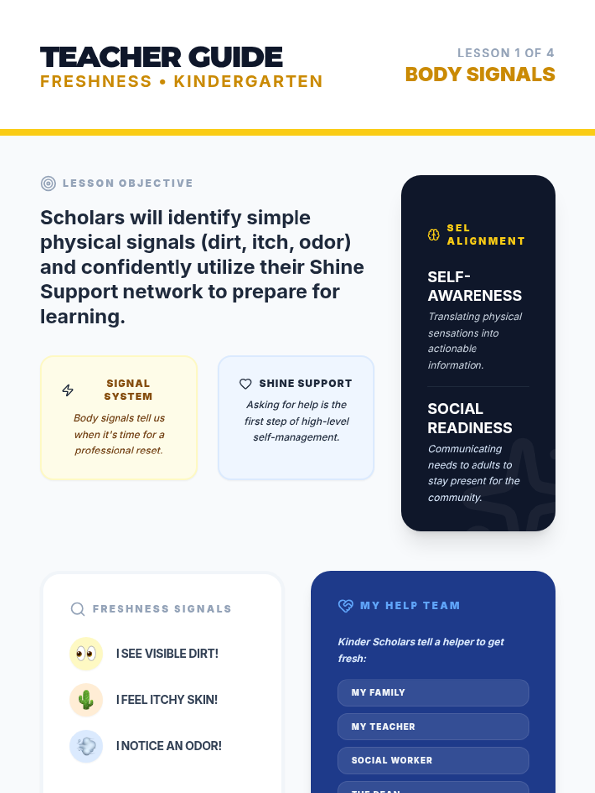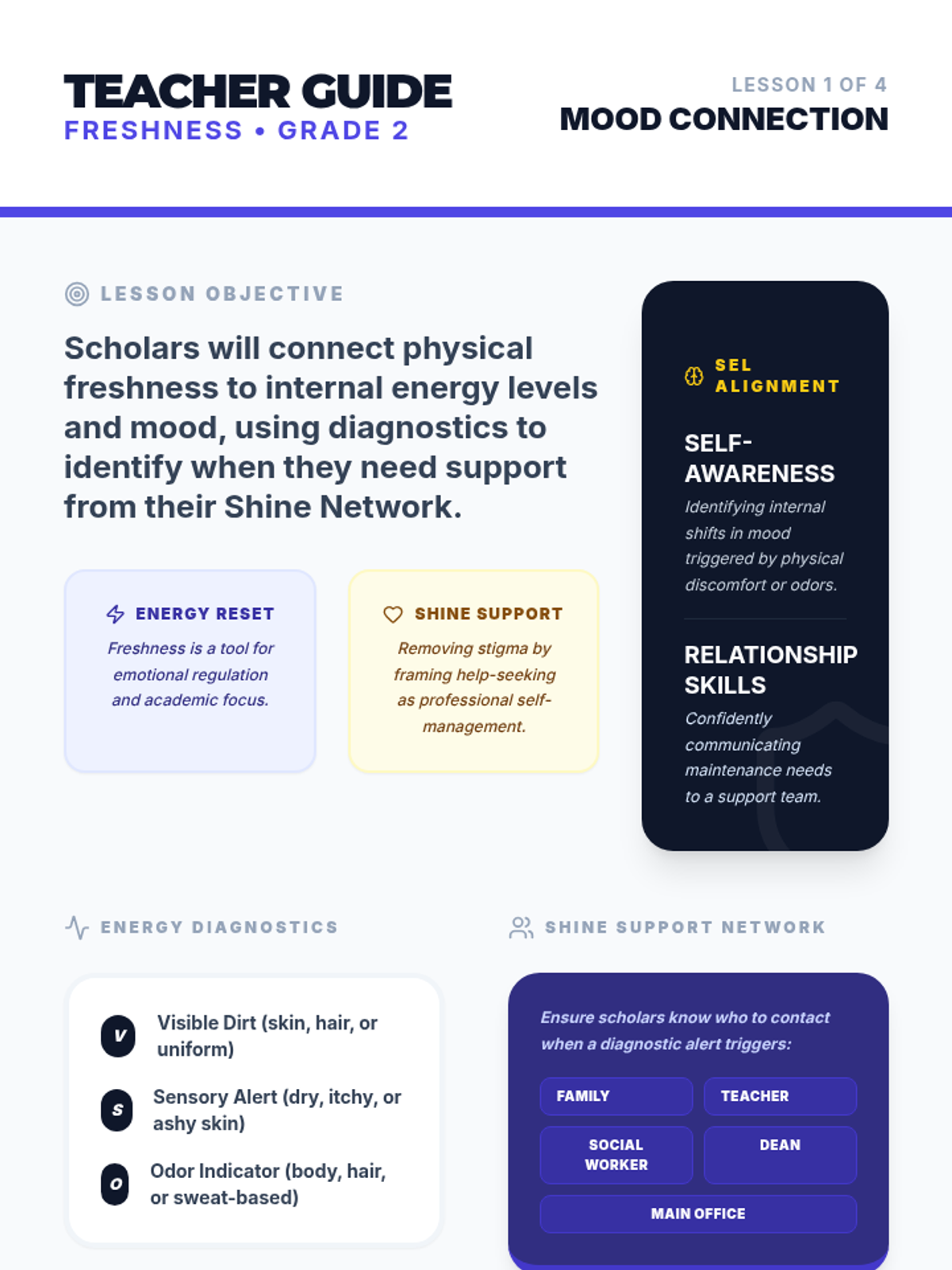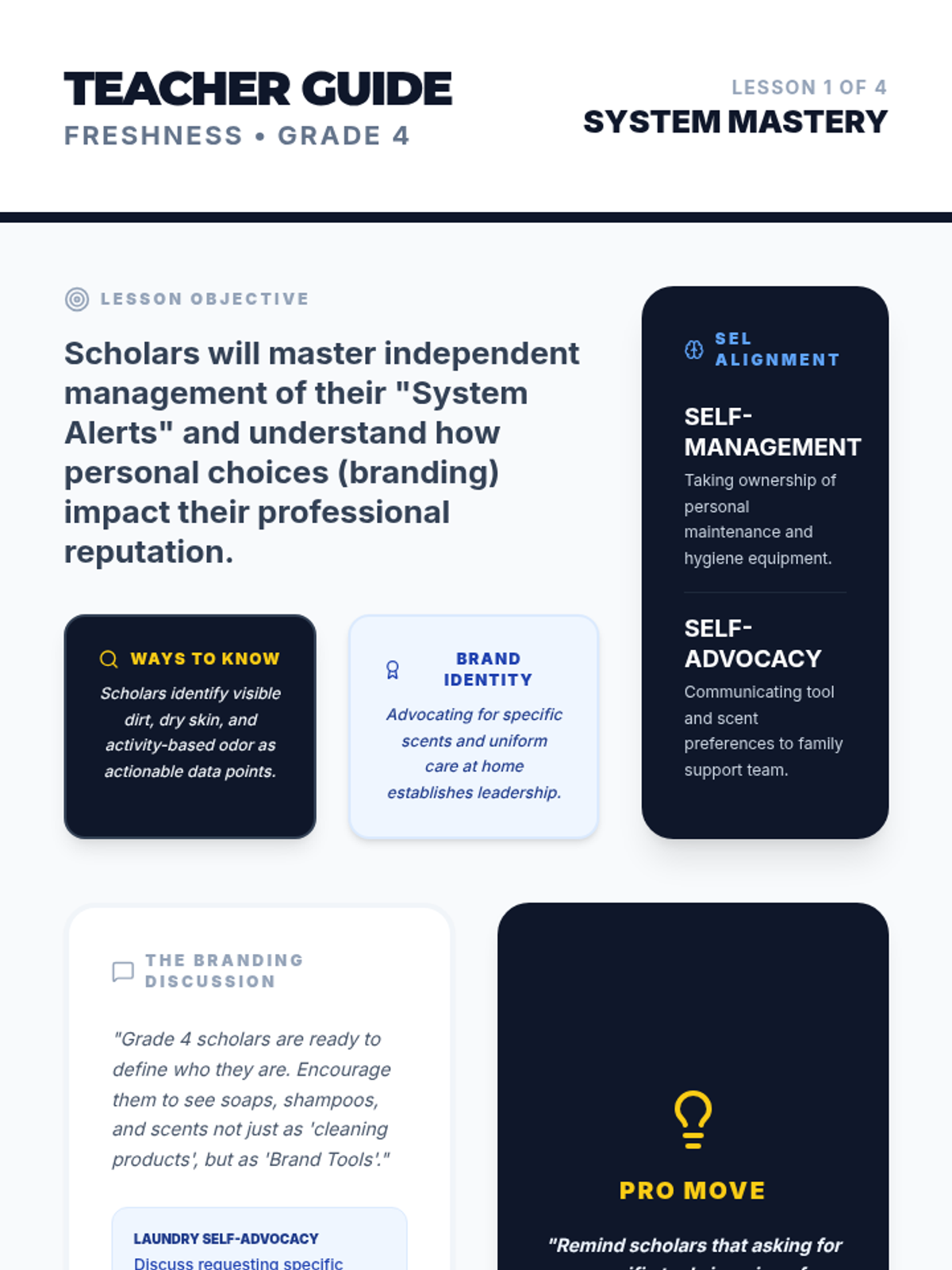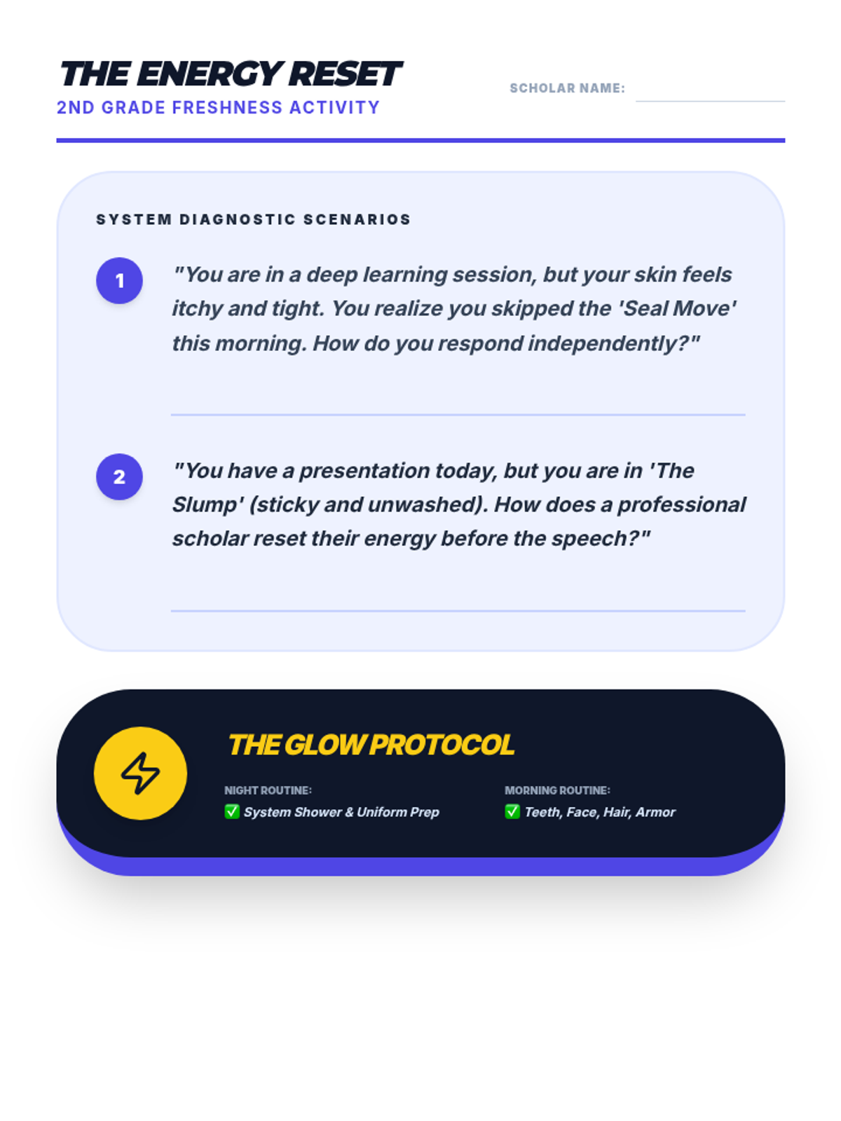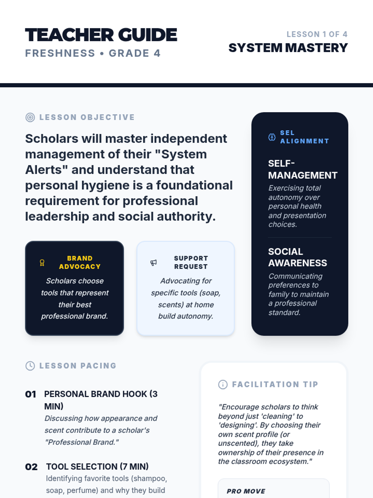 A comprehensive SEL-integrated hygiene curriculum for elementary scholars (K-4), focusing on self-awareness, social impact, and personal responsibility through the lens of a 'Glow Up'.