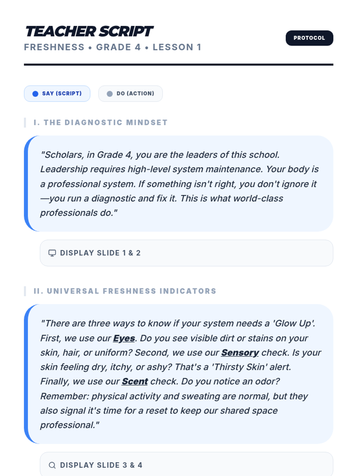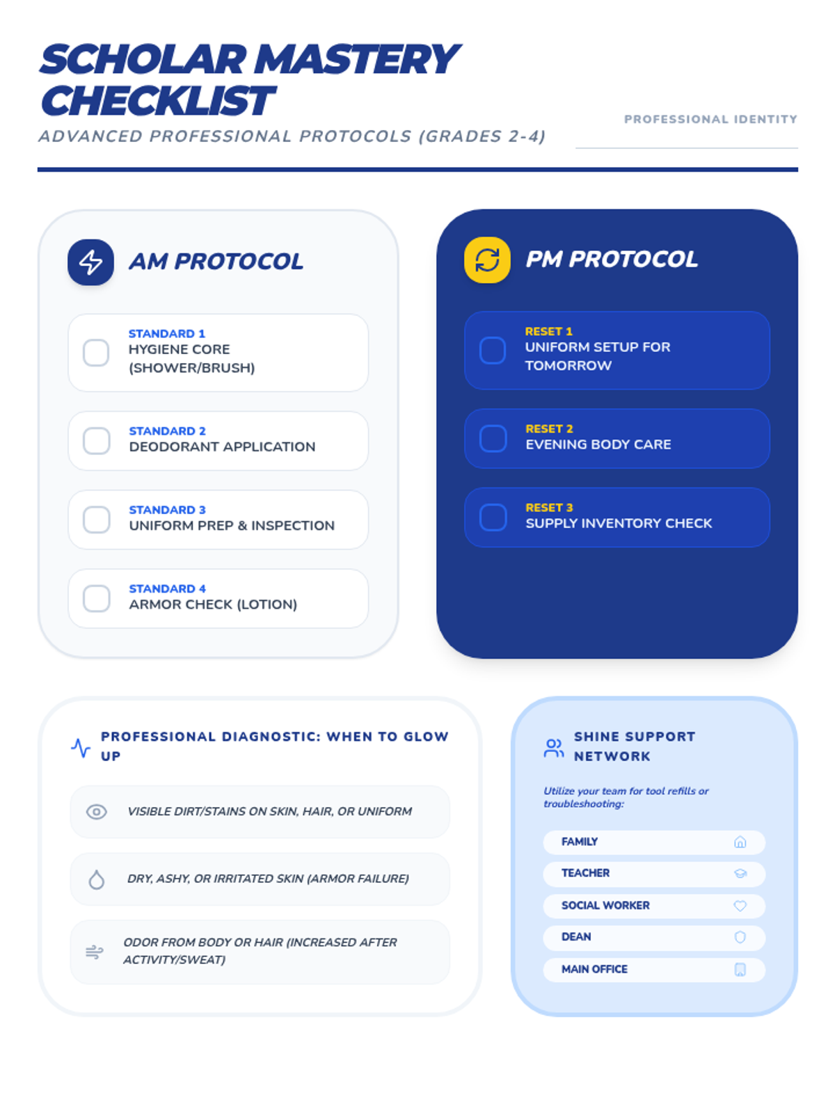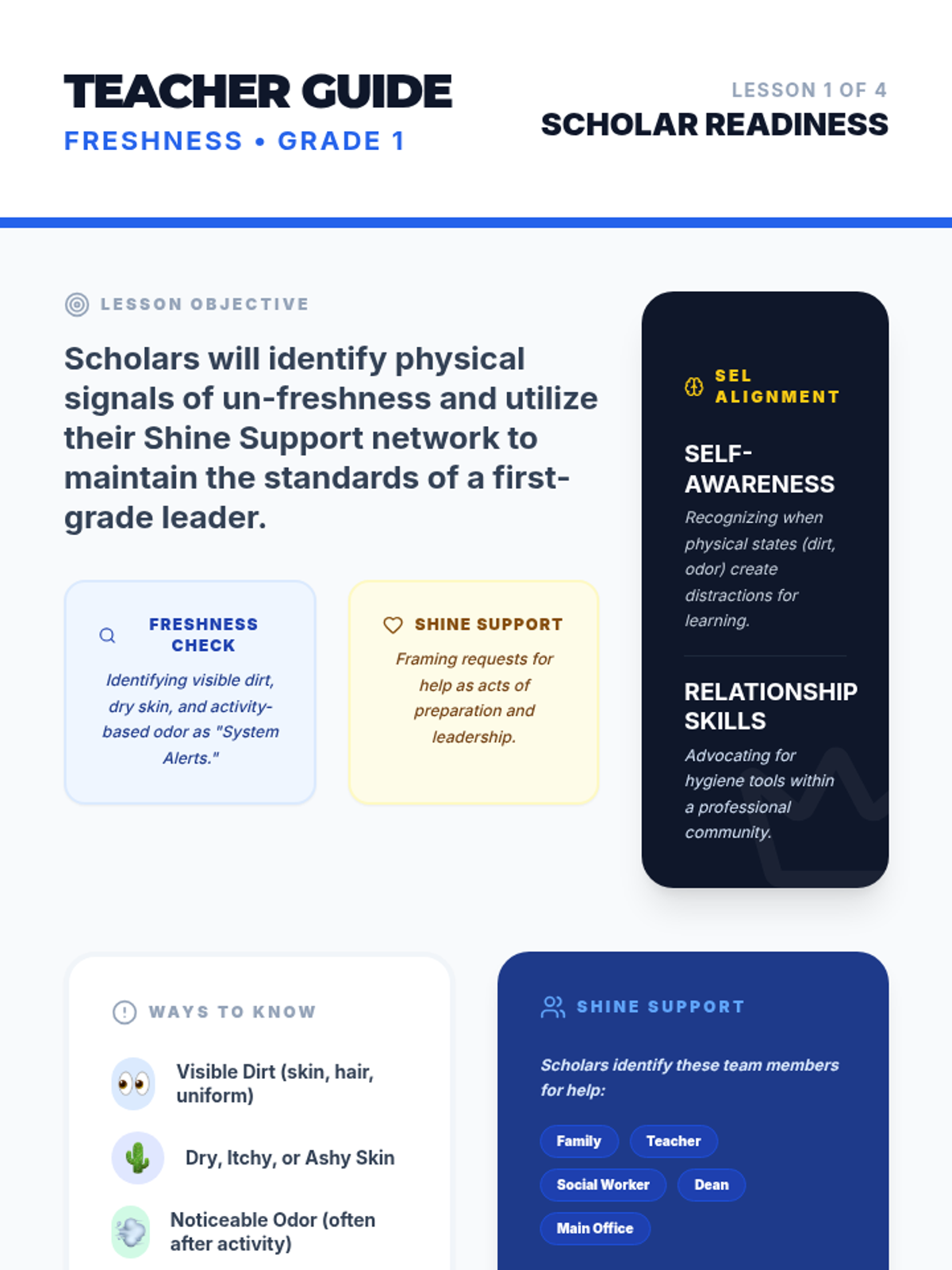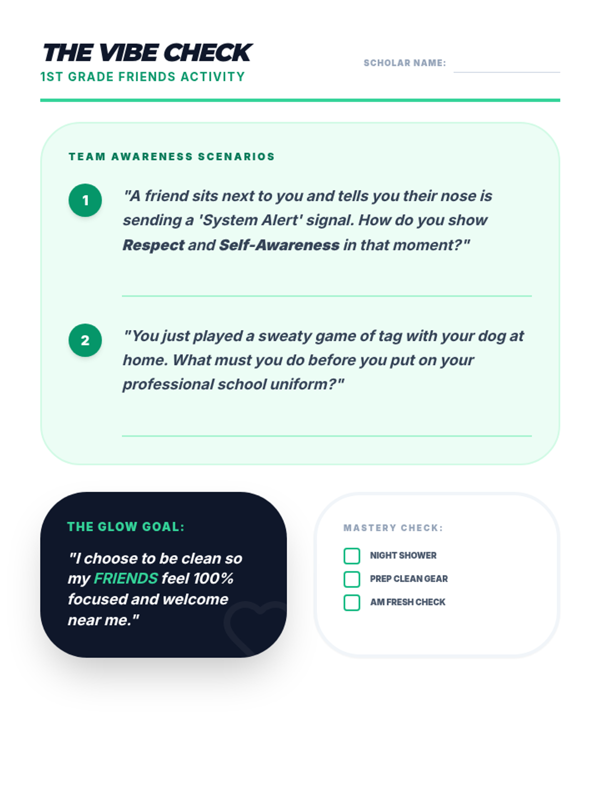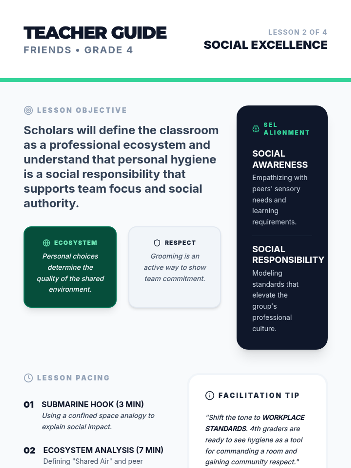 A comprehensive SEL-integrated hygiene curriculum for elementary scholars (K-4), focusing on self-awareness, social impact, and personal responsibility through the lens of a 'Glow Up'.