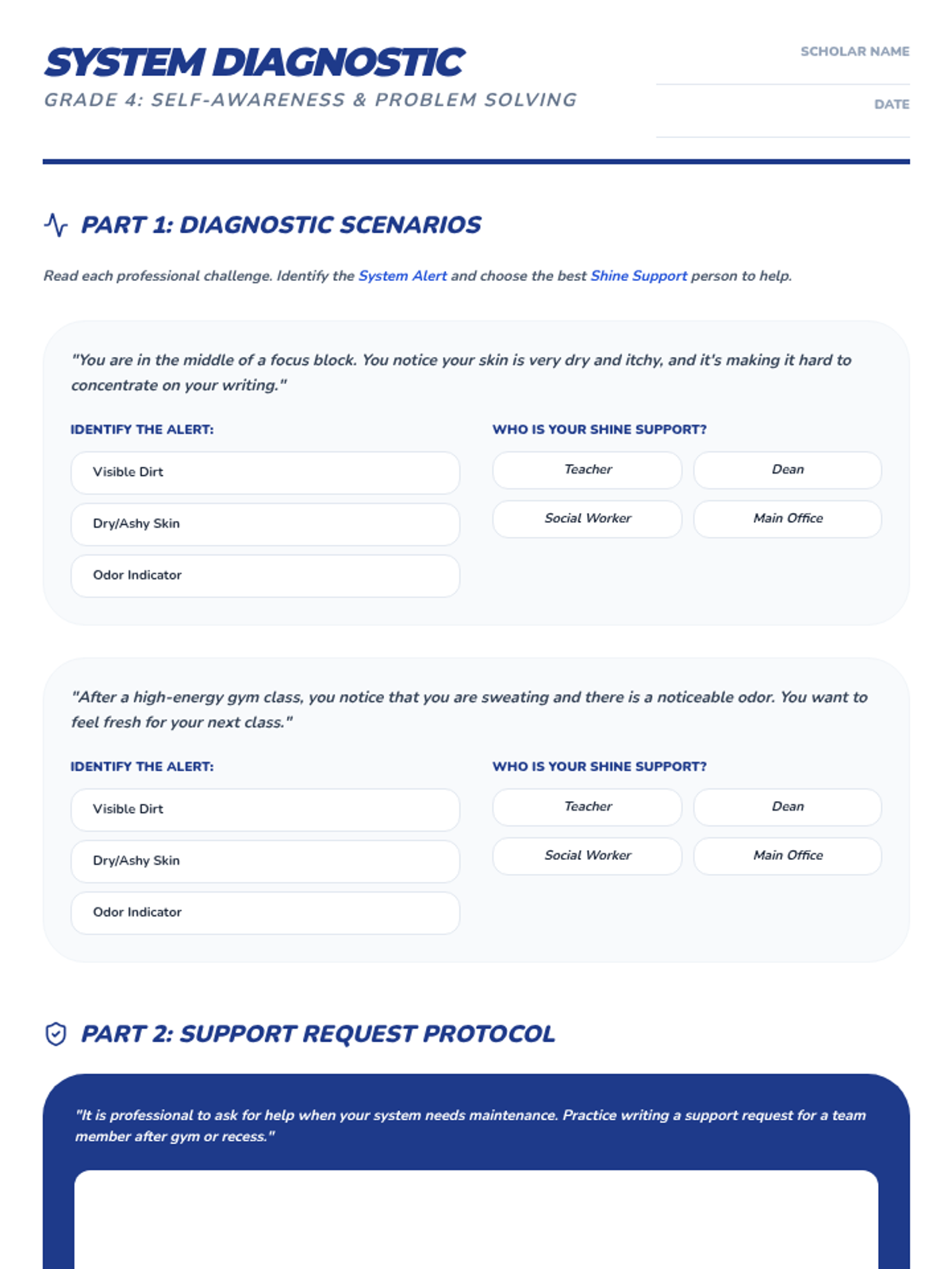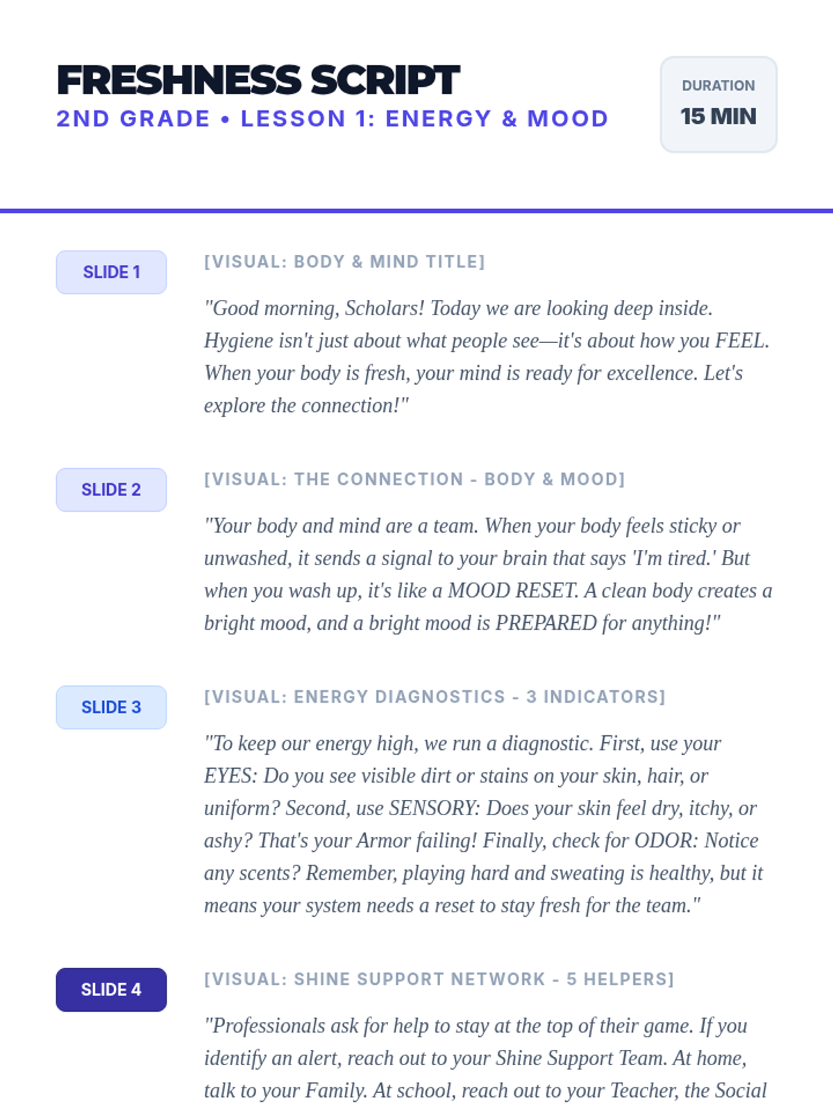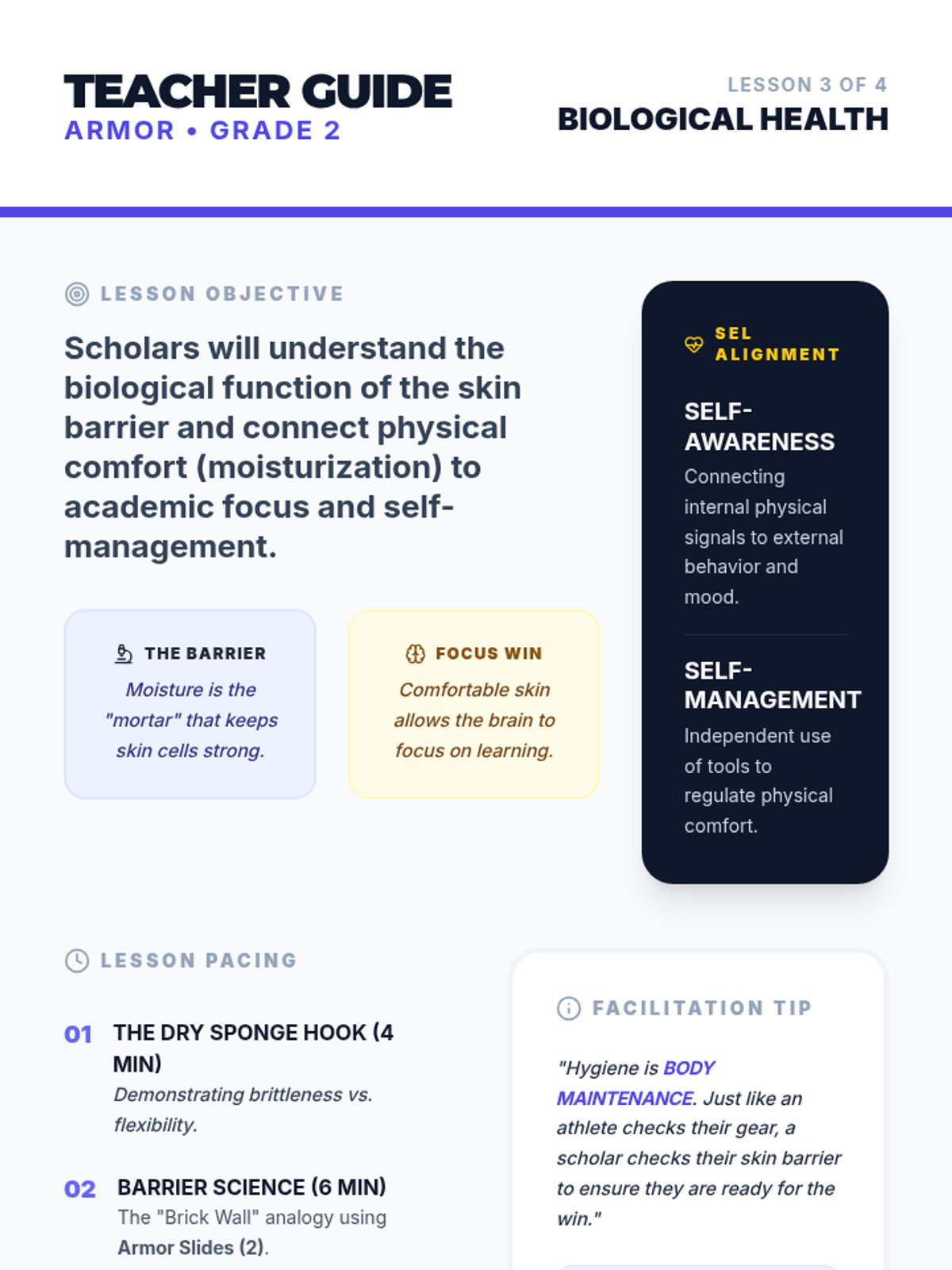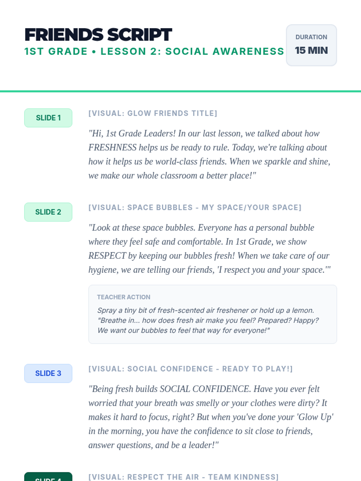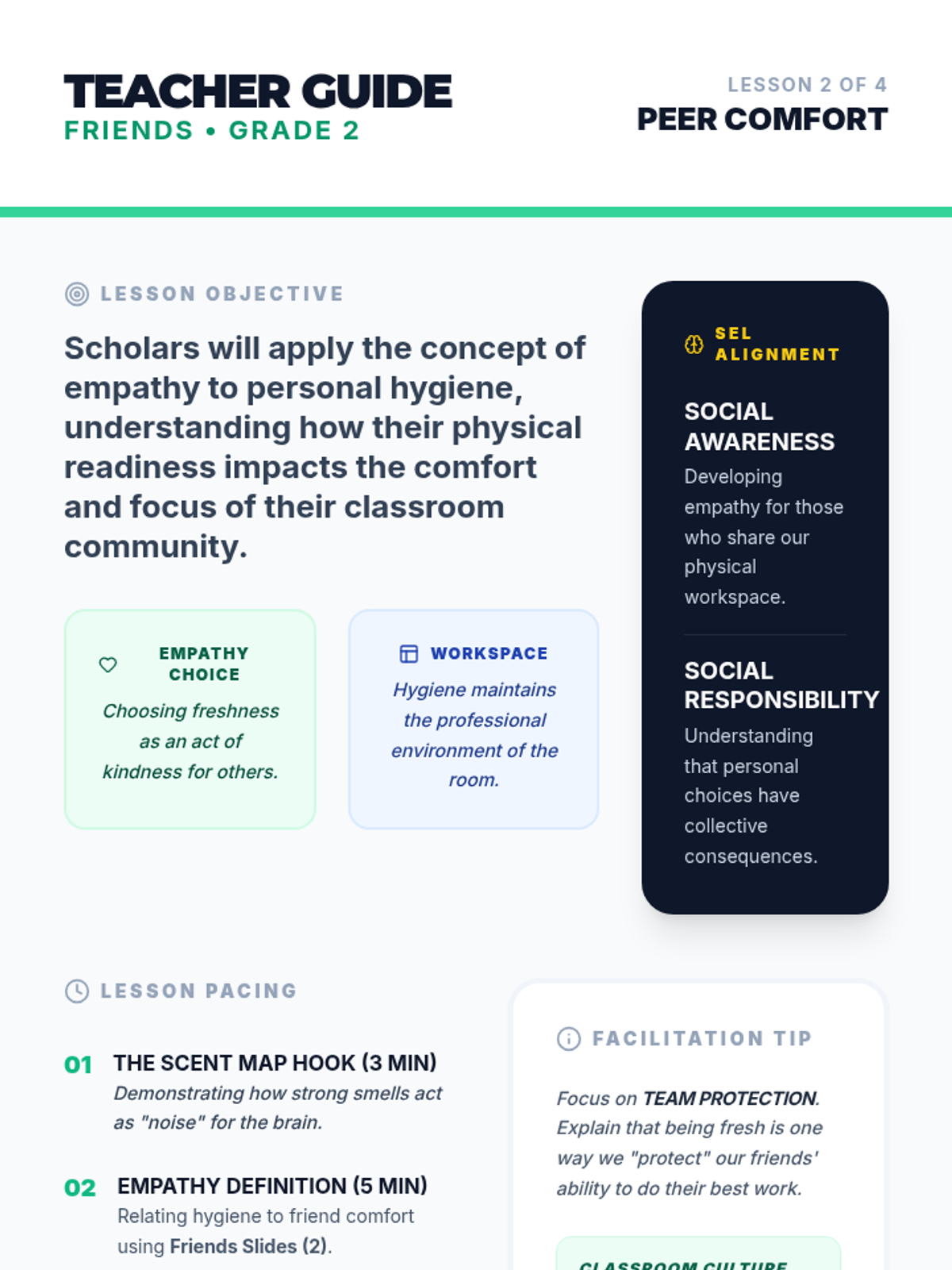 A comprehensive SEL-integrated hygiene curriculum for elementary scholars (K-4), focusing on self-awareness, social impact, and personal responsibility through the lens of a 'Glow Up'.