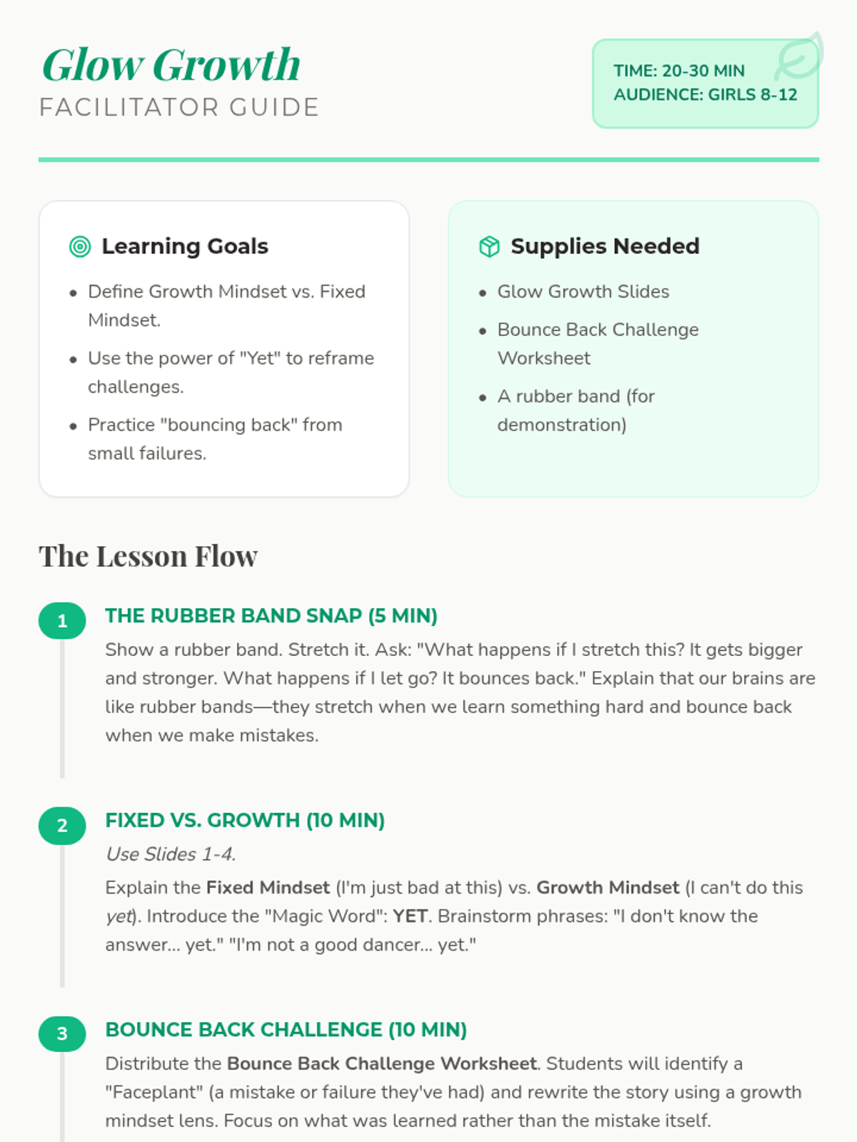 A series of empowering lessons designed to build self-esteem, positive self-talk, and internal motivation in girls through creative activities and reflection.