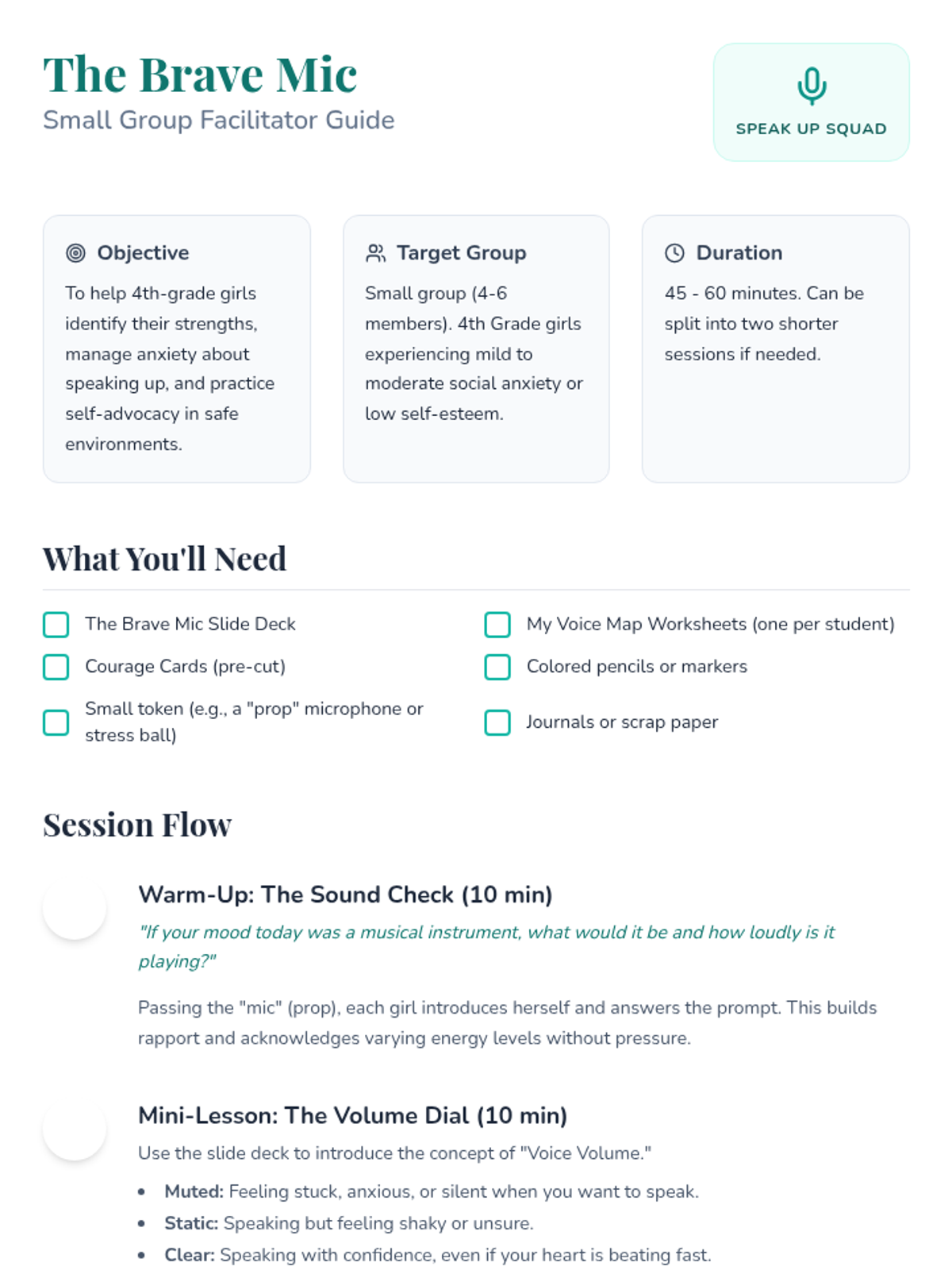 A series of resources focused on empowering young girls to manage anxiety and boost self-esteem through self-expression and advocacy.