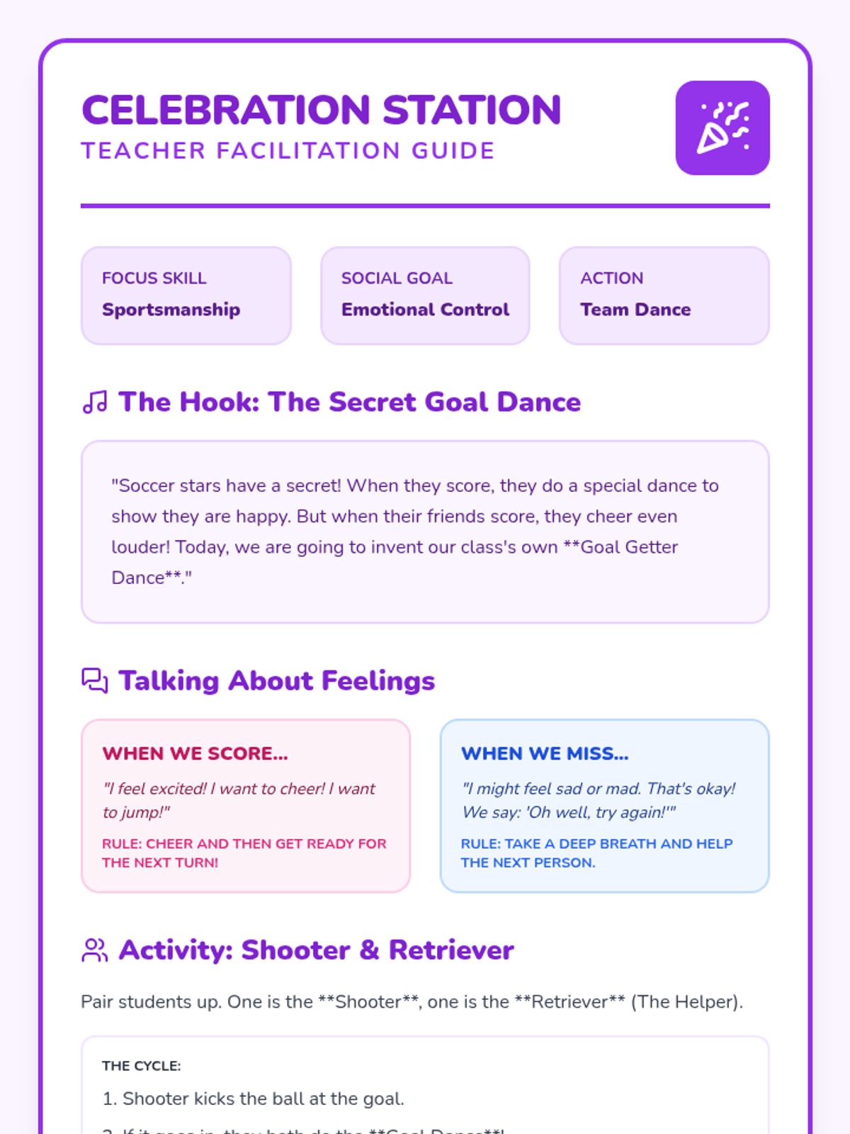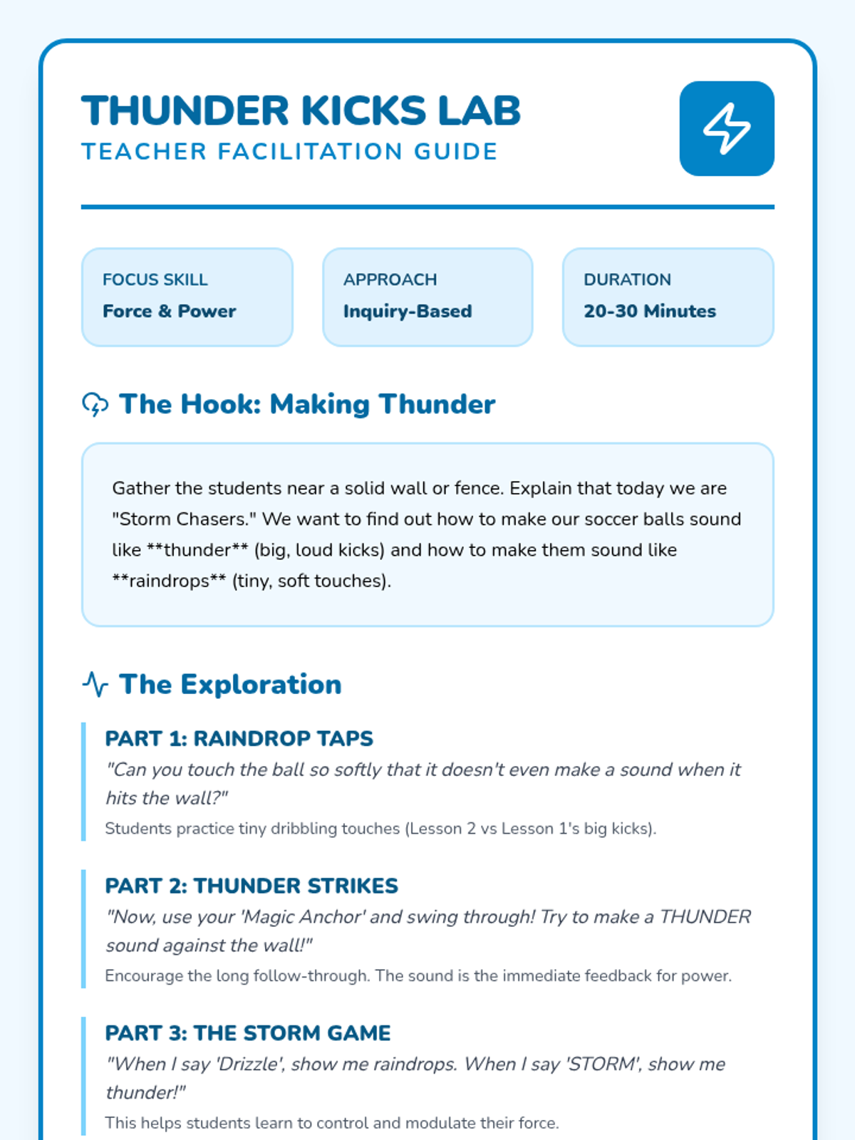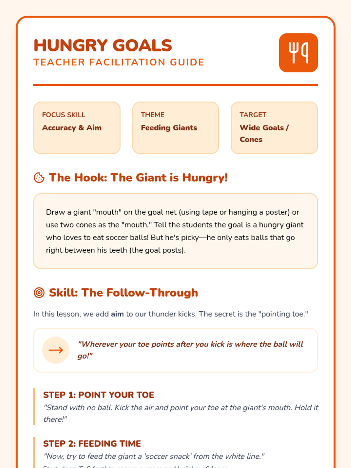 A fun, active sequence for Pre-K students focused on the fundamentals of kicking a soccer ball, from foot placement to target accuracy and sportsmanship.