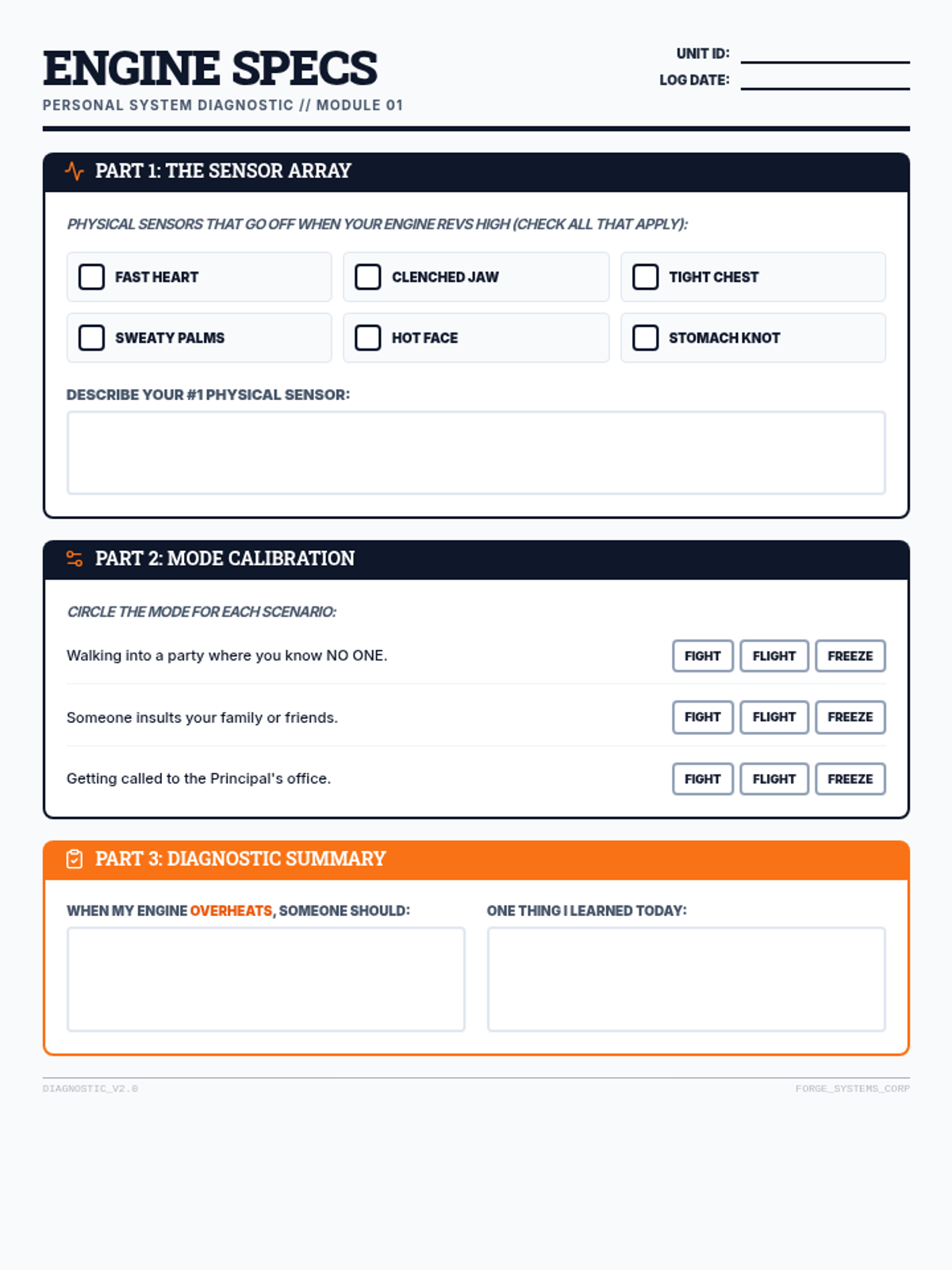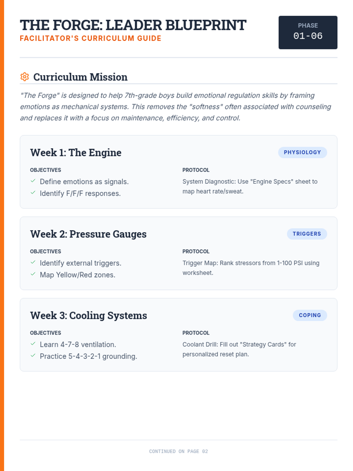 A 6-week emotional regulation curriculum designed specifically for middle school boys, using an industrial/engineering theme to explore physiology, triggers, and coping strategies.