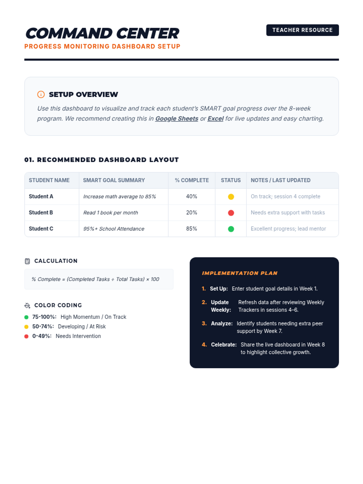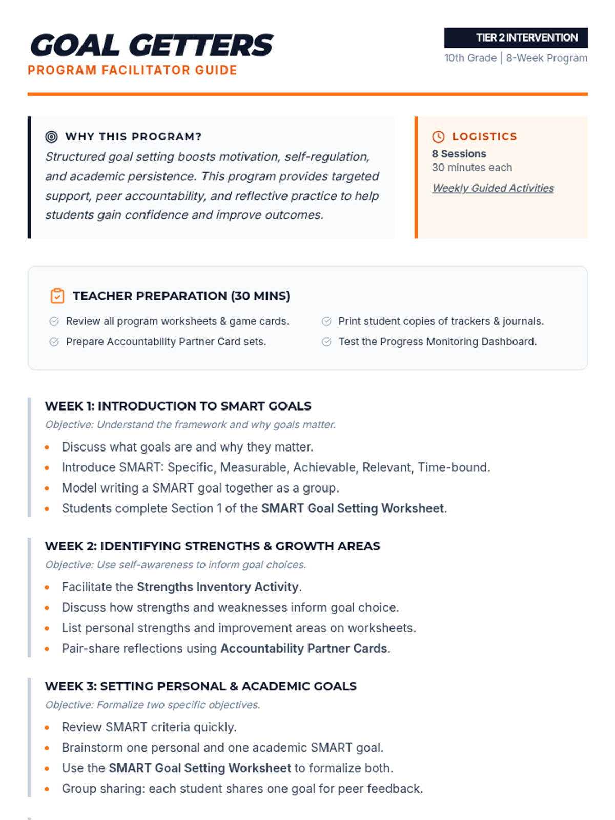 An 8-week Tier 2 small-group program for 10th grade boys focused on academic and personal goal achievement through the SMART framework, peer accountability, and self-reflection.