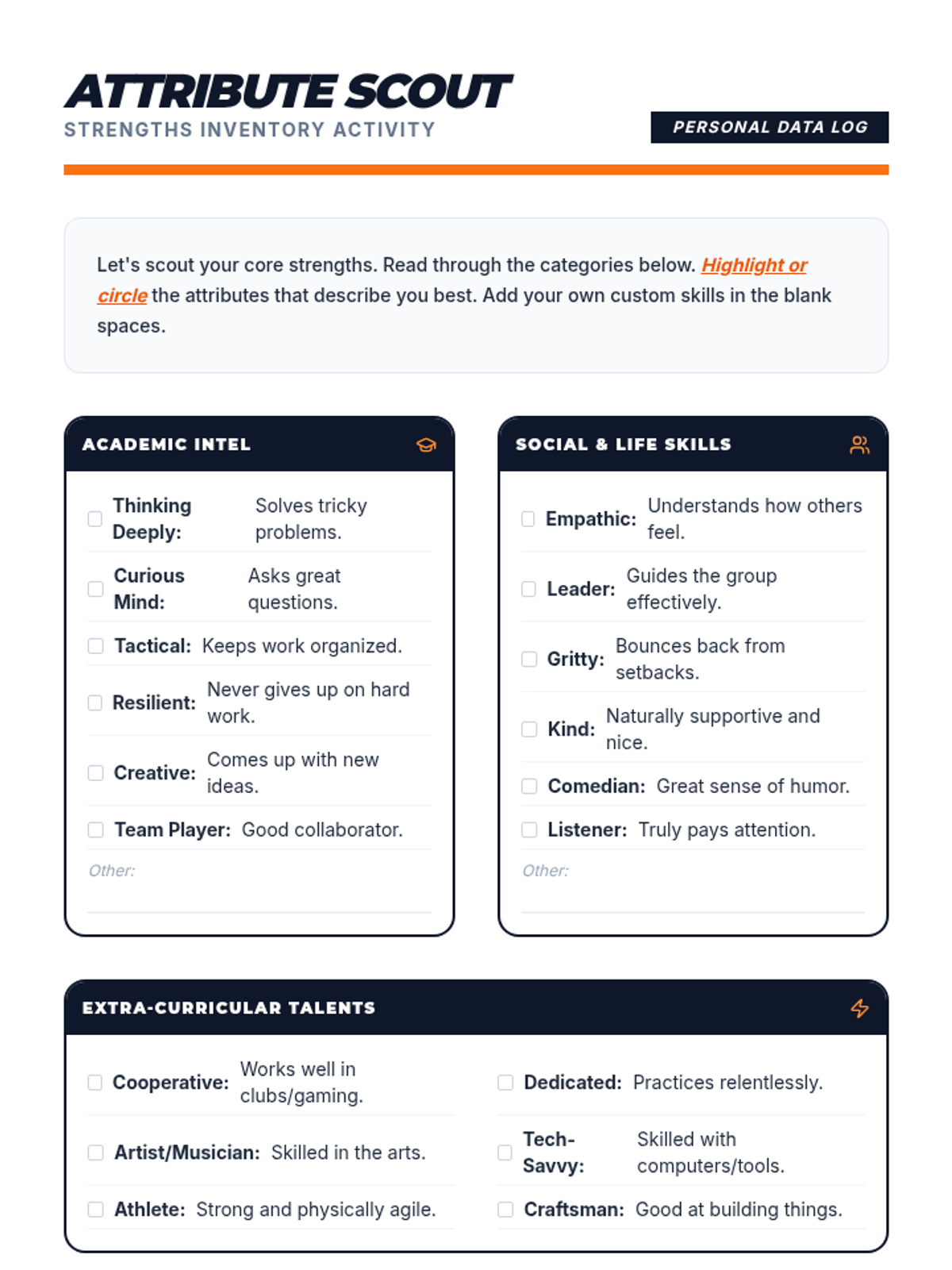 A series of three interactive counseling sessions for middle and high school students, focusing on self-discovery, emotional regulation, and future planning. Using a 'Blueprint' aesthetic, students engage in hands-on activities to map out their internal identities, manage external stressors, and construct actionable goals.