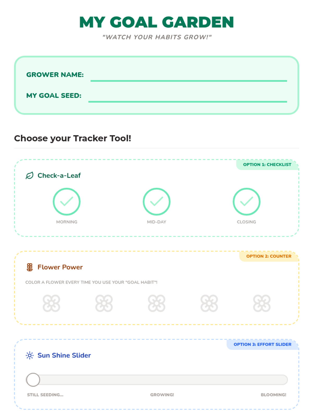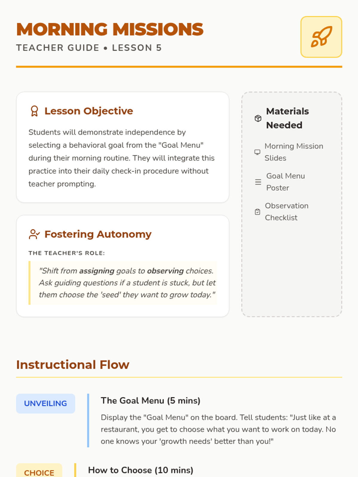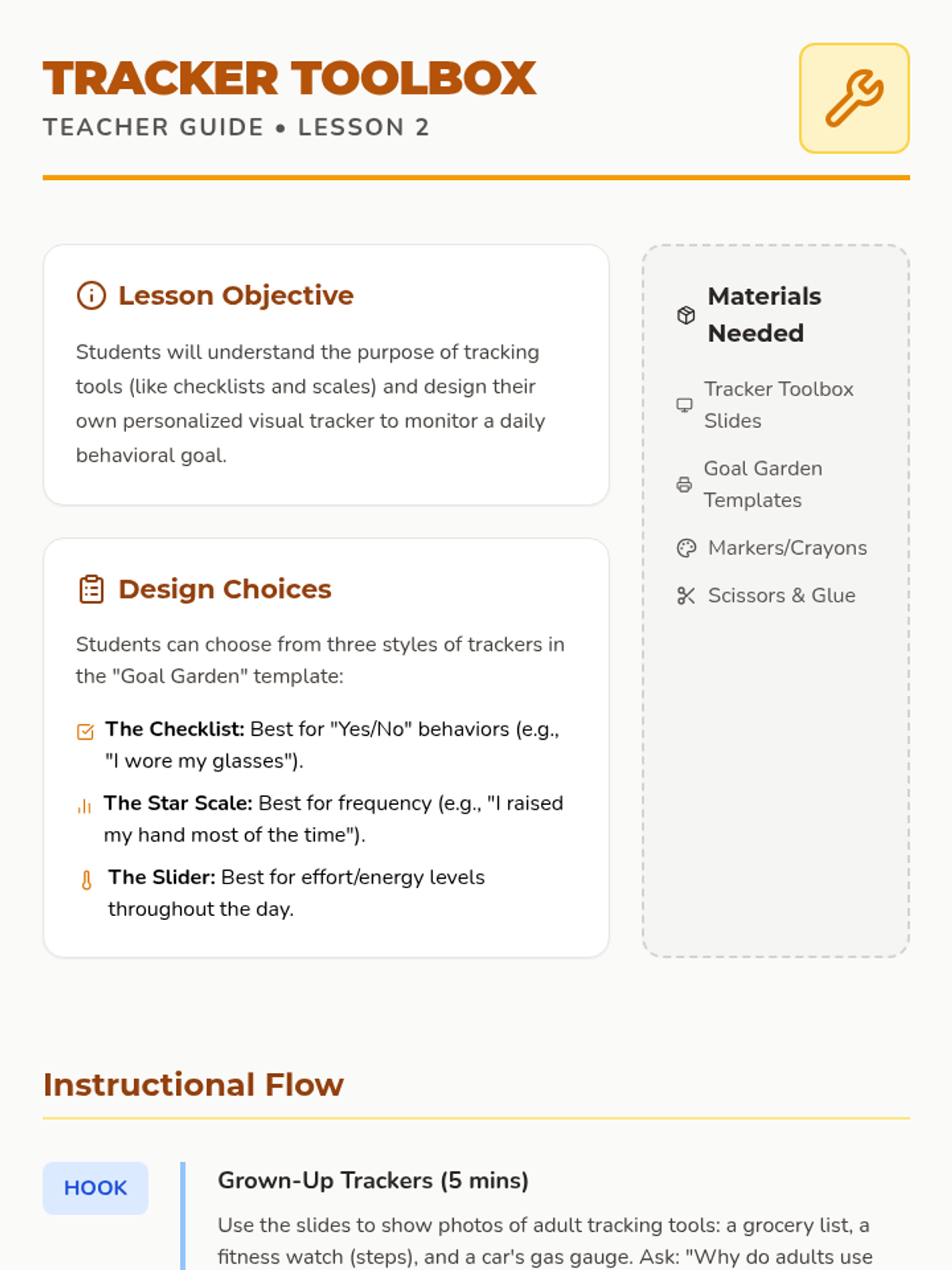 A comprehensive sequence for 2nd-grade students to transition from emotional check-ins to actionable behavioral goal setting. Students learn to set reachable goals, design personal tracking tools, and perform mid-day and end-of-day reflections to build autonomy and resilience.