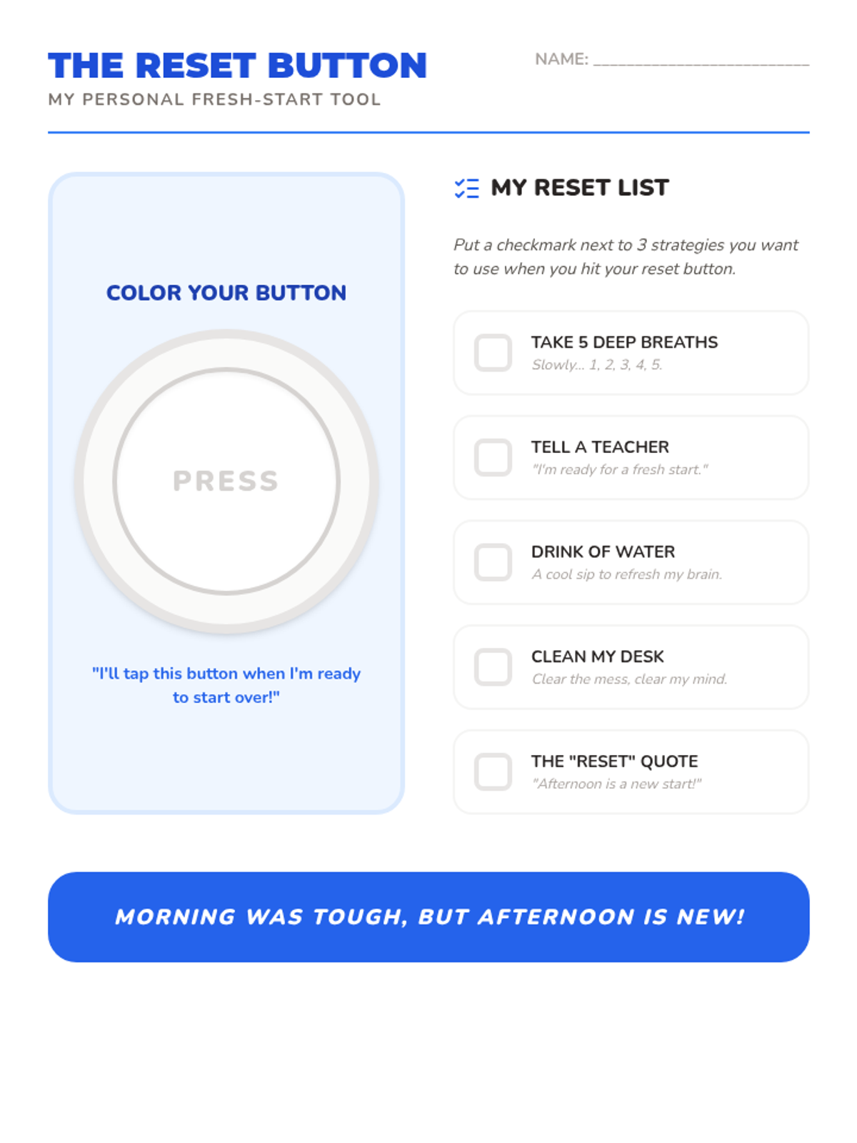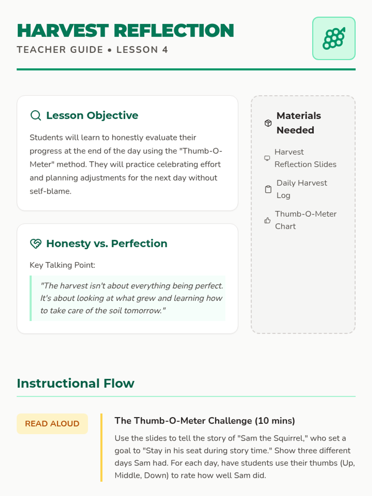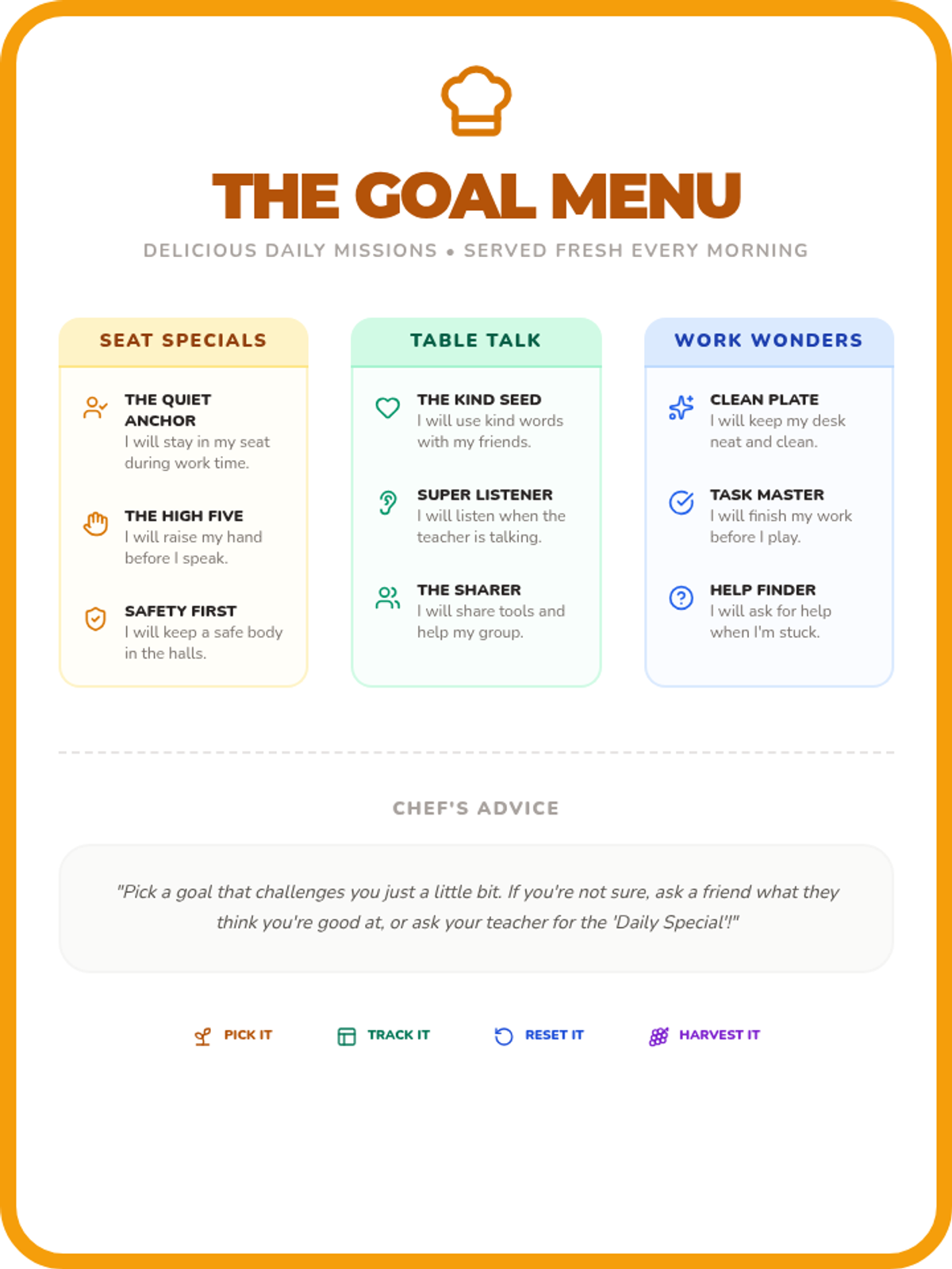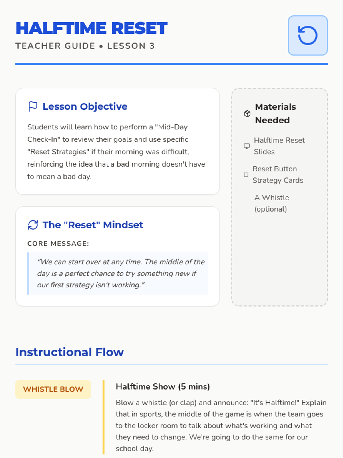 A comprehensive sequence for 2nd-grade students to transition from emotional check-ins to actionable behavioral goal setting. Students learn to set reachable goals, design personal tracking tools, and perform mid-day and end-of-day reflections to build autonomy and resilience.