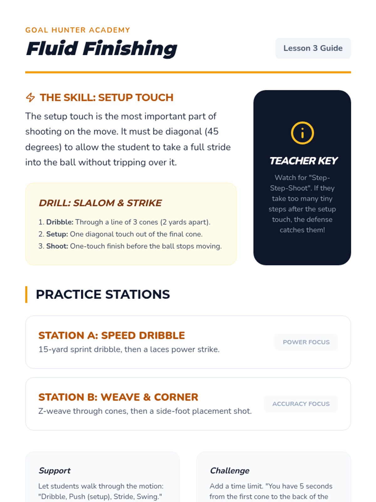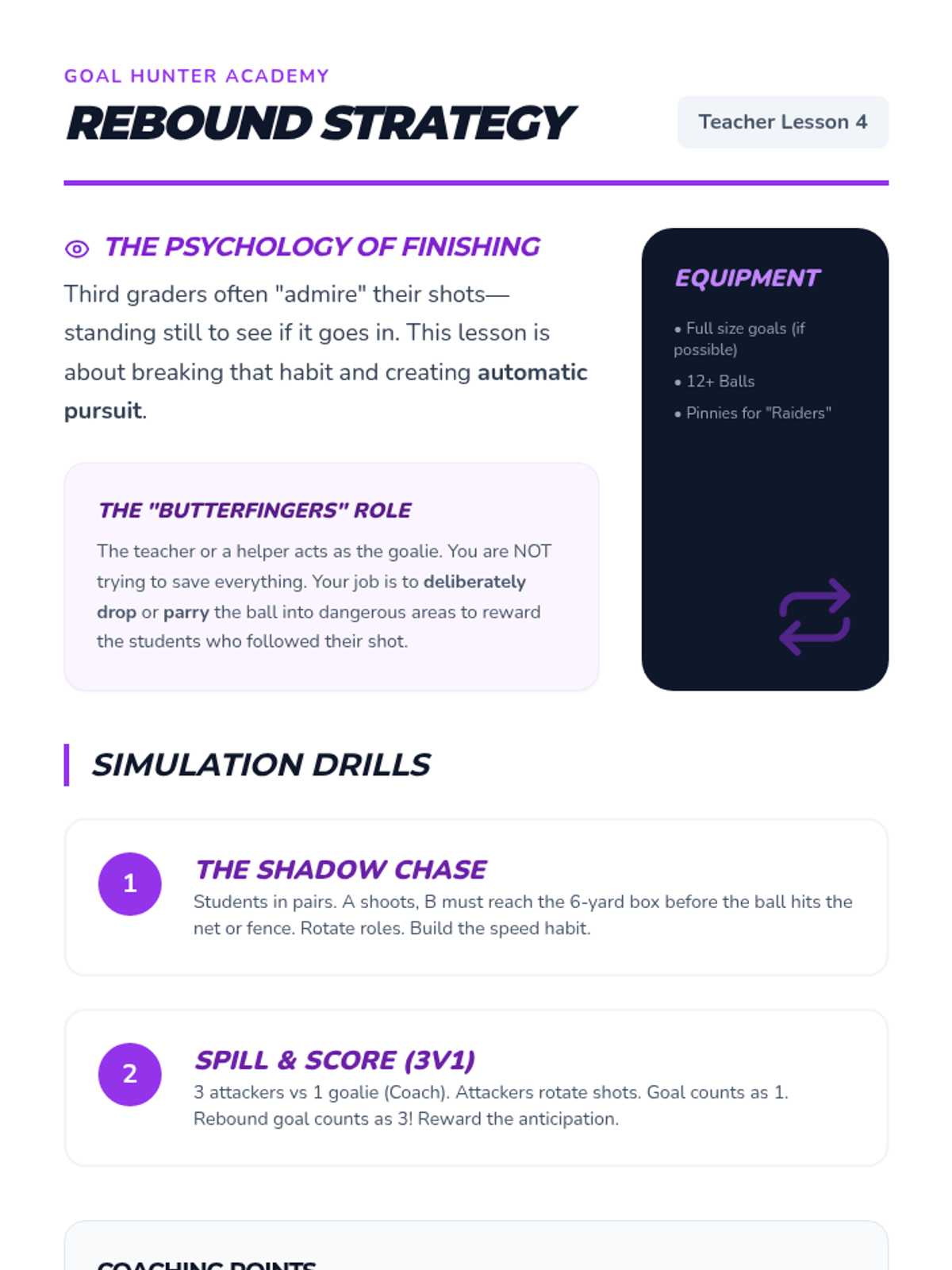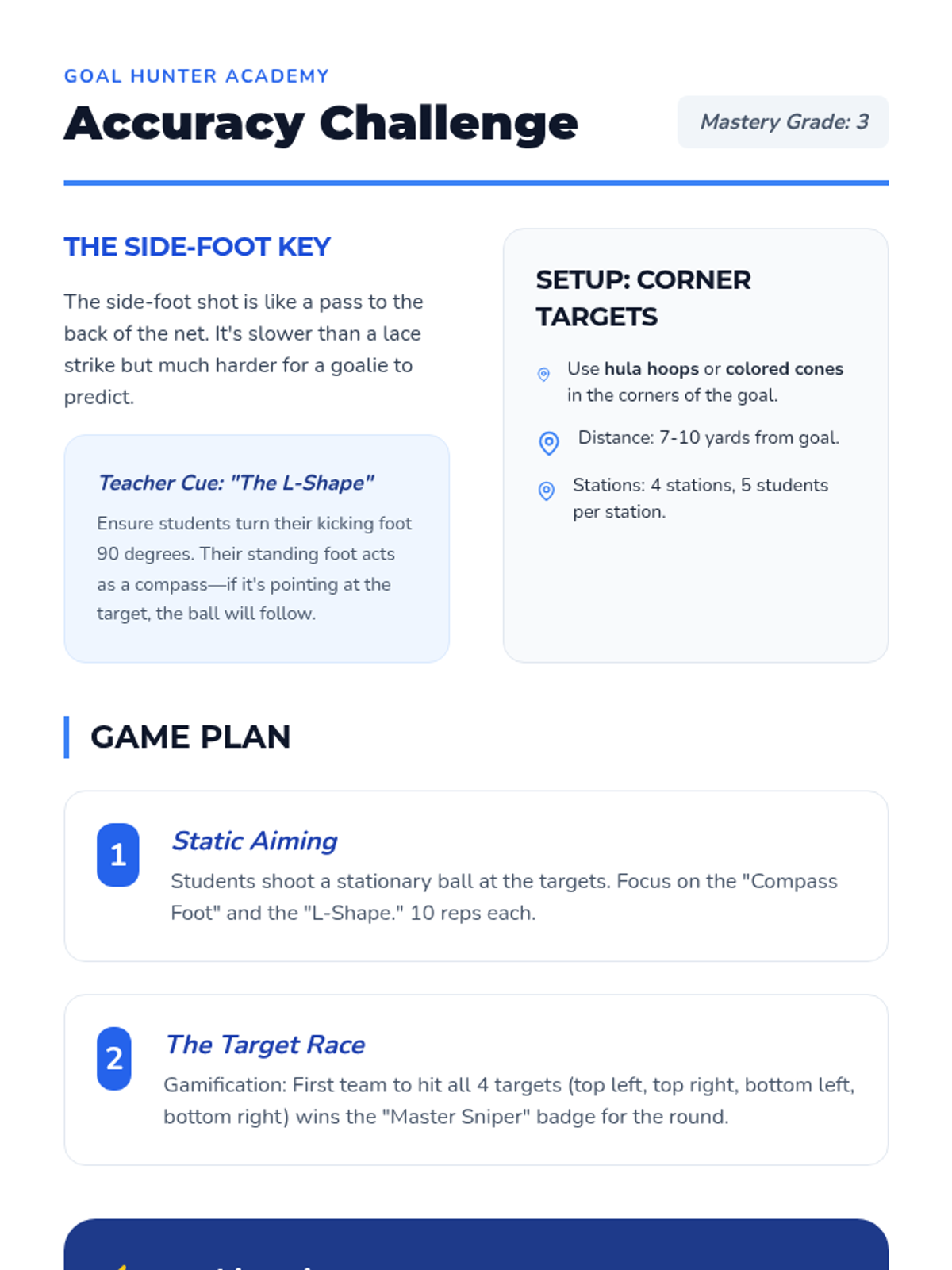 This 3rd-grade sequence, "Goal Hunter Academy," focuses on the mechanics and strategies of shooting in football (soccer). Students progress from basic power striking with the laces to advanced accuracy, shooting while moving, capitalizing on rebounds, and competing in 1v1 finishing scenarios.