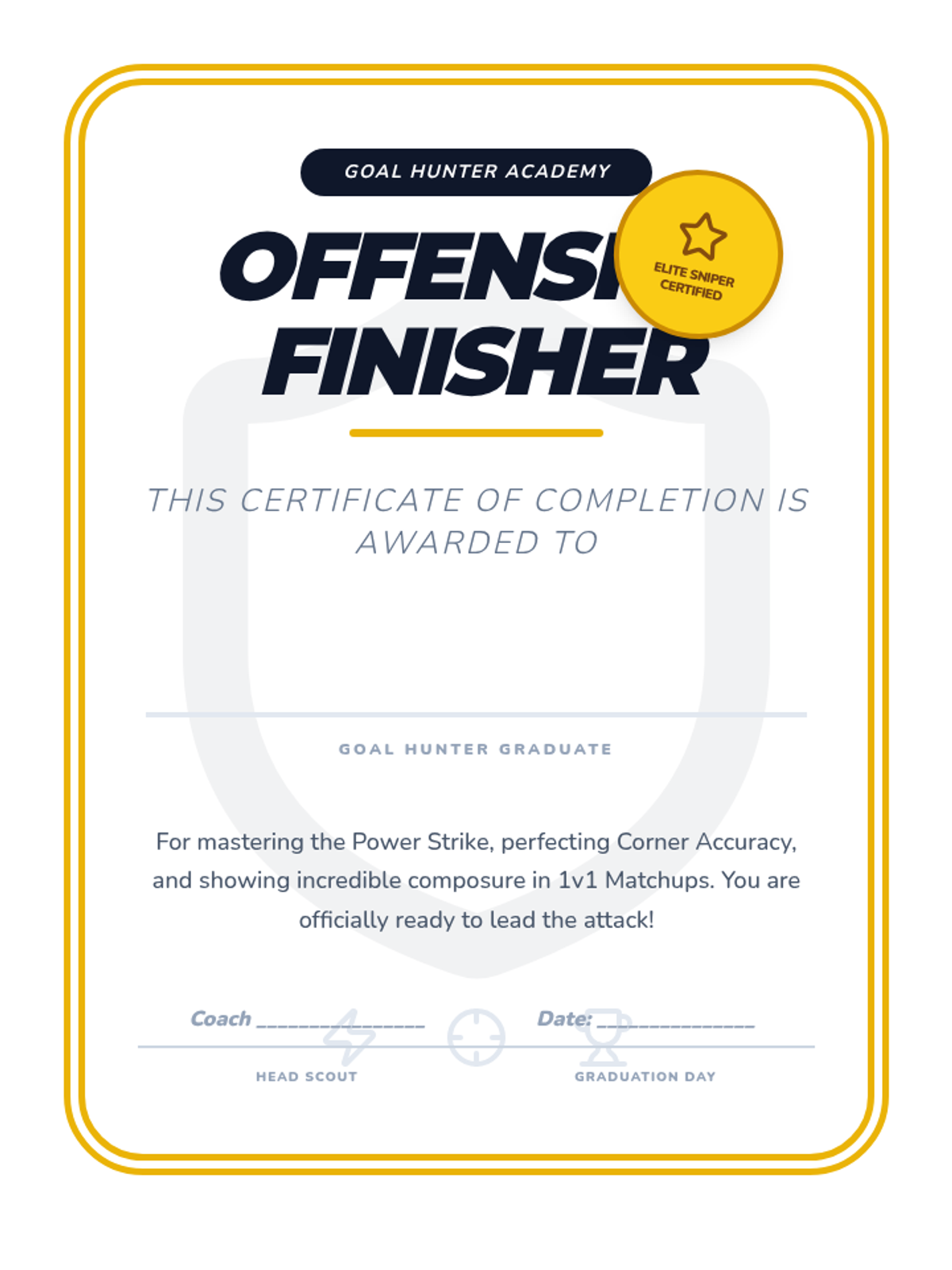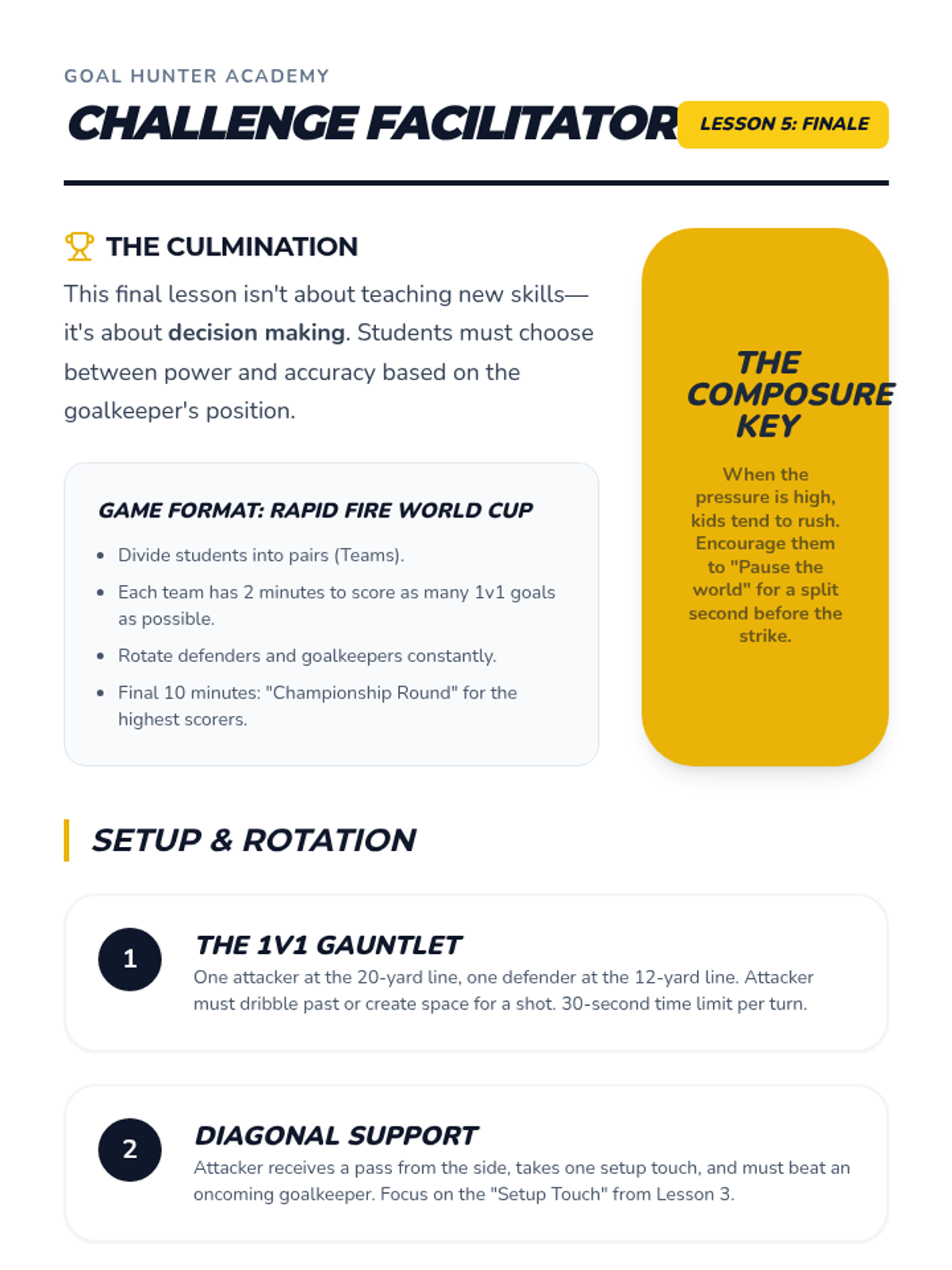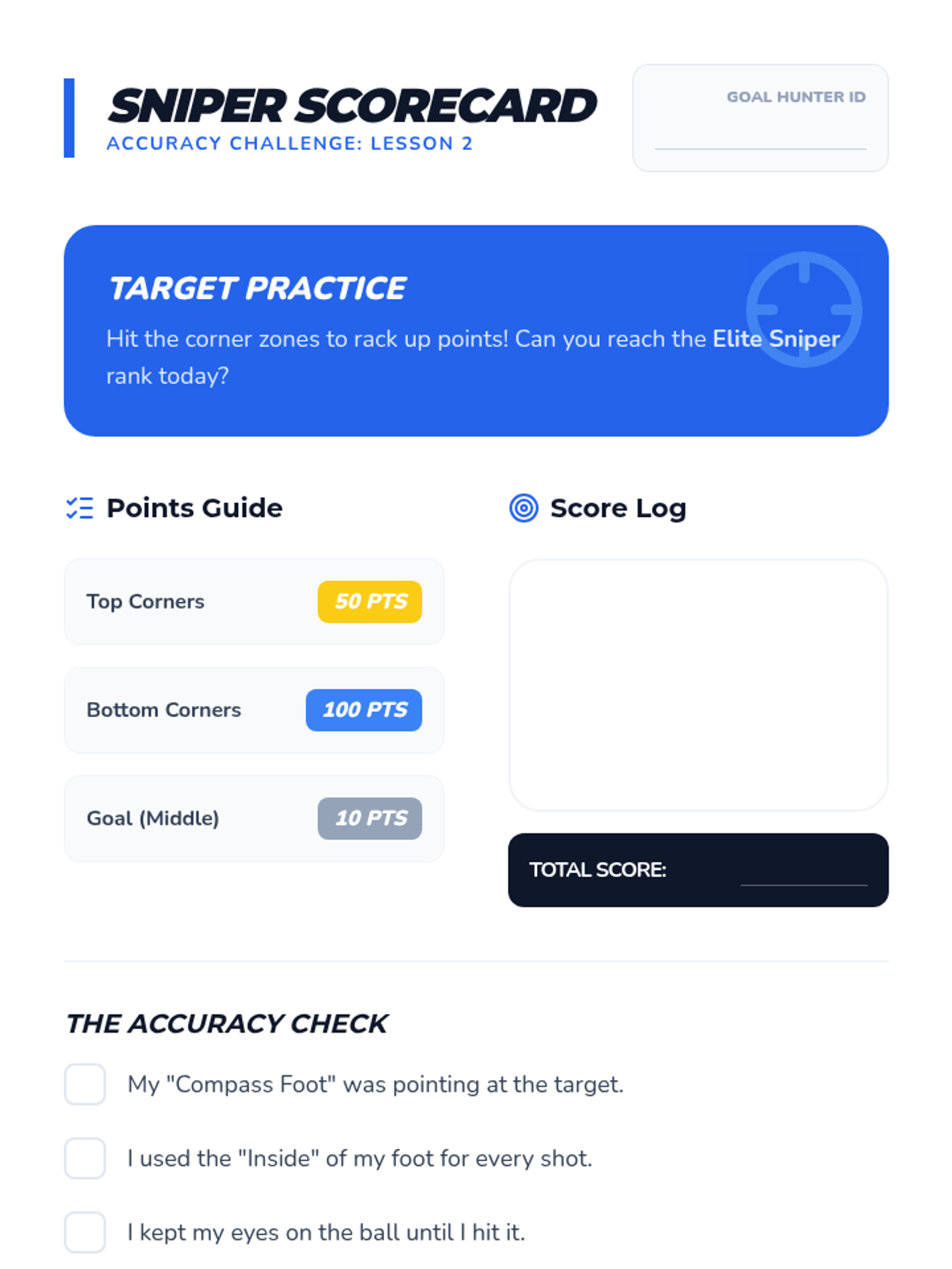 This 3rd-grade sequence, "Goal Hunter Academy," focuses on the mechanics and strategies of shooting in football (soccer). Students progress from basic power striking with the laces to advanced accuracy, shooting while moving, capitalizing on rebounds, and competing in 1v1 finishing scenarios.