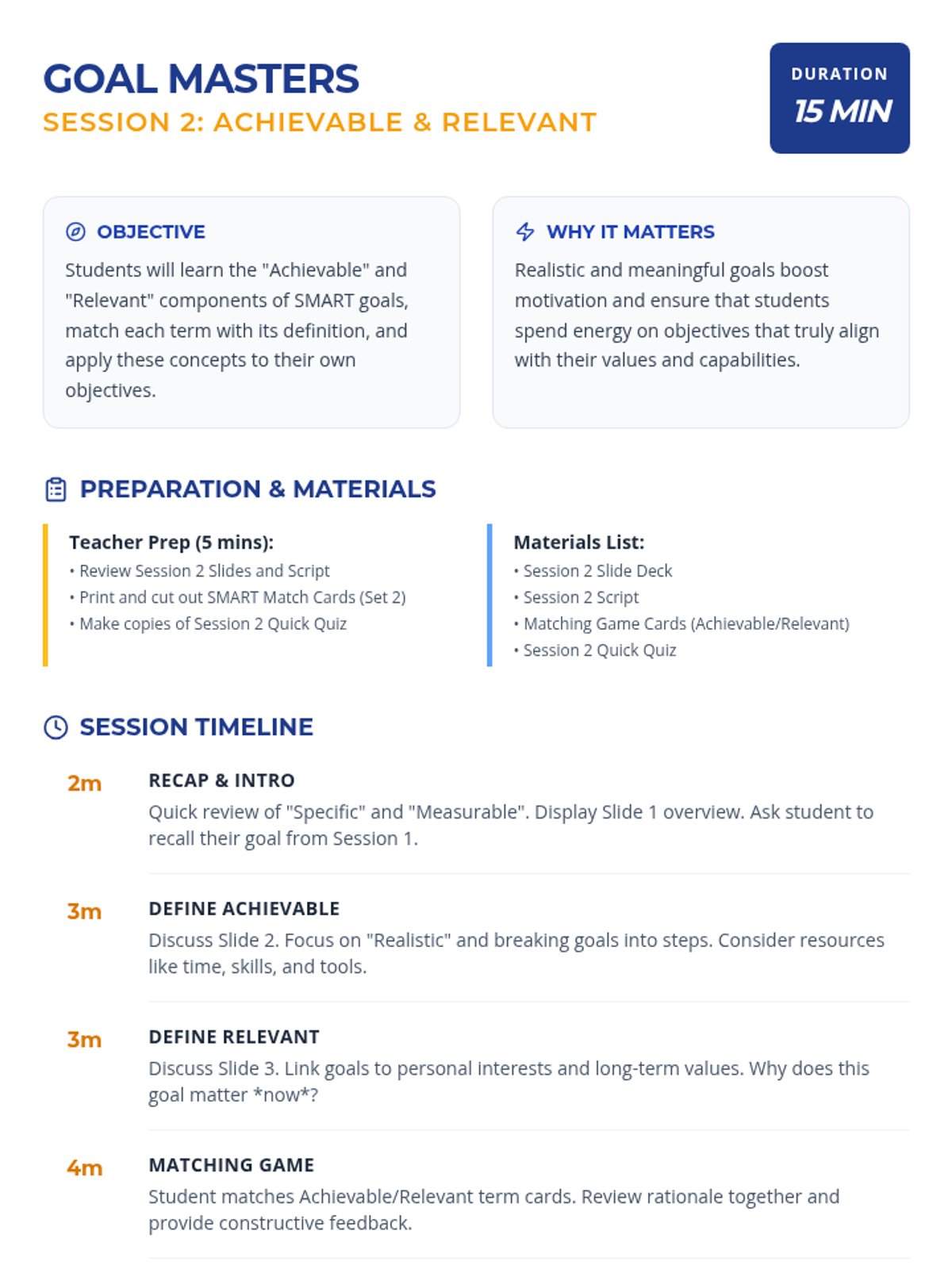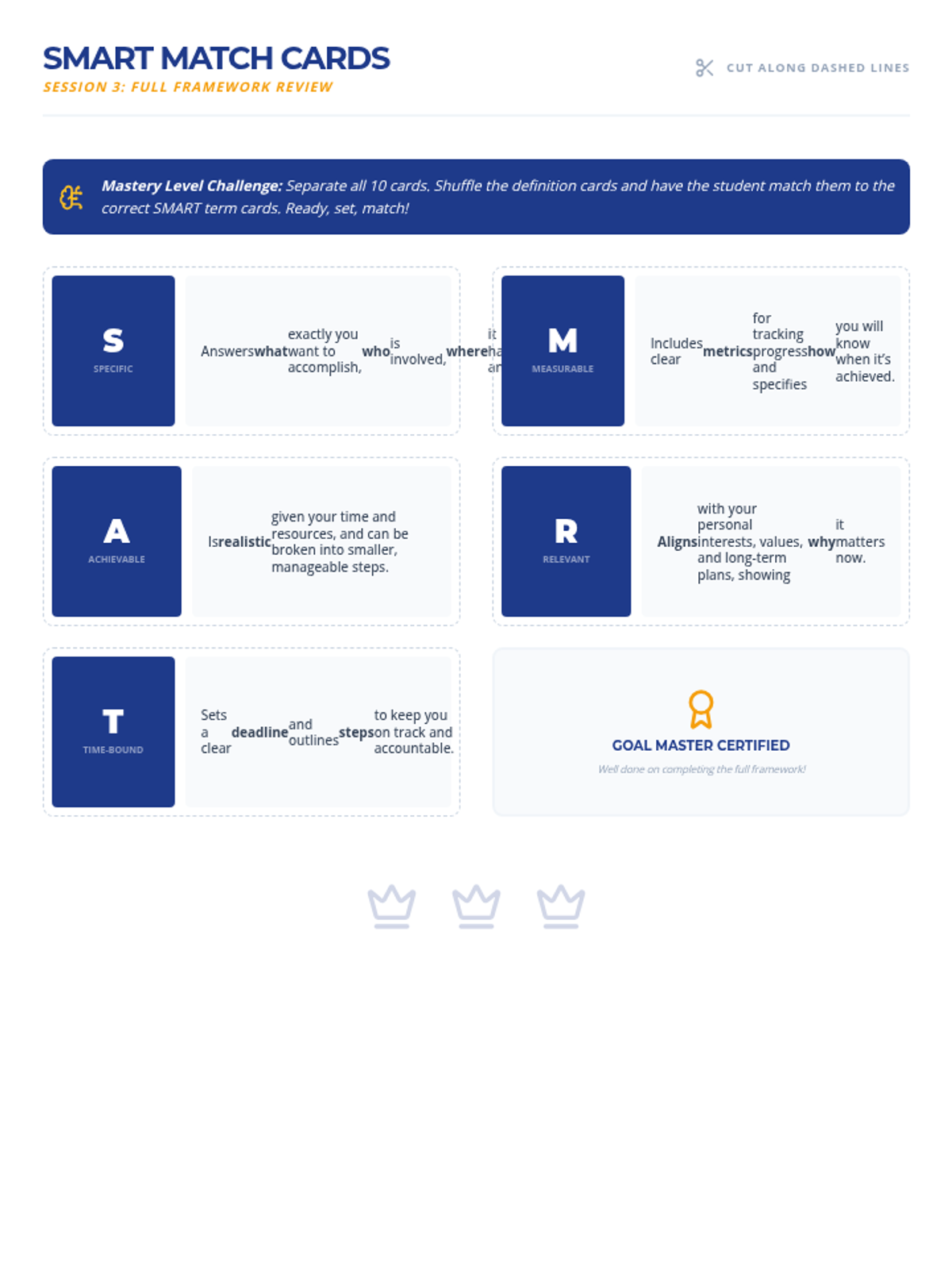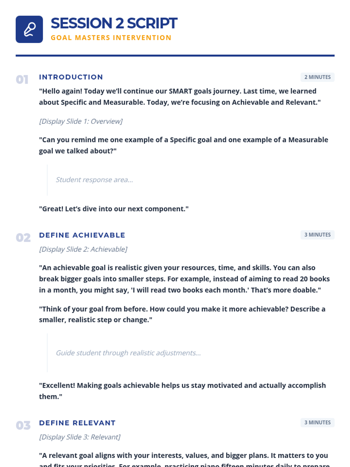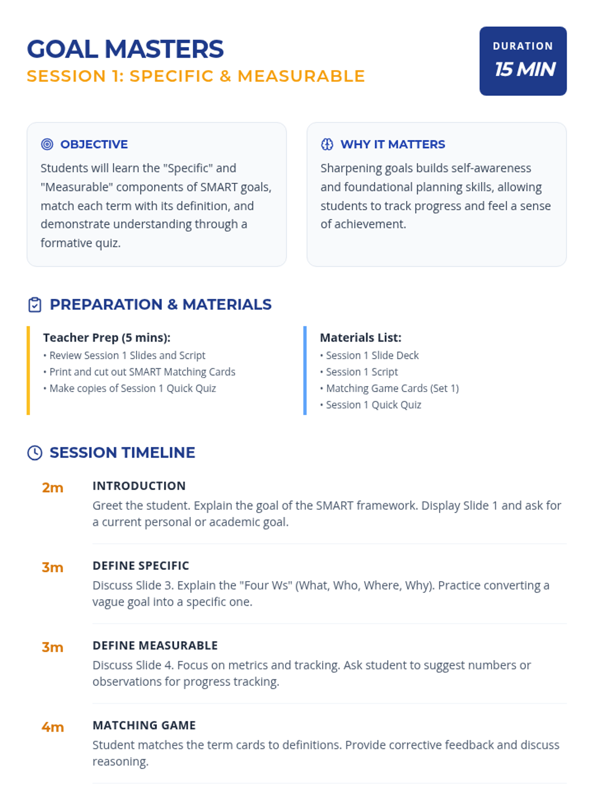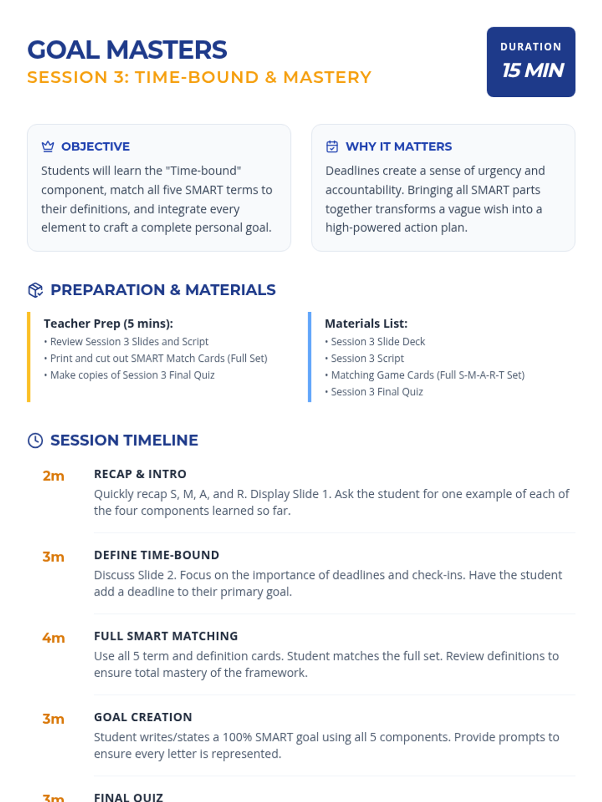 A 3-session Tier 3 intervention for middle school students to master the SMART goal-setting framework. Each 15-minute session focuses on specific components, building from foundational definitions to creating a complete, actionable goal.