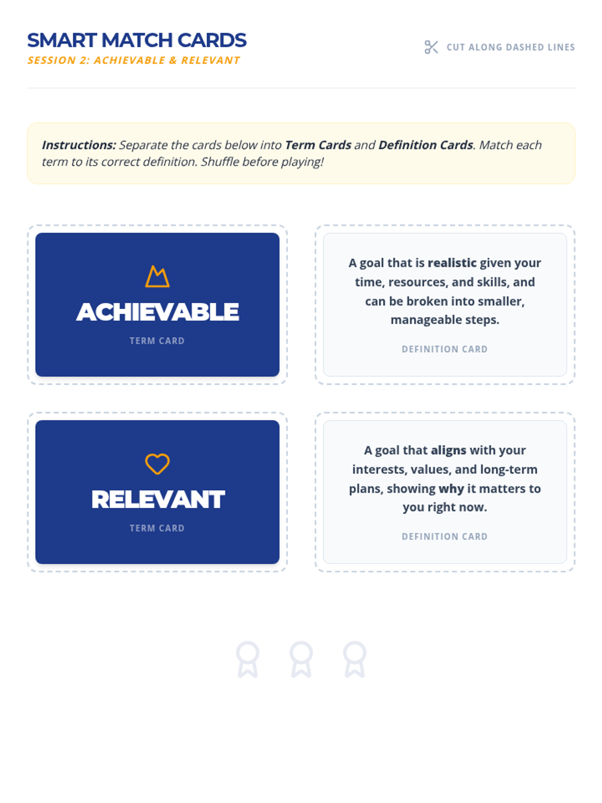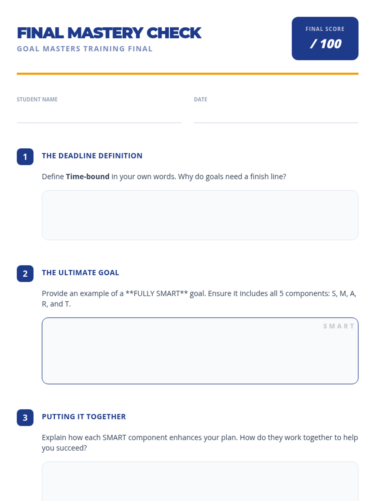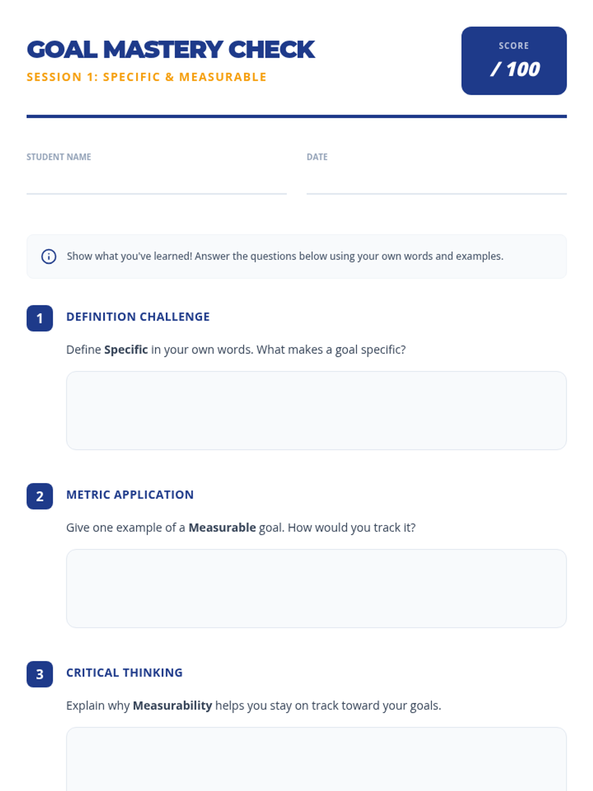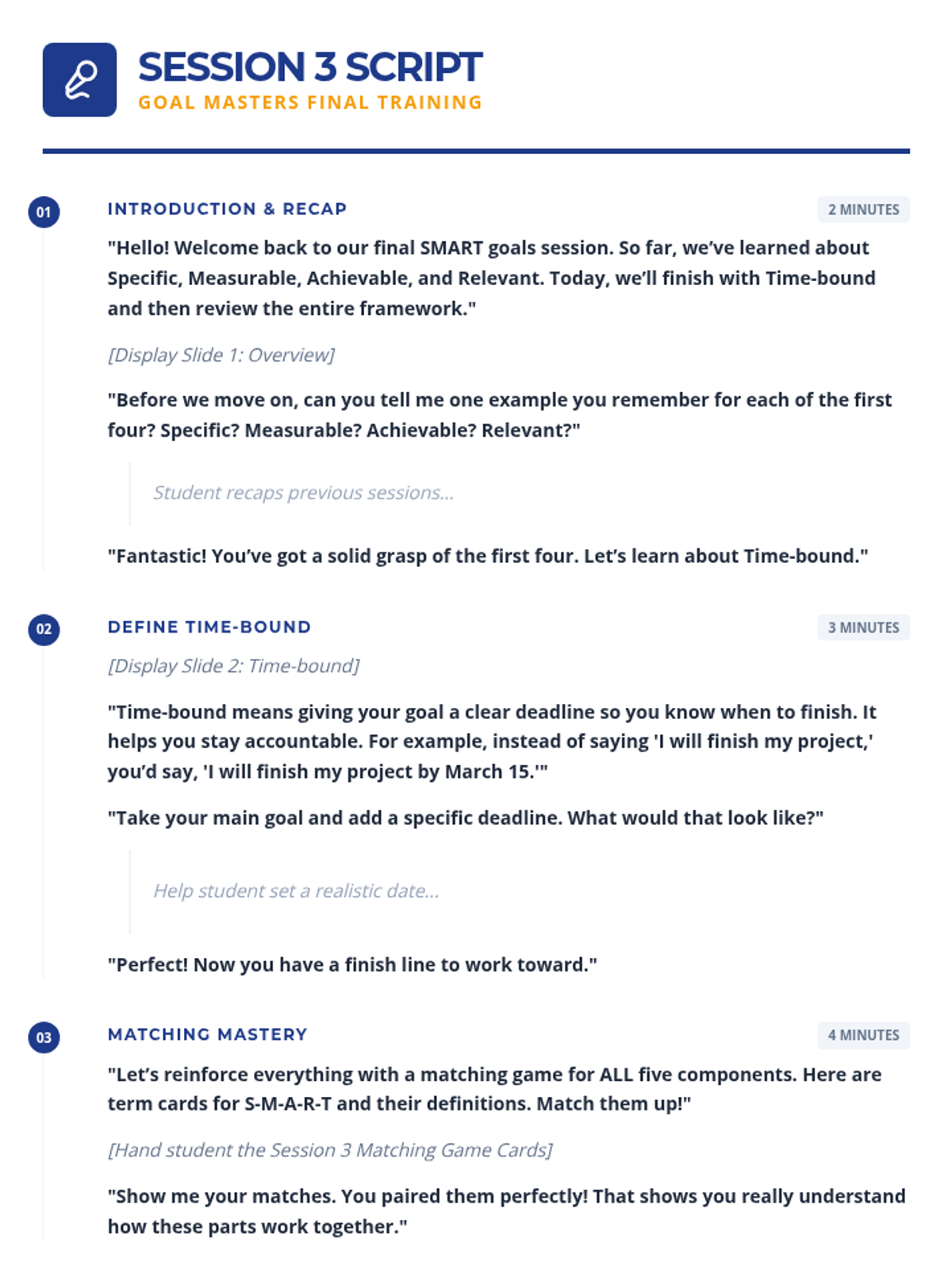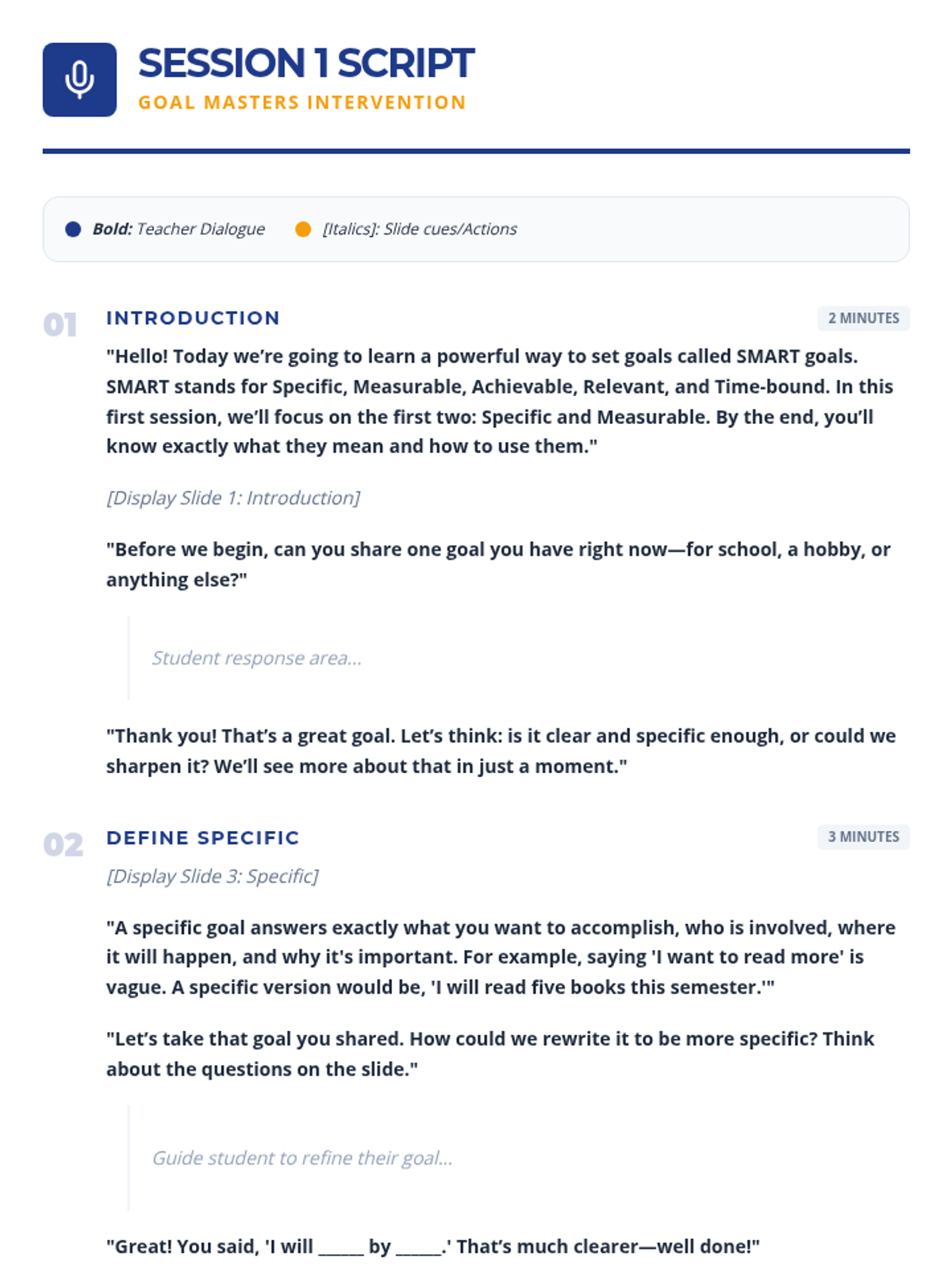 A 3-session Tier 3 intervention for middle school students to master the SMART goal-setting framework. Each 15-minute session focuses on specific components, building from foundational definitions to creating a complete, actionable goal.