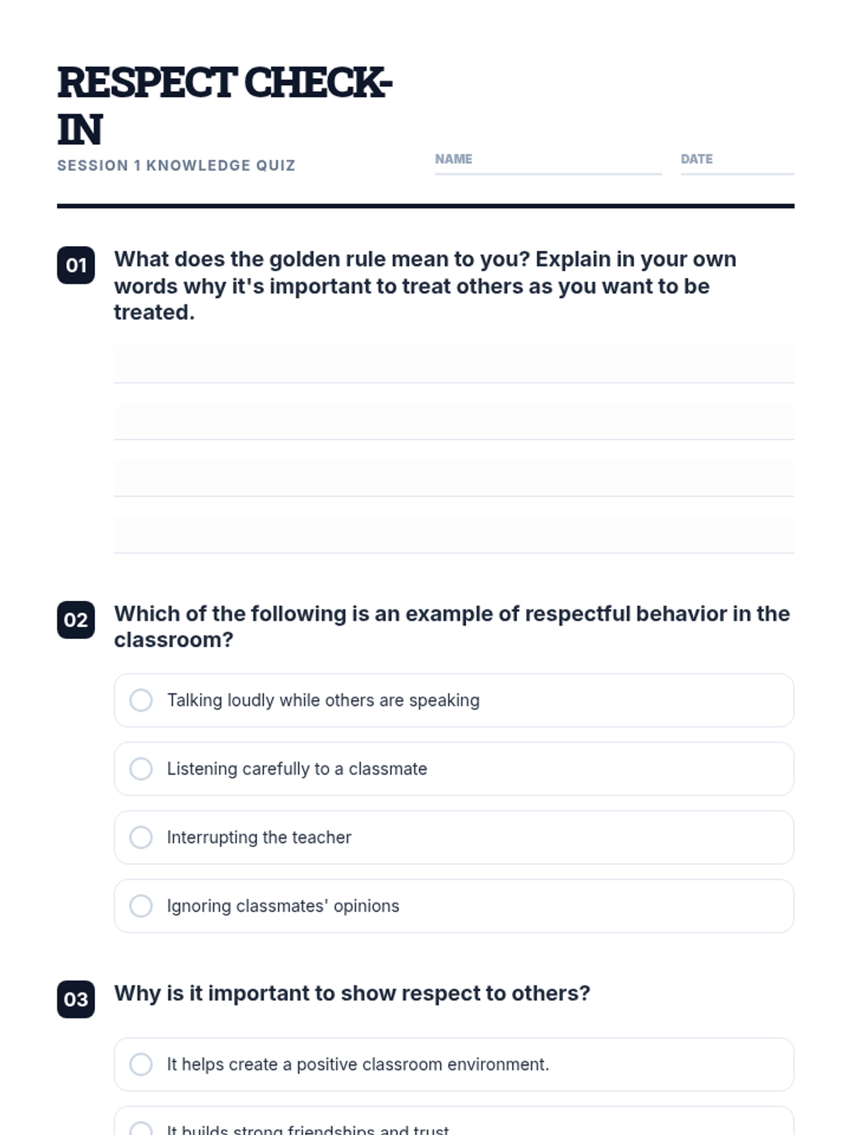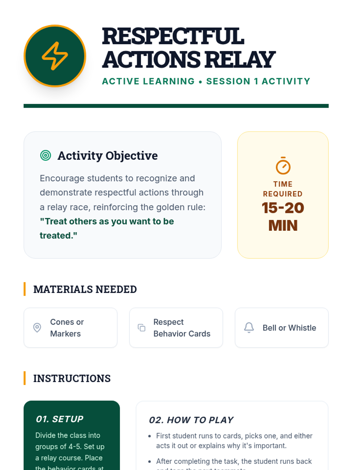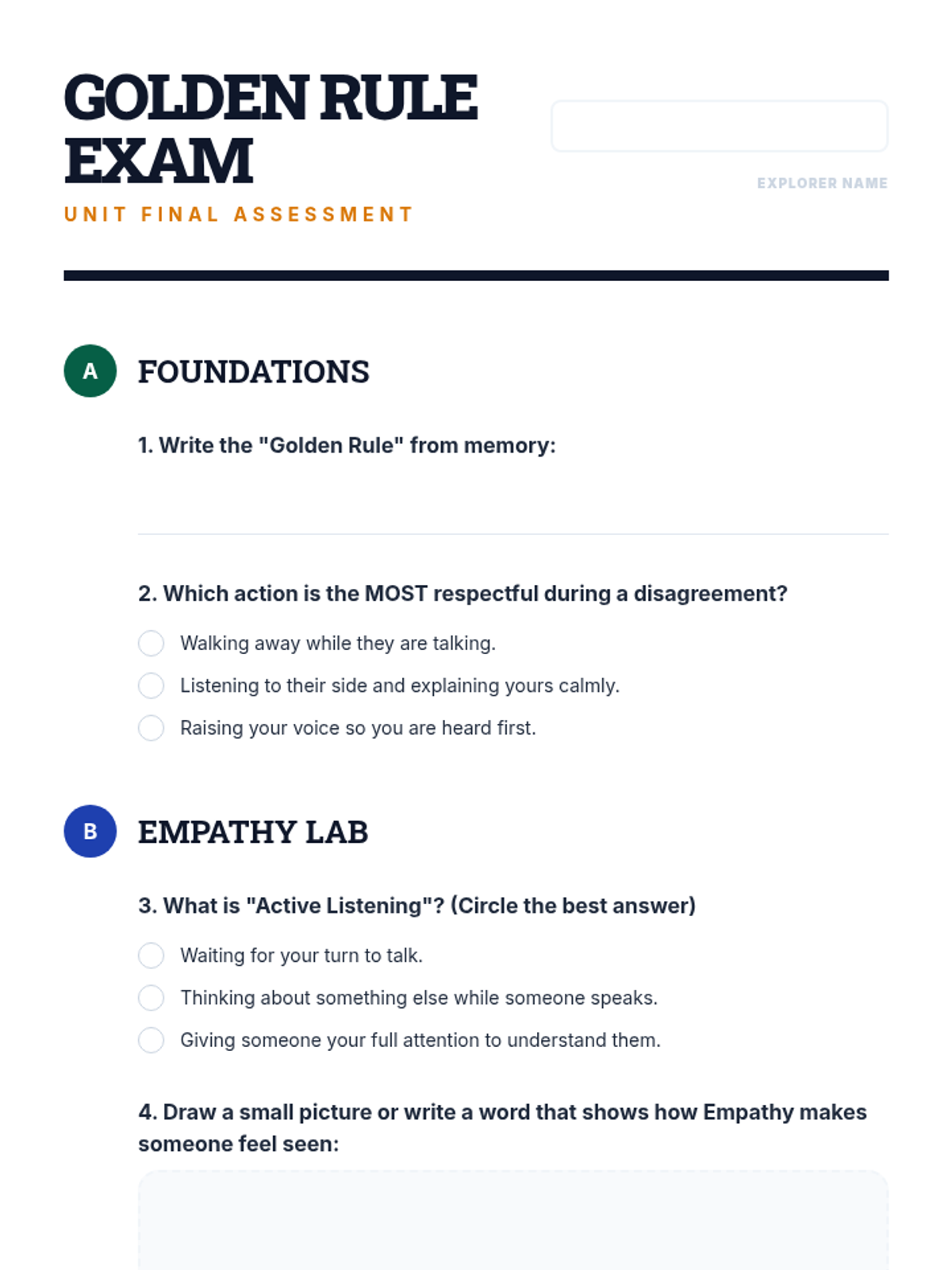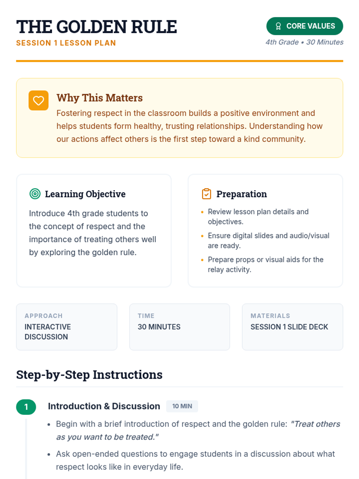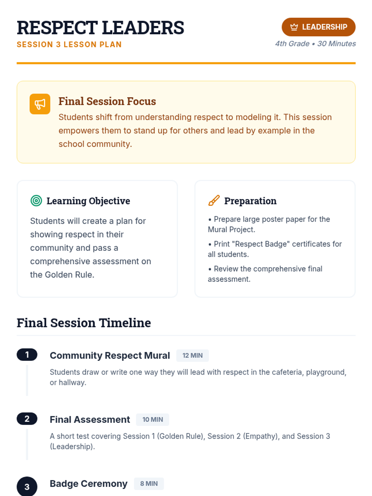 A three-session character education unit for 4th graders focused on understanding the Golden Rule, practicing active empathy, and building a culture of community respect.