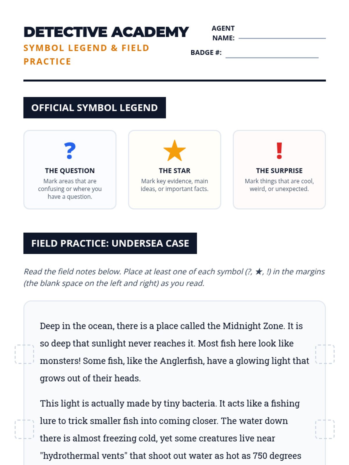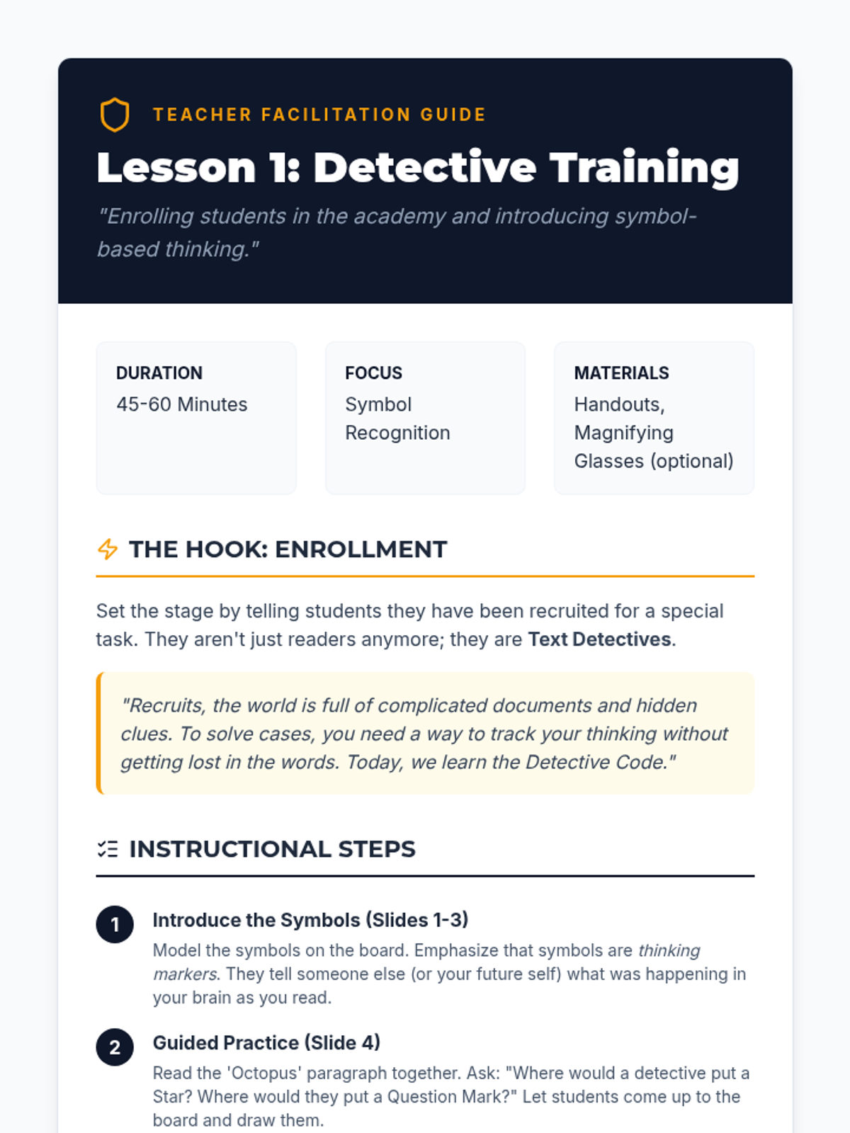 A 5-lesson sequence for 4th-grade students focusing on text annotation and symbol-based marginalia through a 'Text Detective' theme. Students learn to use specific symbols (?, *, !) and keywords to transition from passive readers to active text interrogators.