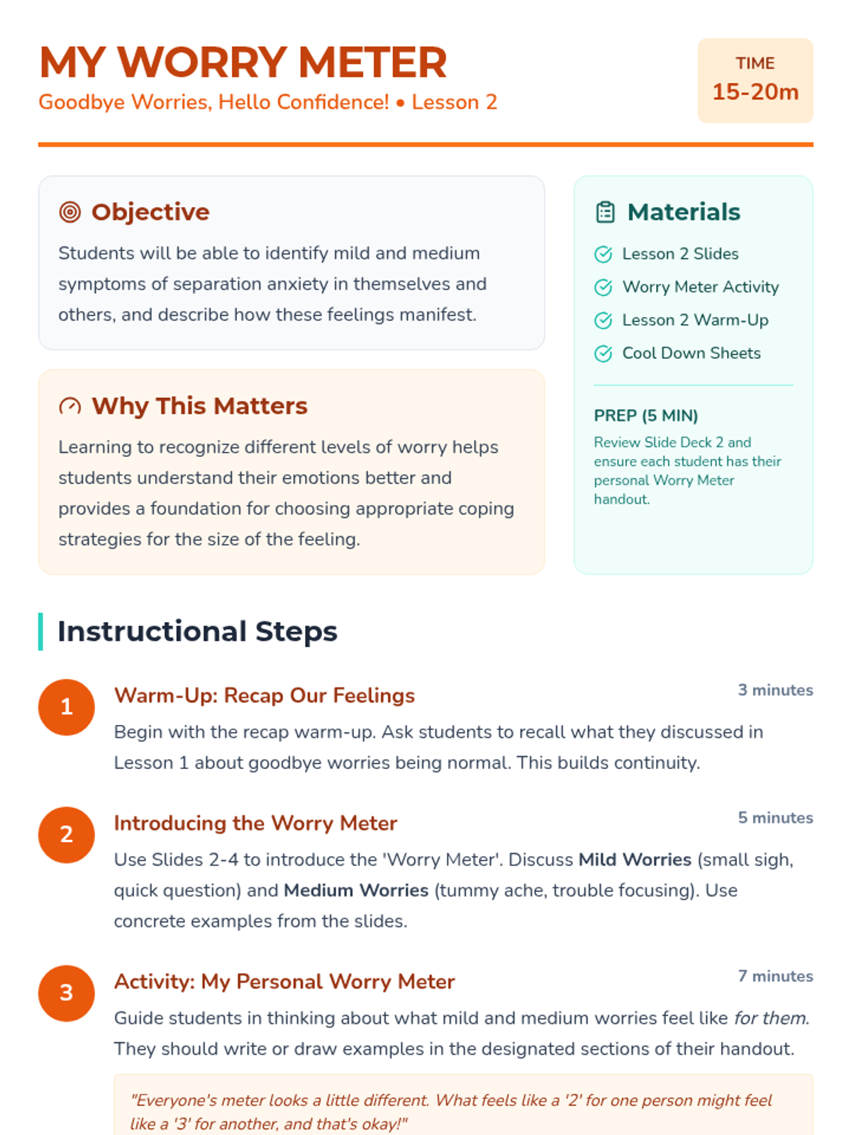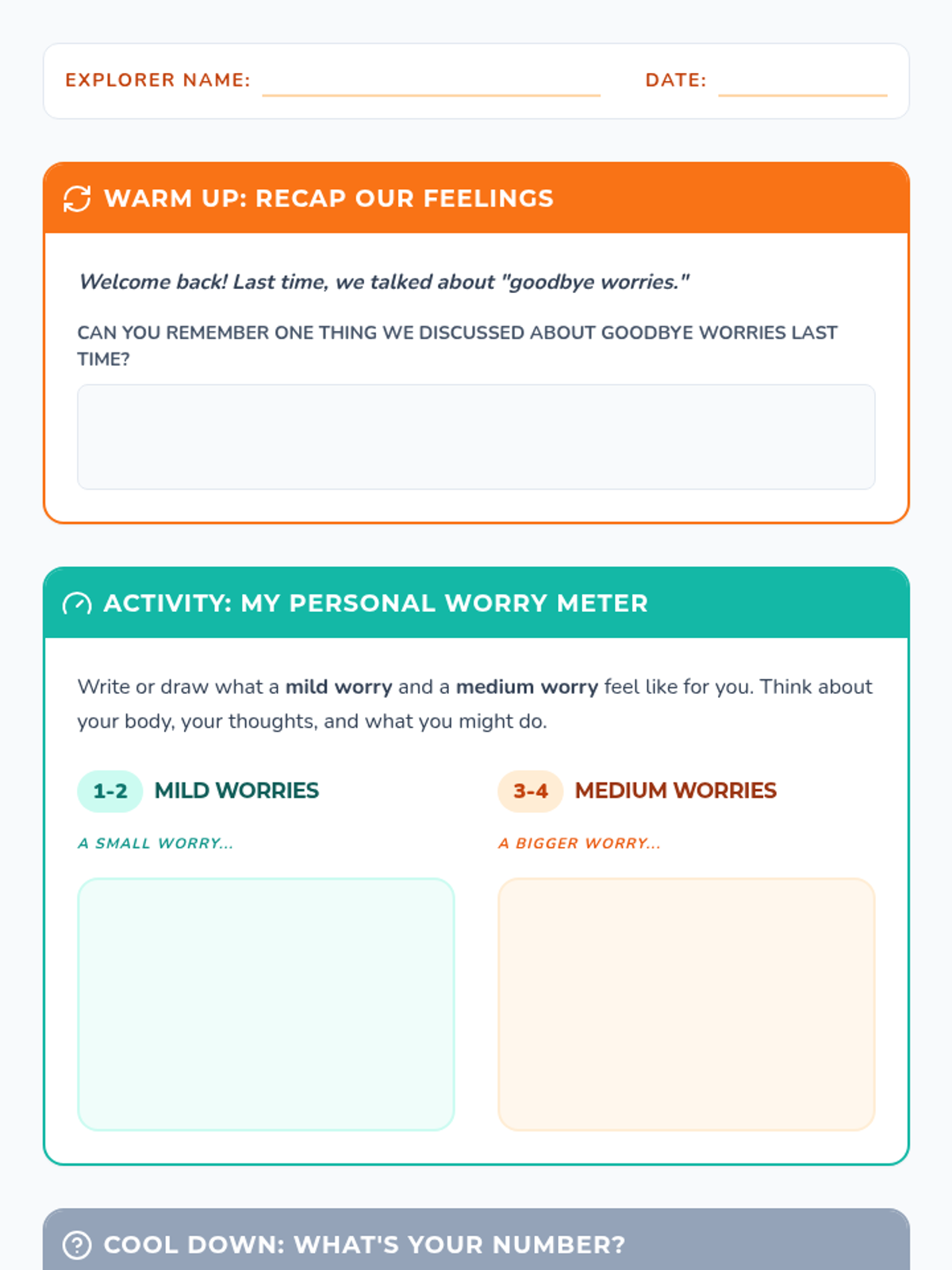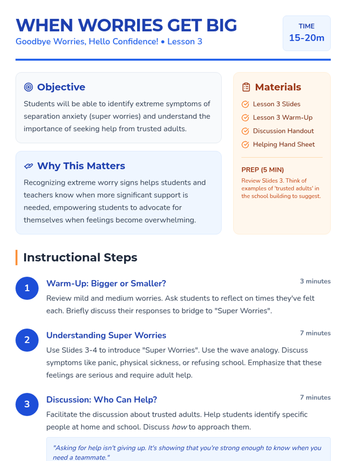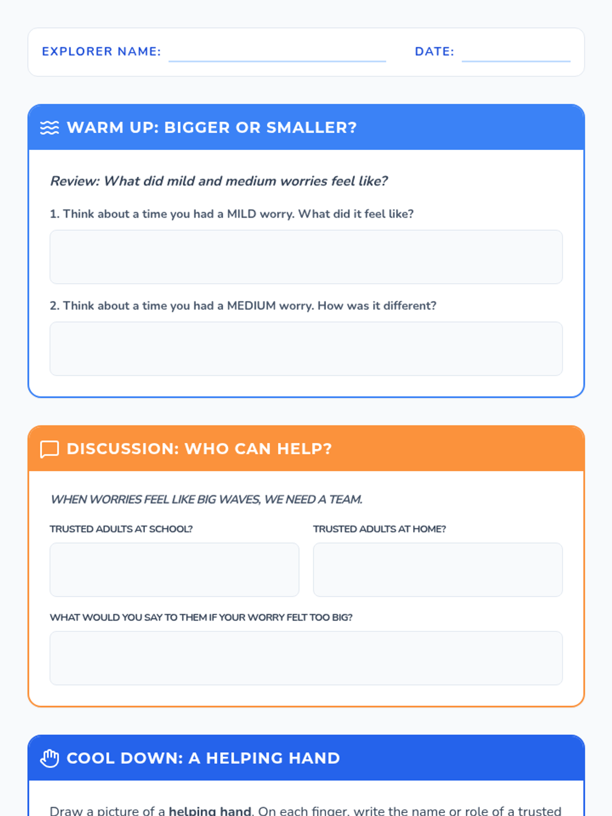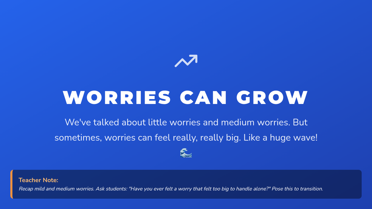 A 4-part small group series for 4th-grade students to understand, scale, and cope with separation anxiety through interactive discussions, self-assessment, and building a coping toolkit.