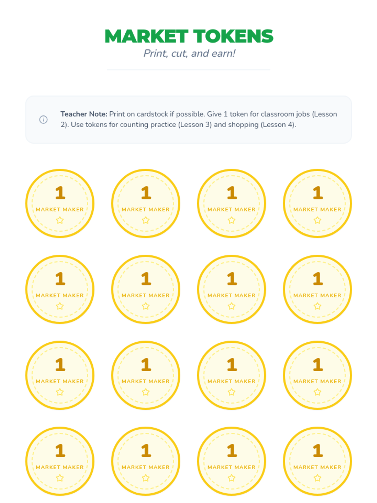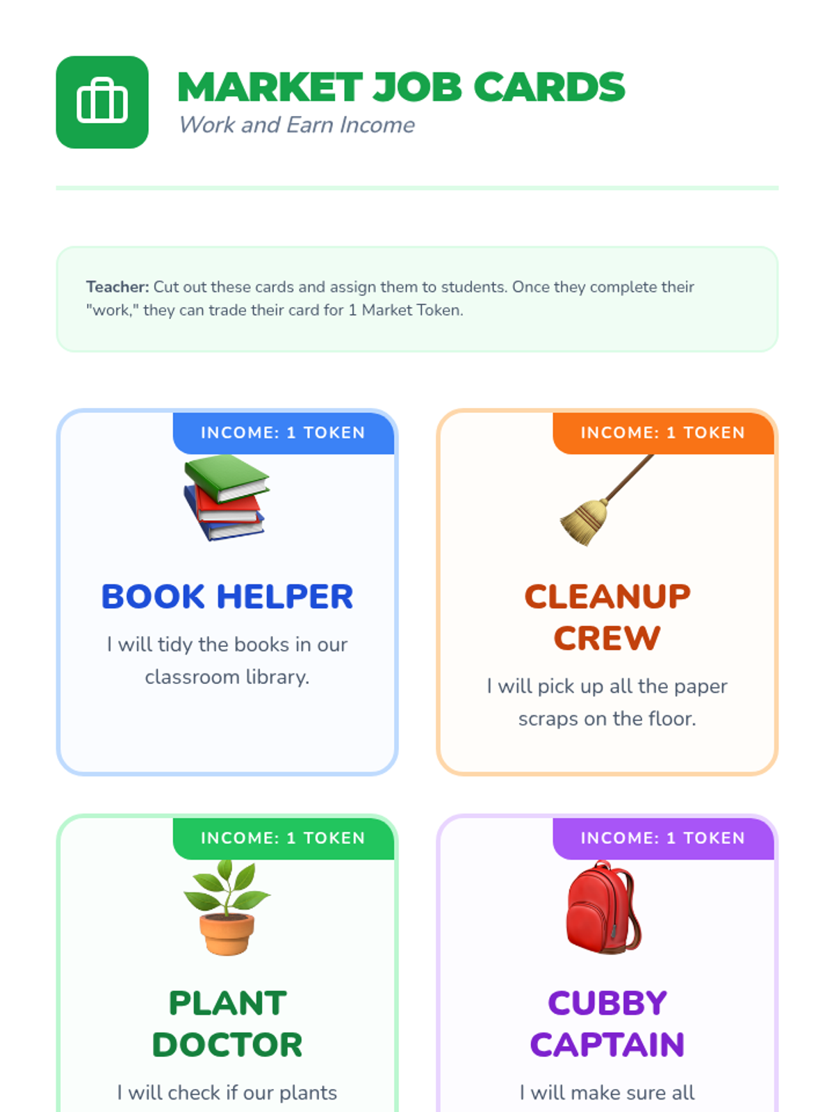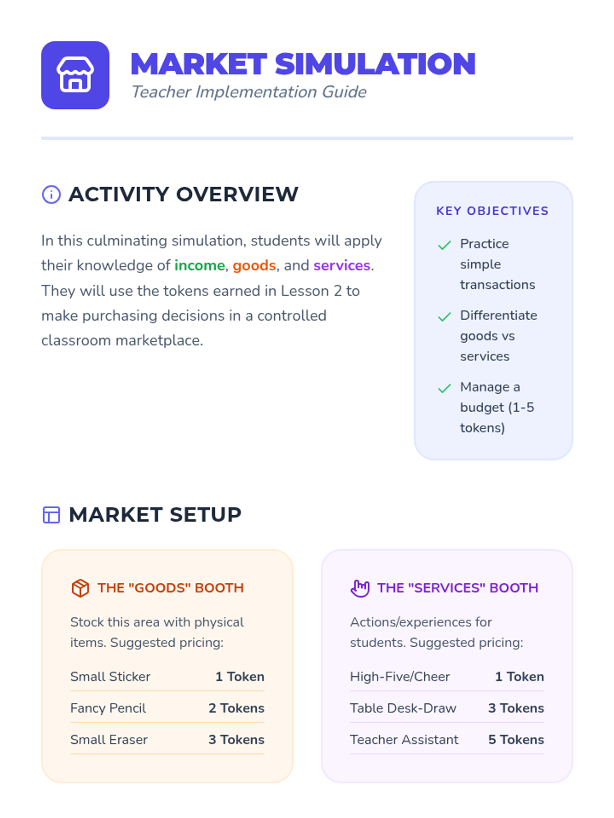 This sequence introduces Kindergarten students to foundational economic concepts through concrete experiences. Students explore the difference between needs and wants, encounter scarcity through a limited resource simulation, practice decision-making with trade-offs, and participate in a classroom market using earned tokens.