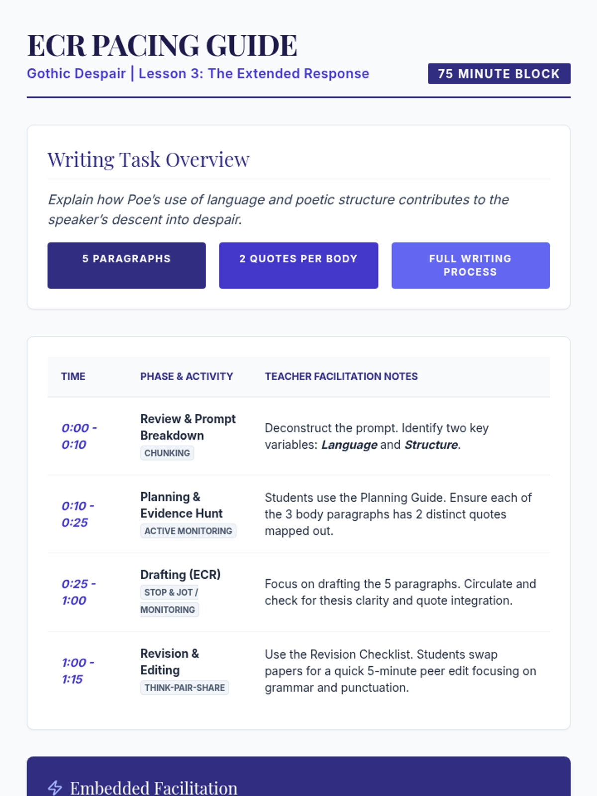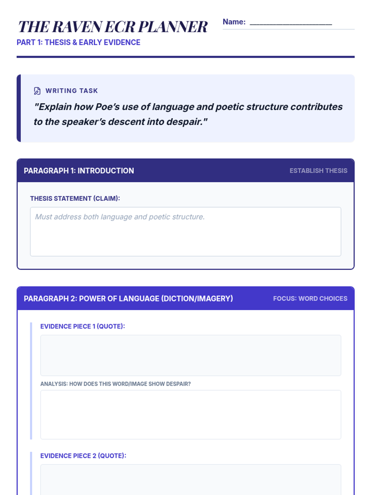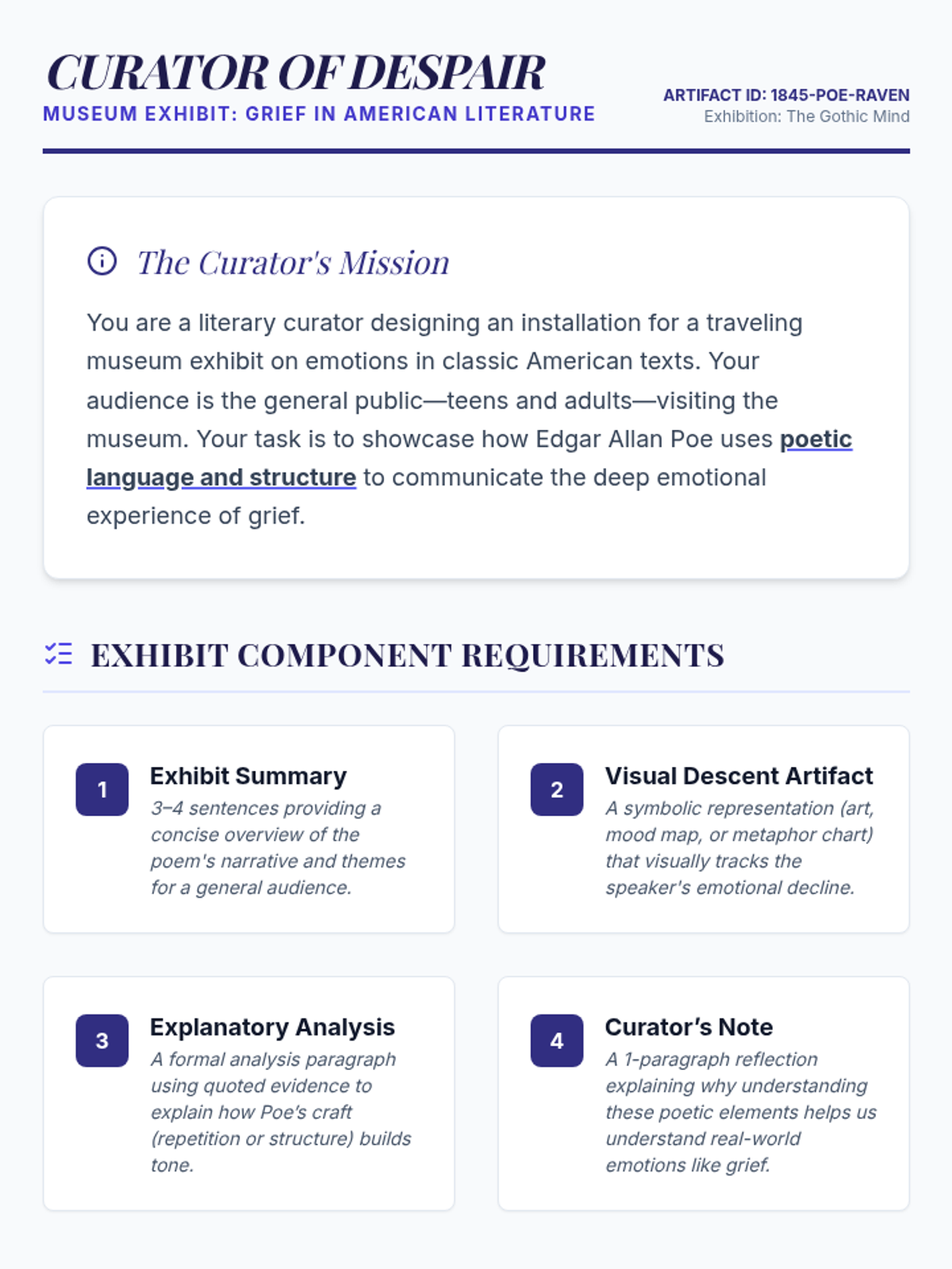 A two-day exploration of Edgar Allan Poe's 'The Raven', analyzing poetic craft, gothic elements, and the emotional descent of the narrator through creative performance tasks and analytical writing.