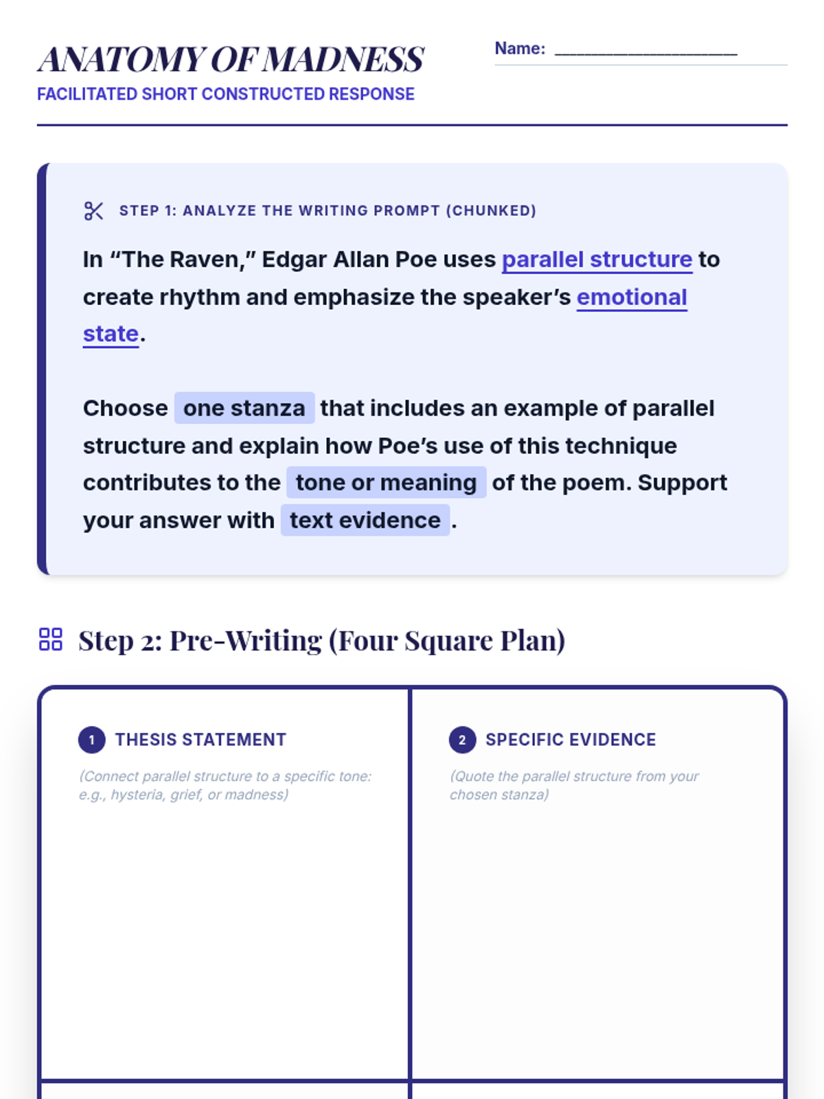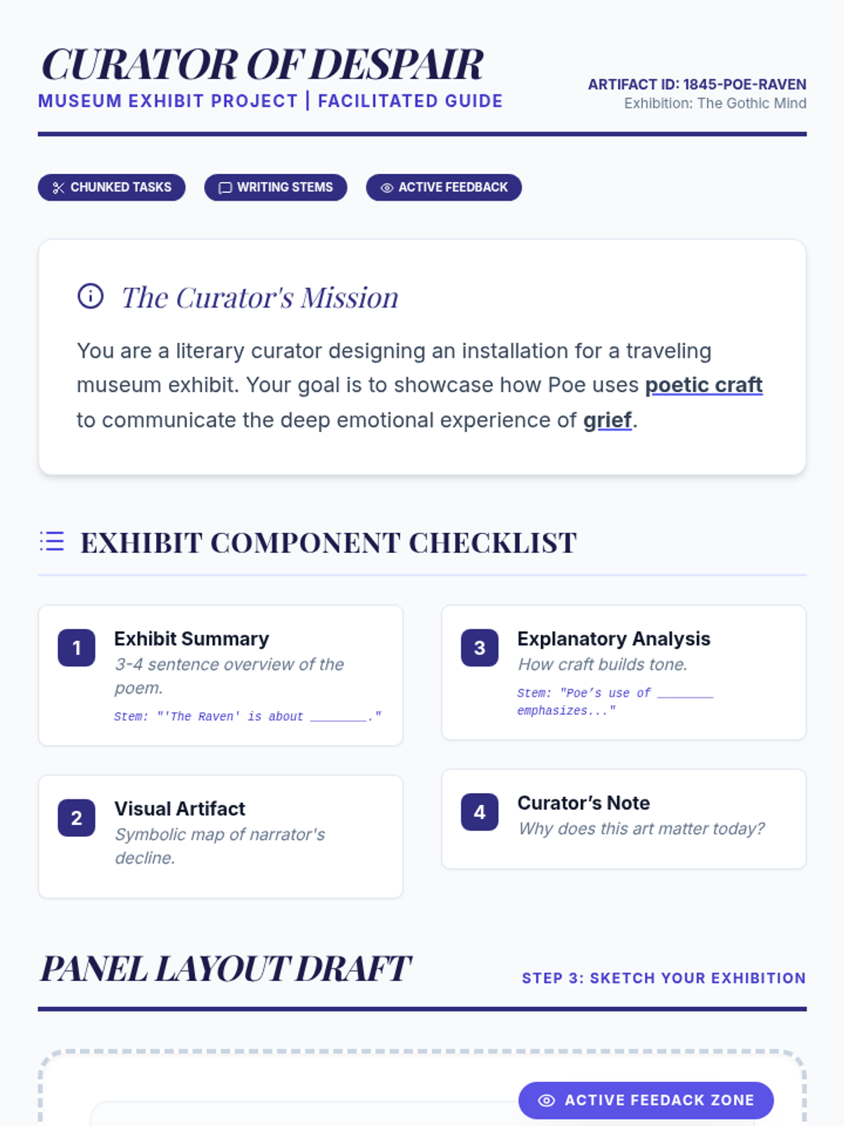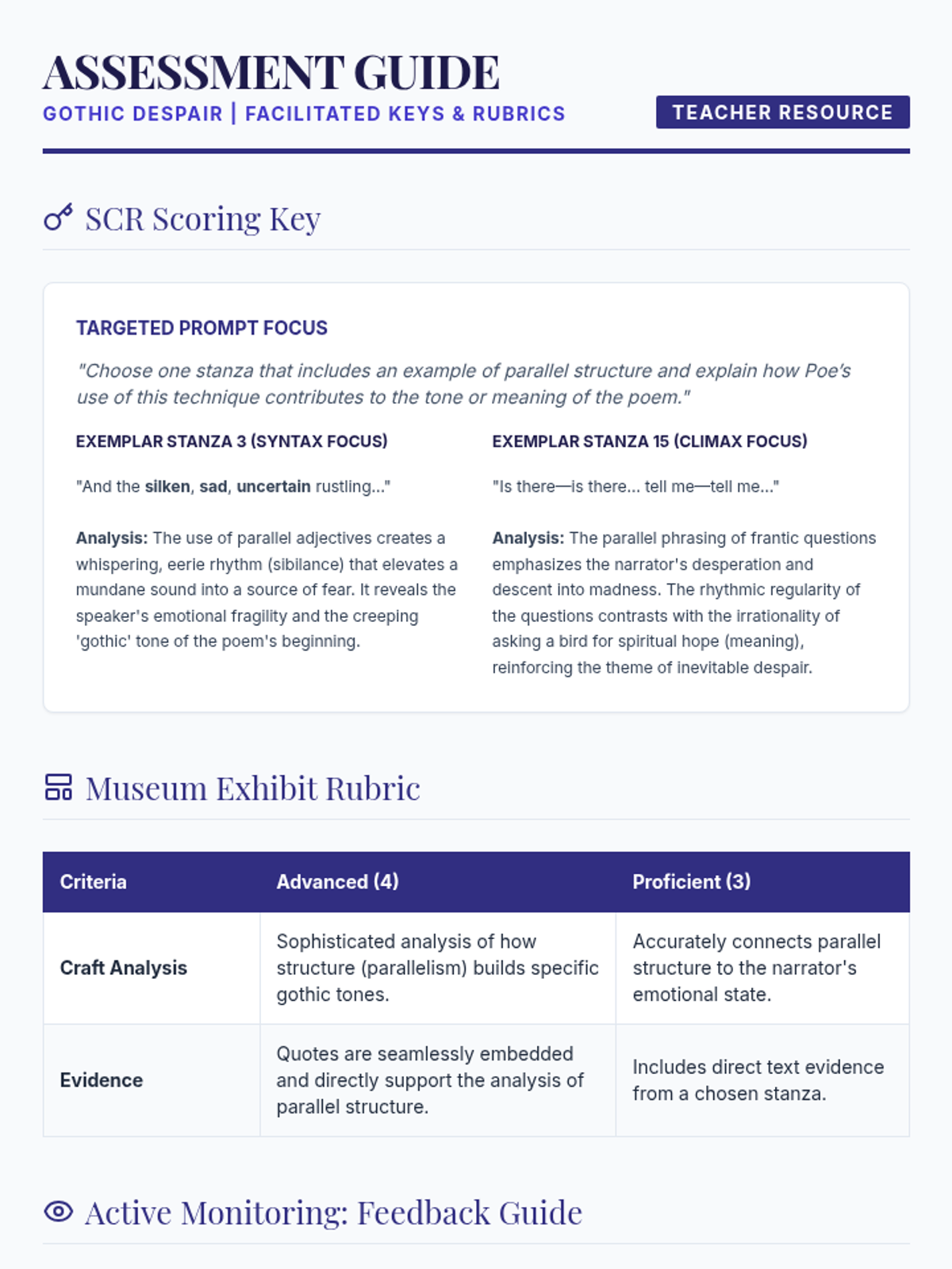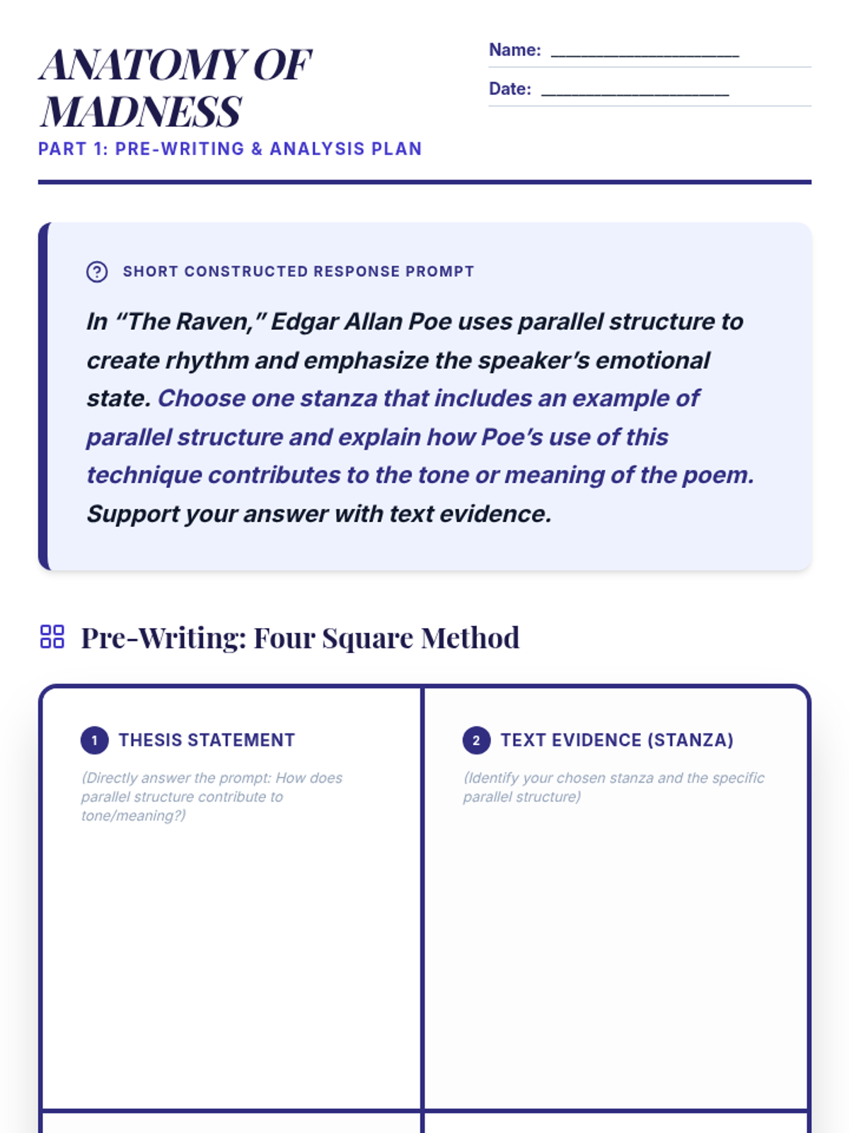 A two-day exploration of Edgar Allan Poe's 'The Raven', analyzing poetic craft, gothic elements, and the emotional descent of the narrator through creative performance tasks and analytical writing.