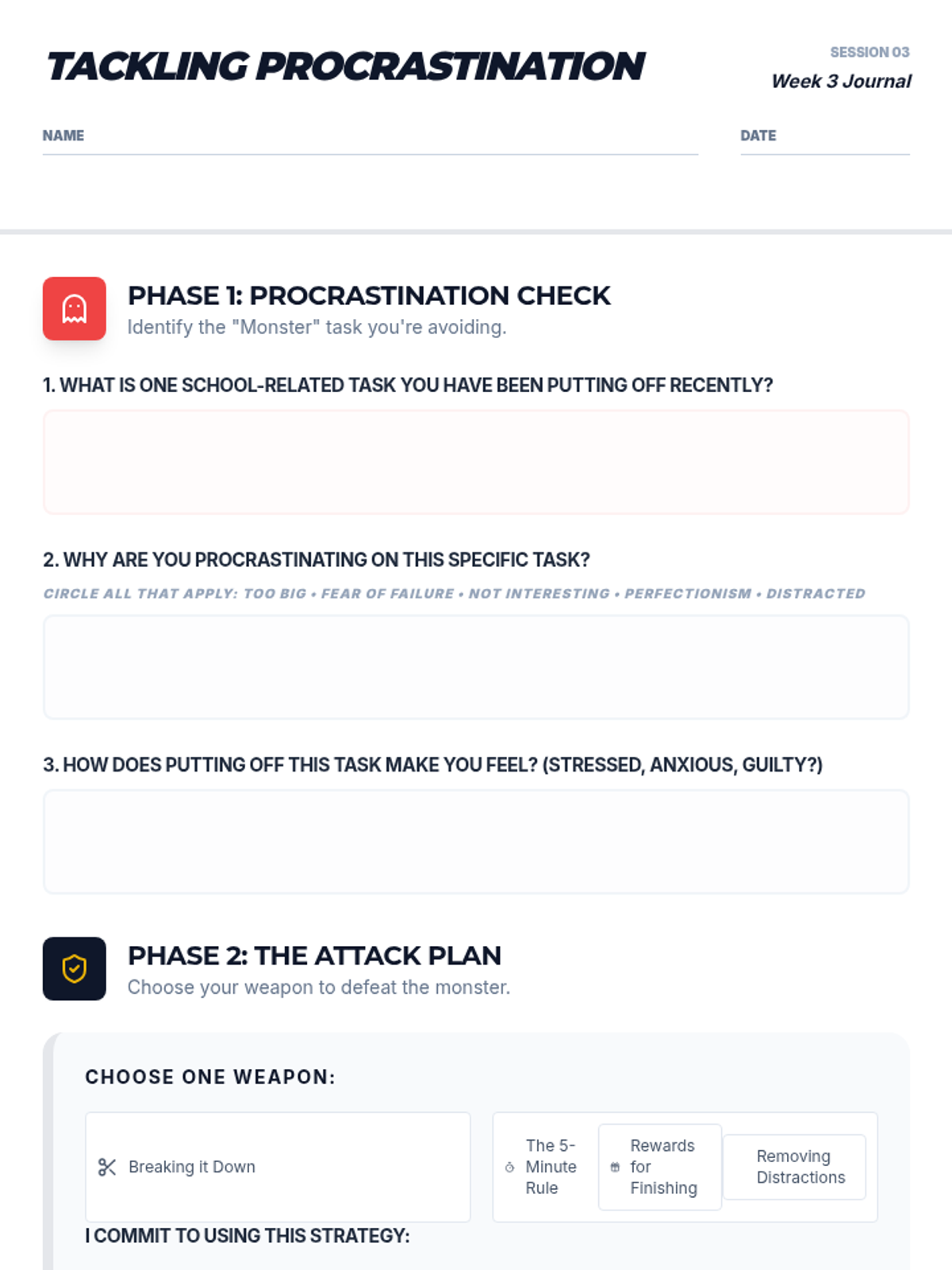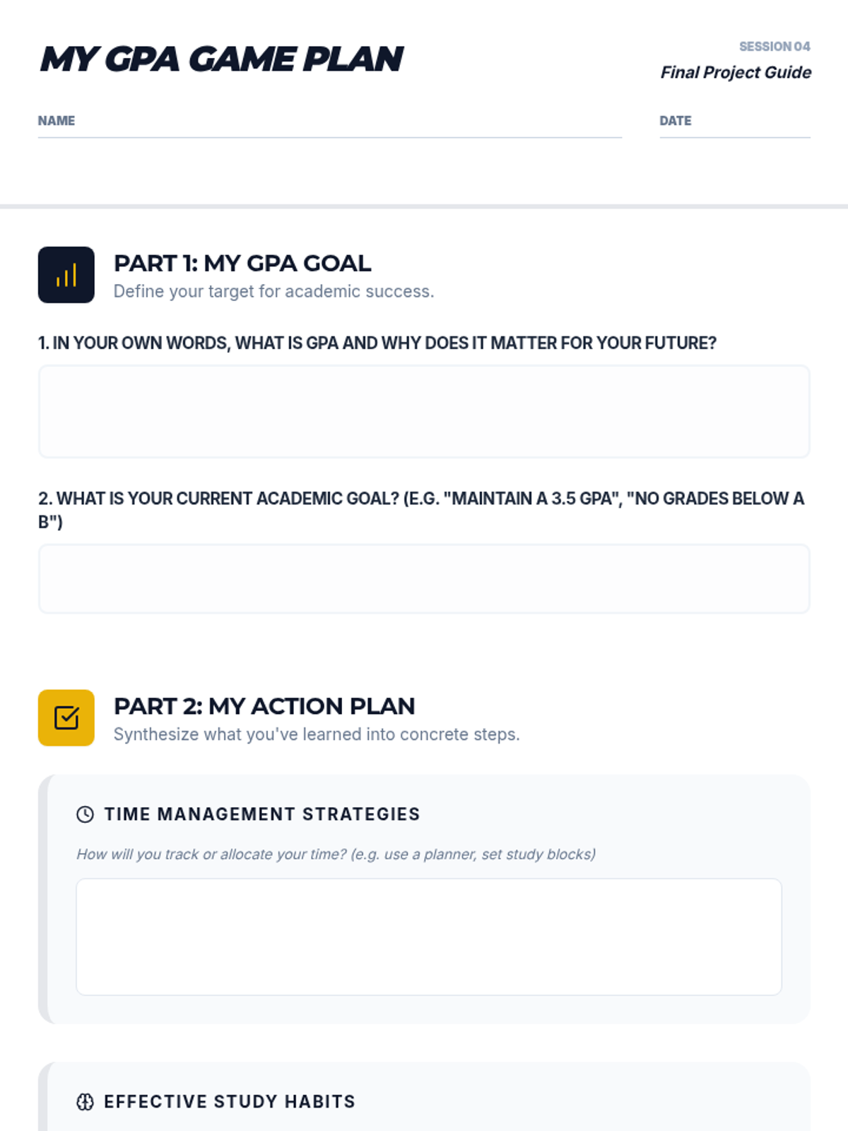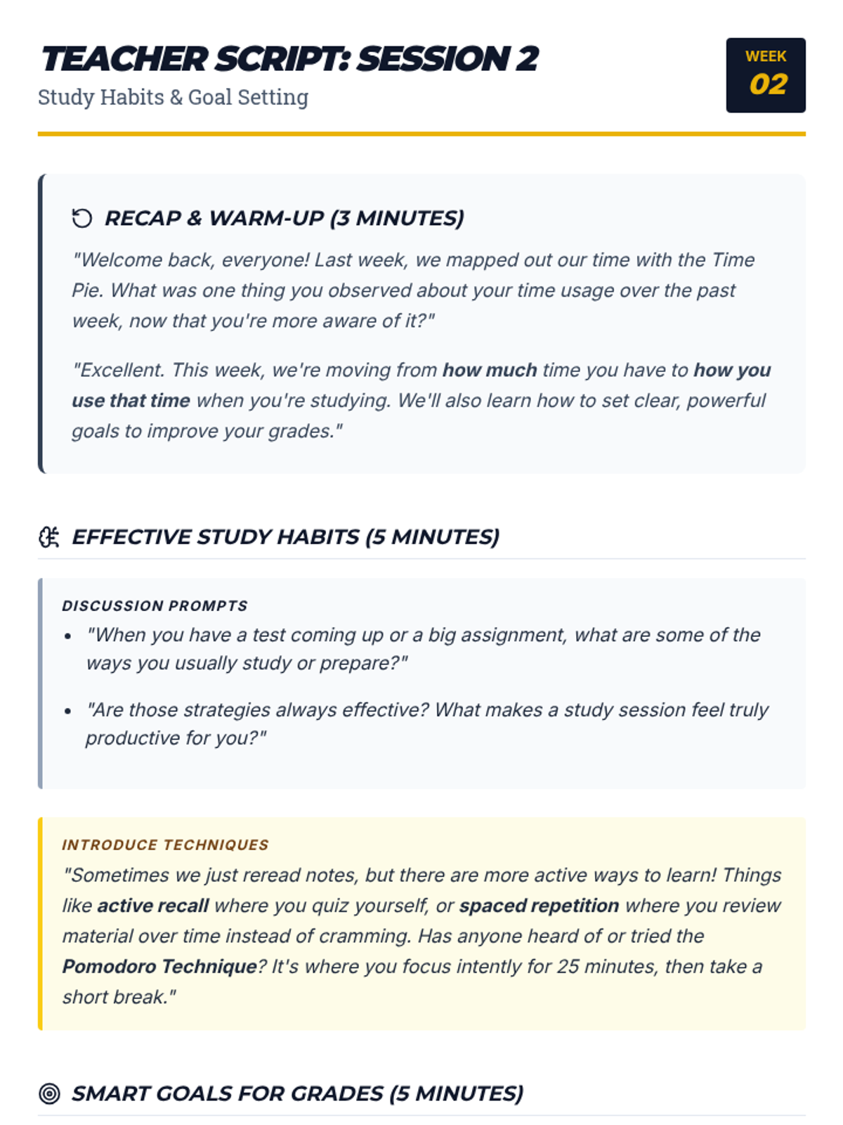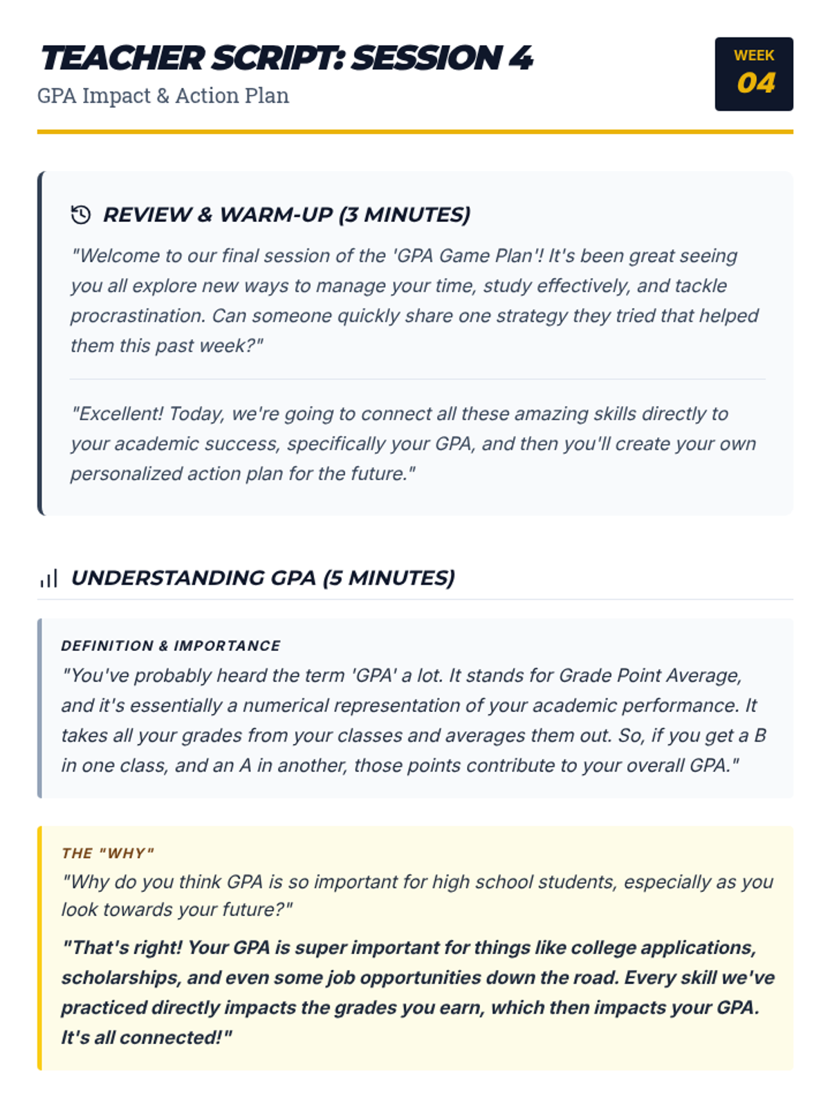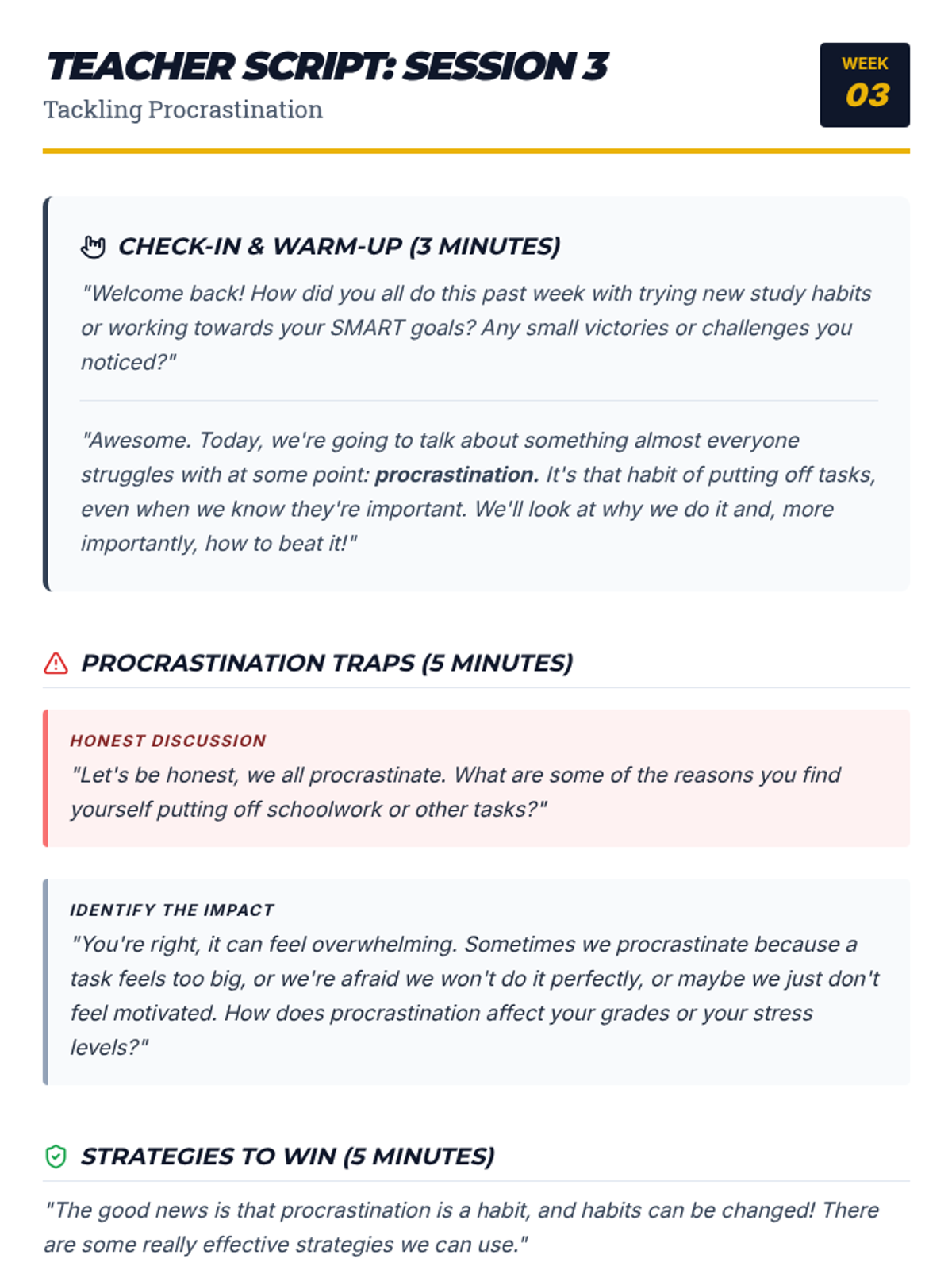A 4-week small group program for 10th-grade students to master time management, study habits, and procrastination to boost their GPA.