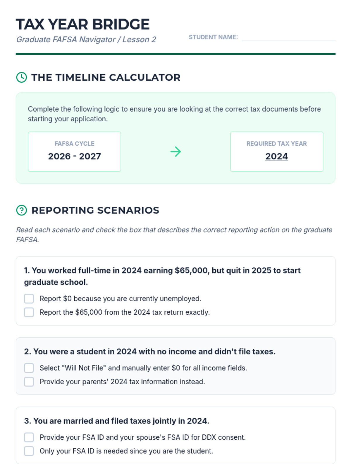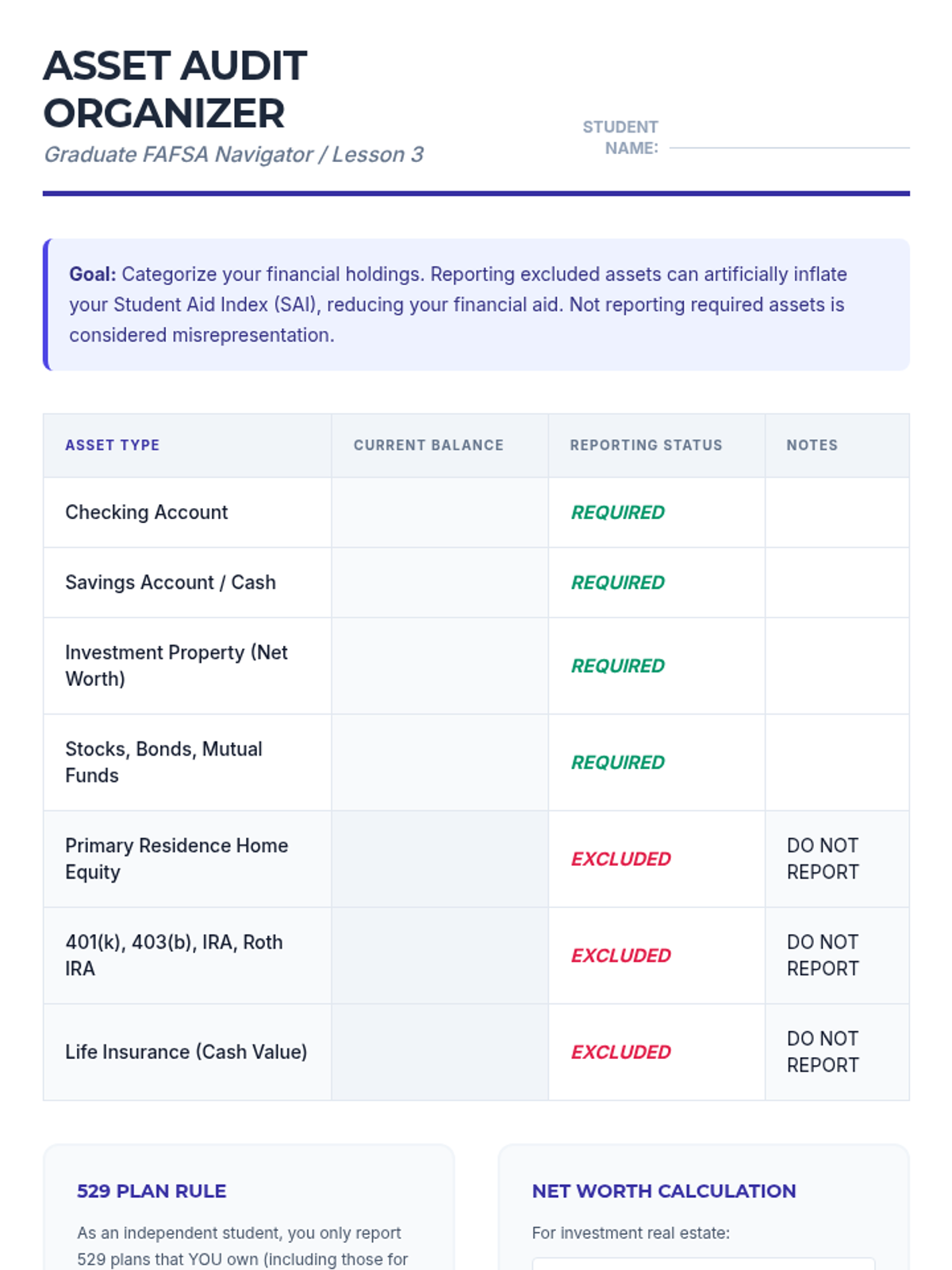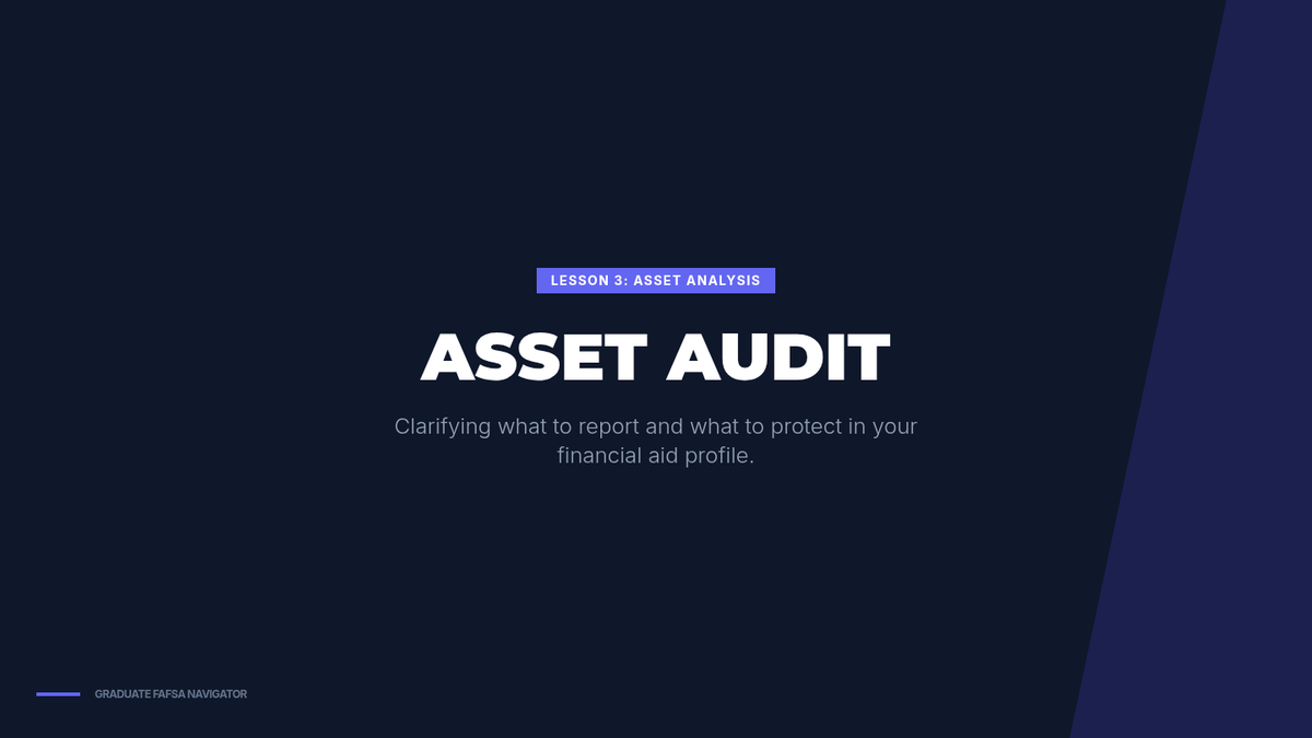 A comprehensive workshop-style sequence for graduate students navigating the FAFSA as independent applicants, focusing on technical requirements, asset reporting, and strategic planning.