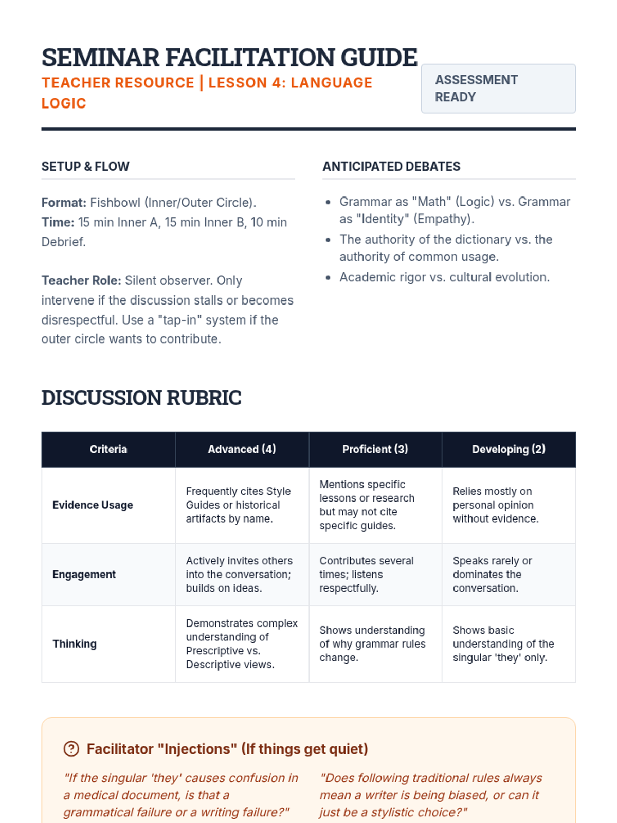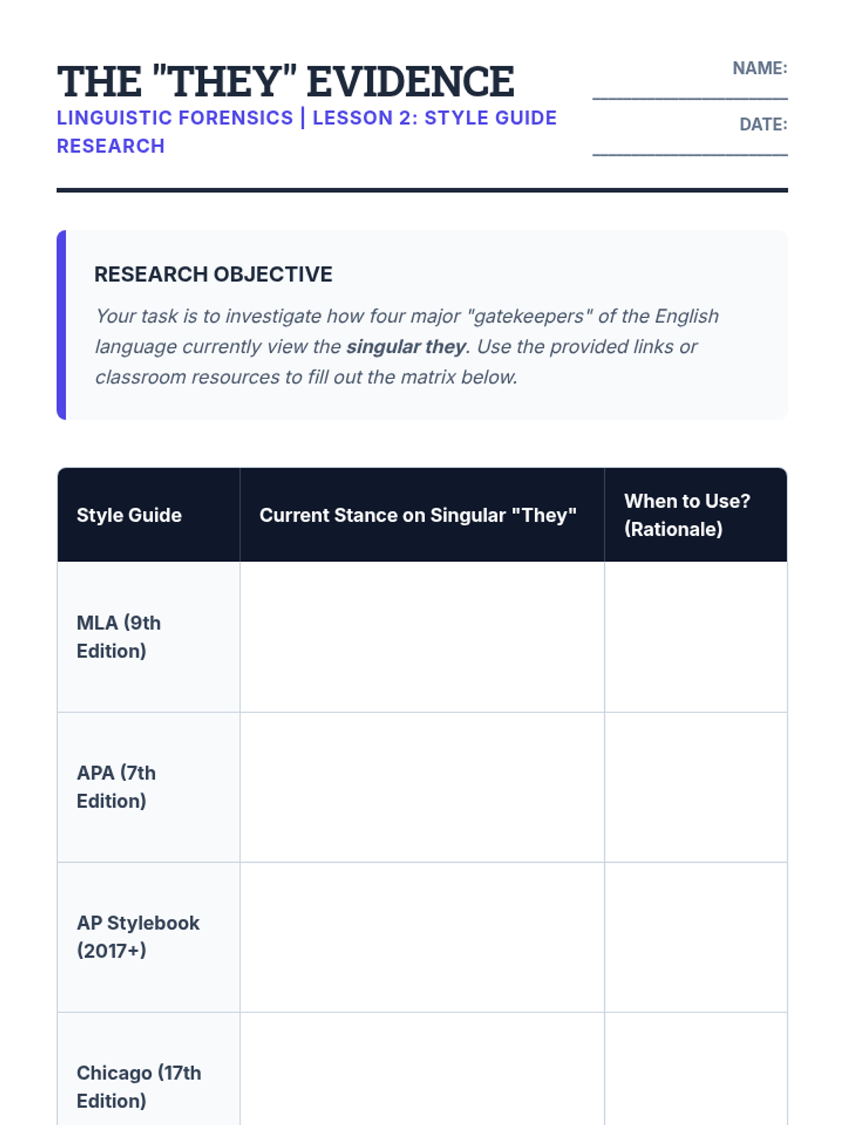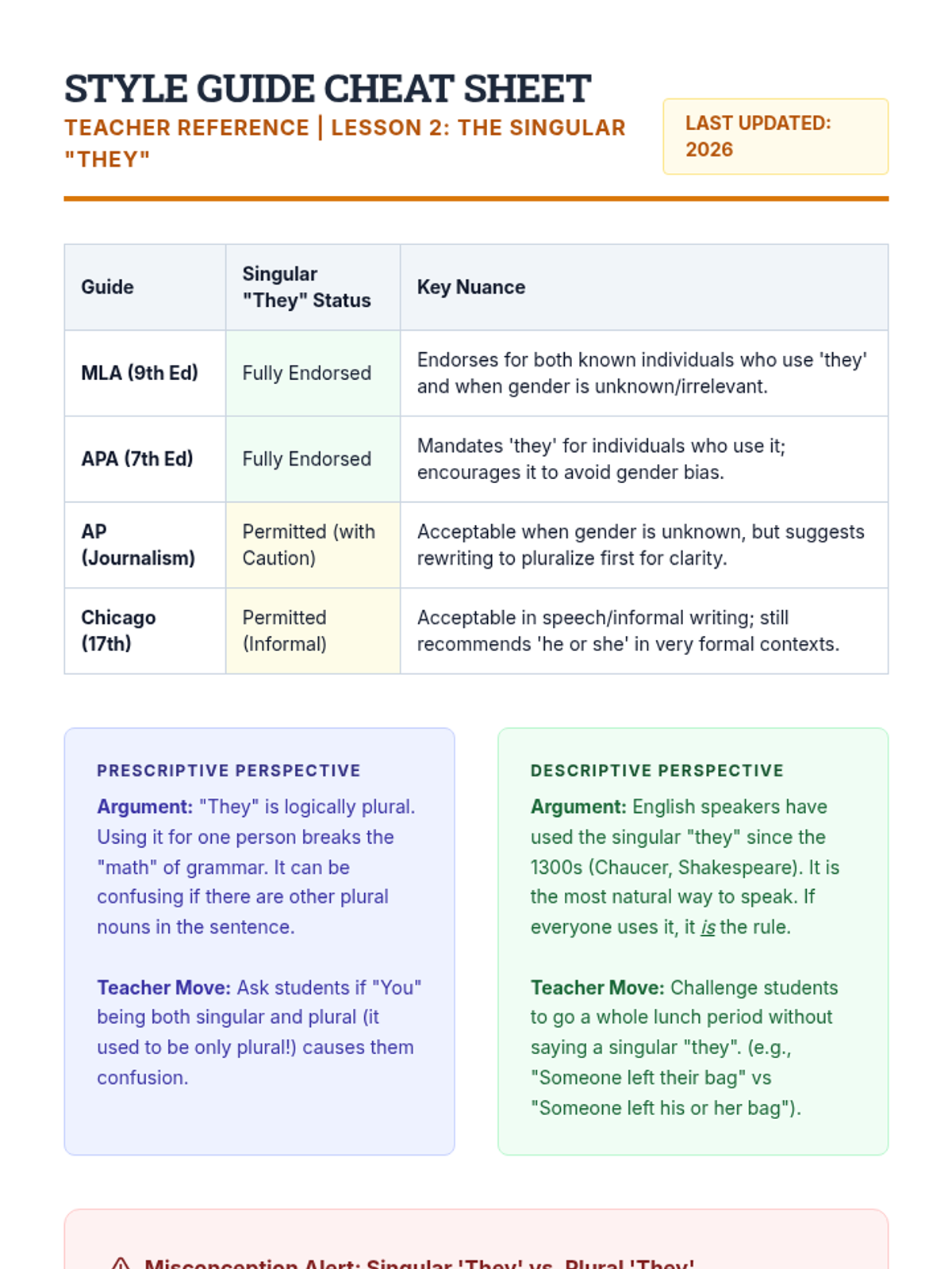 This inquiry-based sequence explores the evolving nature of grammar, specifically addressing the debate around the singular 'they' and gender-neutral language. Students move from analyzing historical style guides to evaluating modern usage in journalism and academia.
