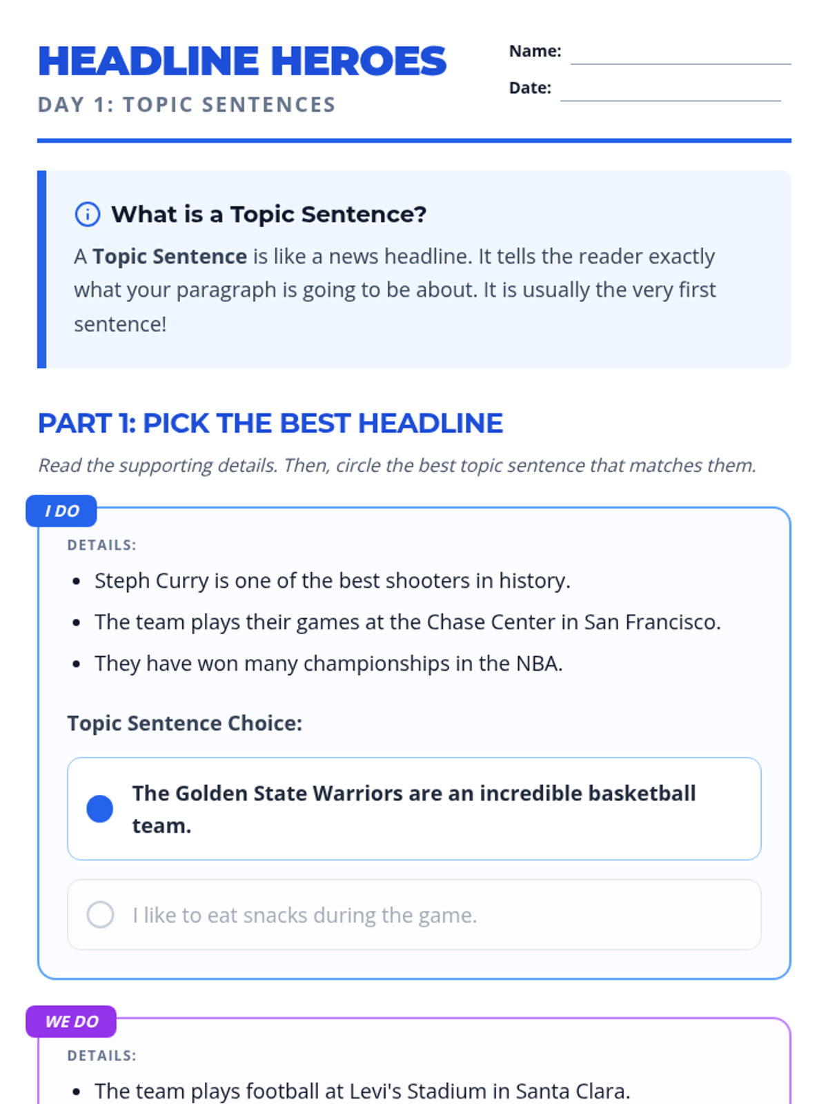 A 4-day instructional sequence focused on paragraph structure, specifically mastering topic sentences and supporting details using student-interest topics like sports, dragons, and favorite foods.