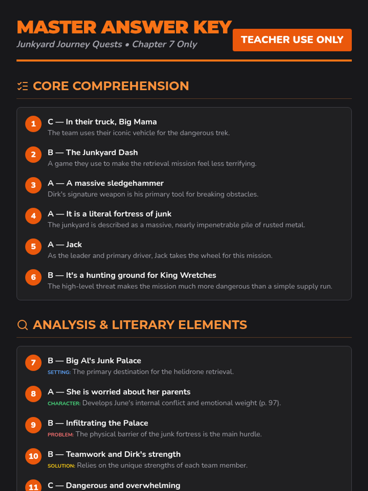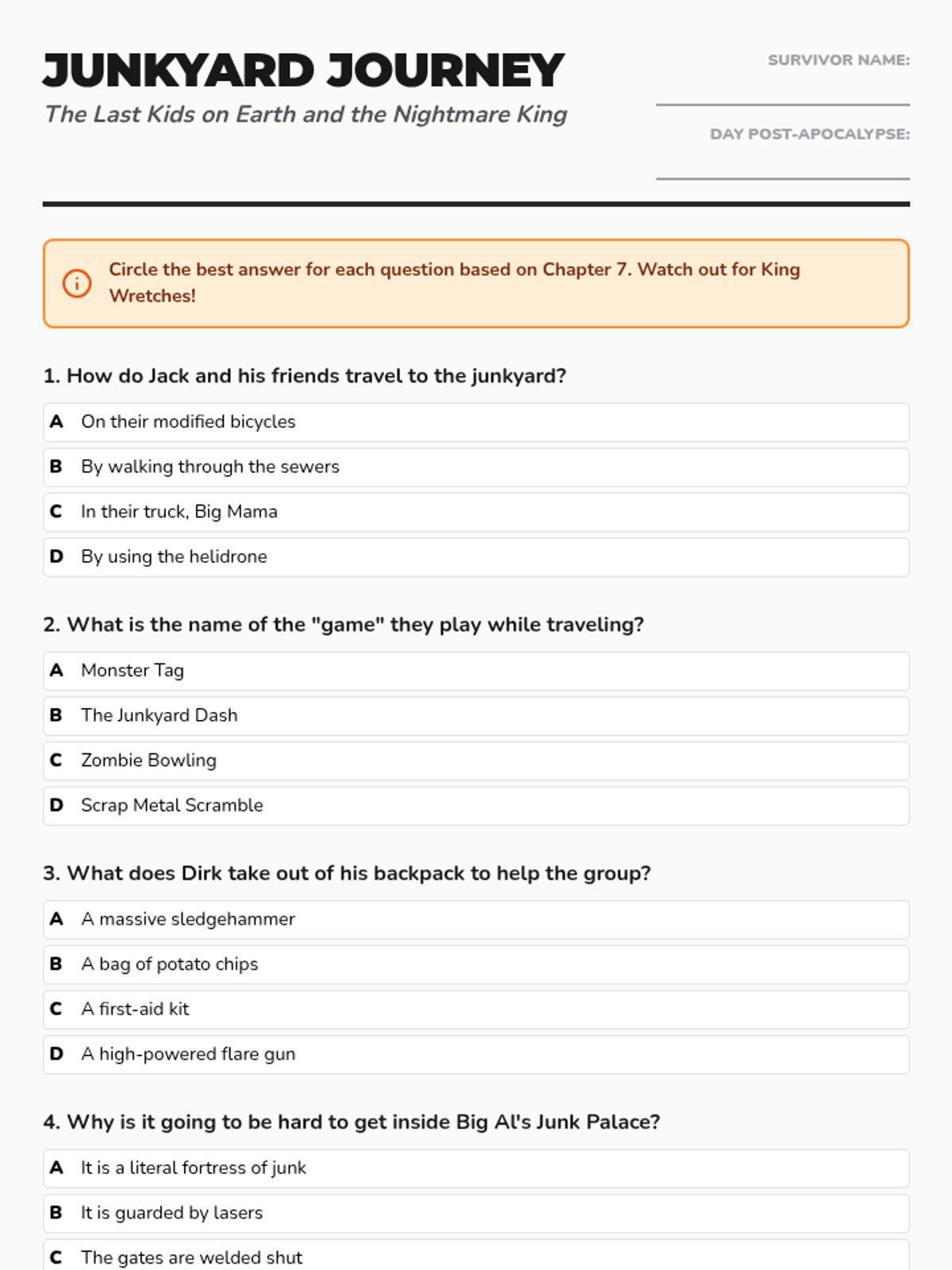 A reading comprehension sequence based on Chapter 7 of 'The Last Kids on Earth and the Nightmare King'. Students will explore character motivations, setting details, and plot developments through multiple-choice questions.