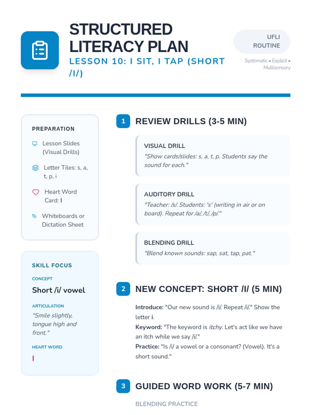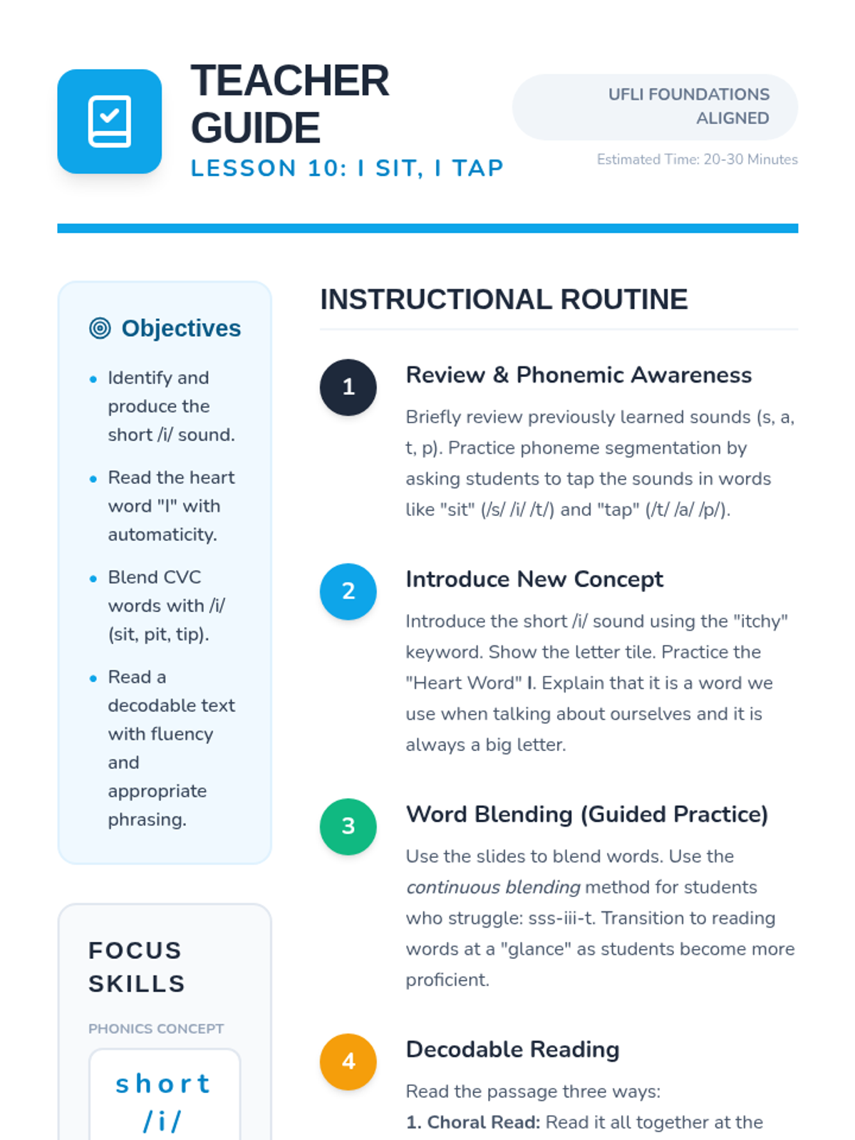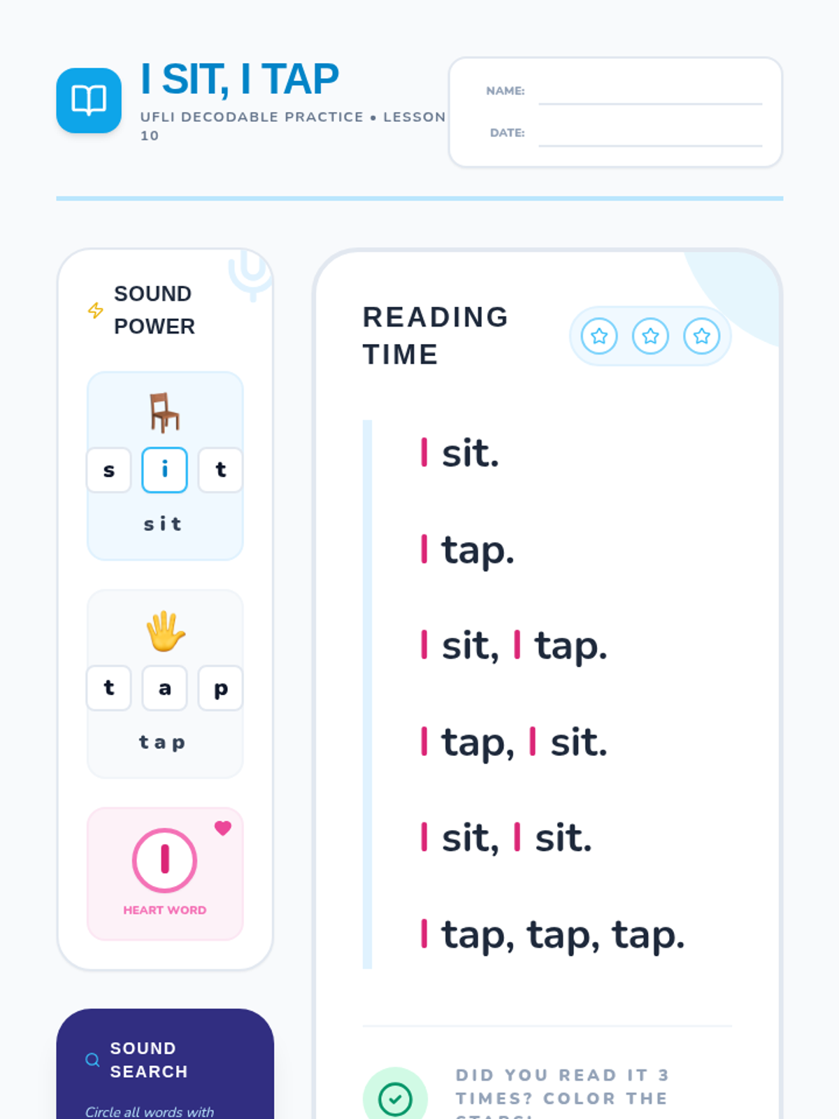 A collection of decodable passages and activities aligned with UFLI Foundations, focusing on systematic phonics and heart word acquisition. Each lesson centers on a specific phonics skill and accompanying "heart words" to build reading fluency.