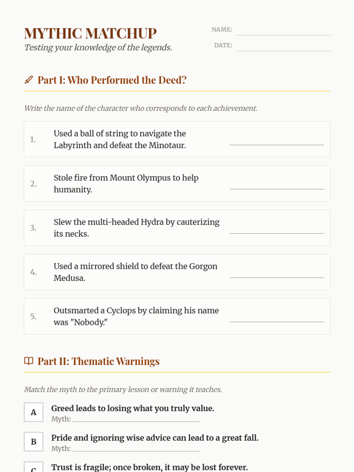 A comprehensive exploration of nine foundational Ancient Greek myths, focusing on their themes, characters, and cultural significance. Students will analyze legendary heroes and gods through summaries, visual presentations, and engaging activities.