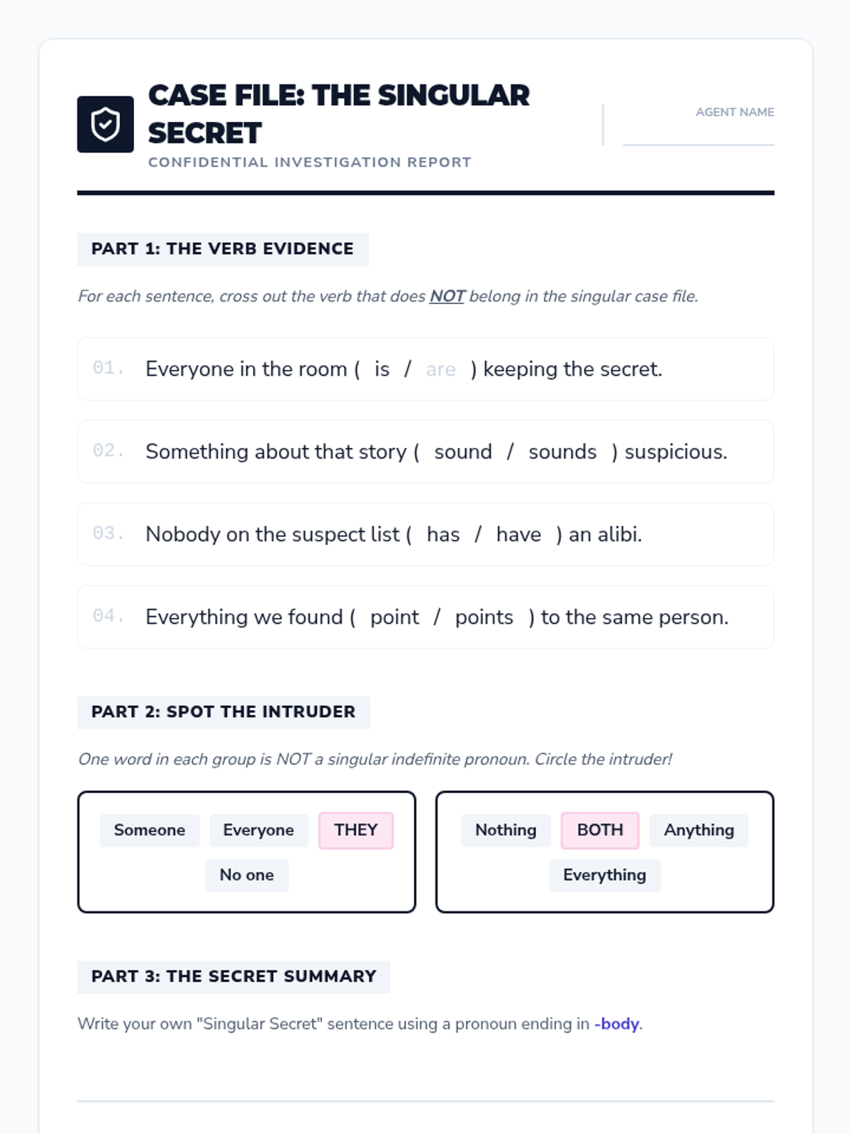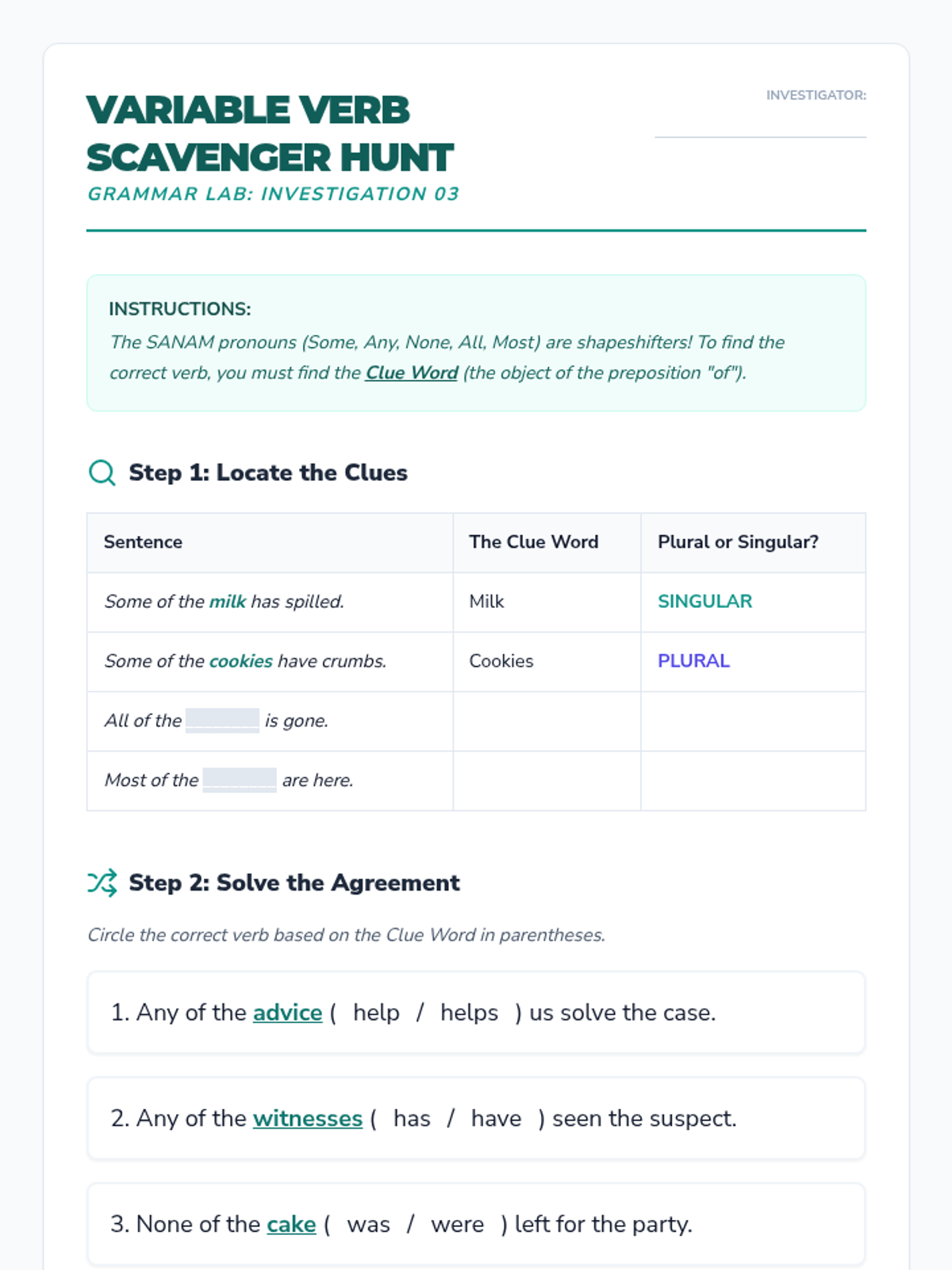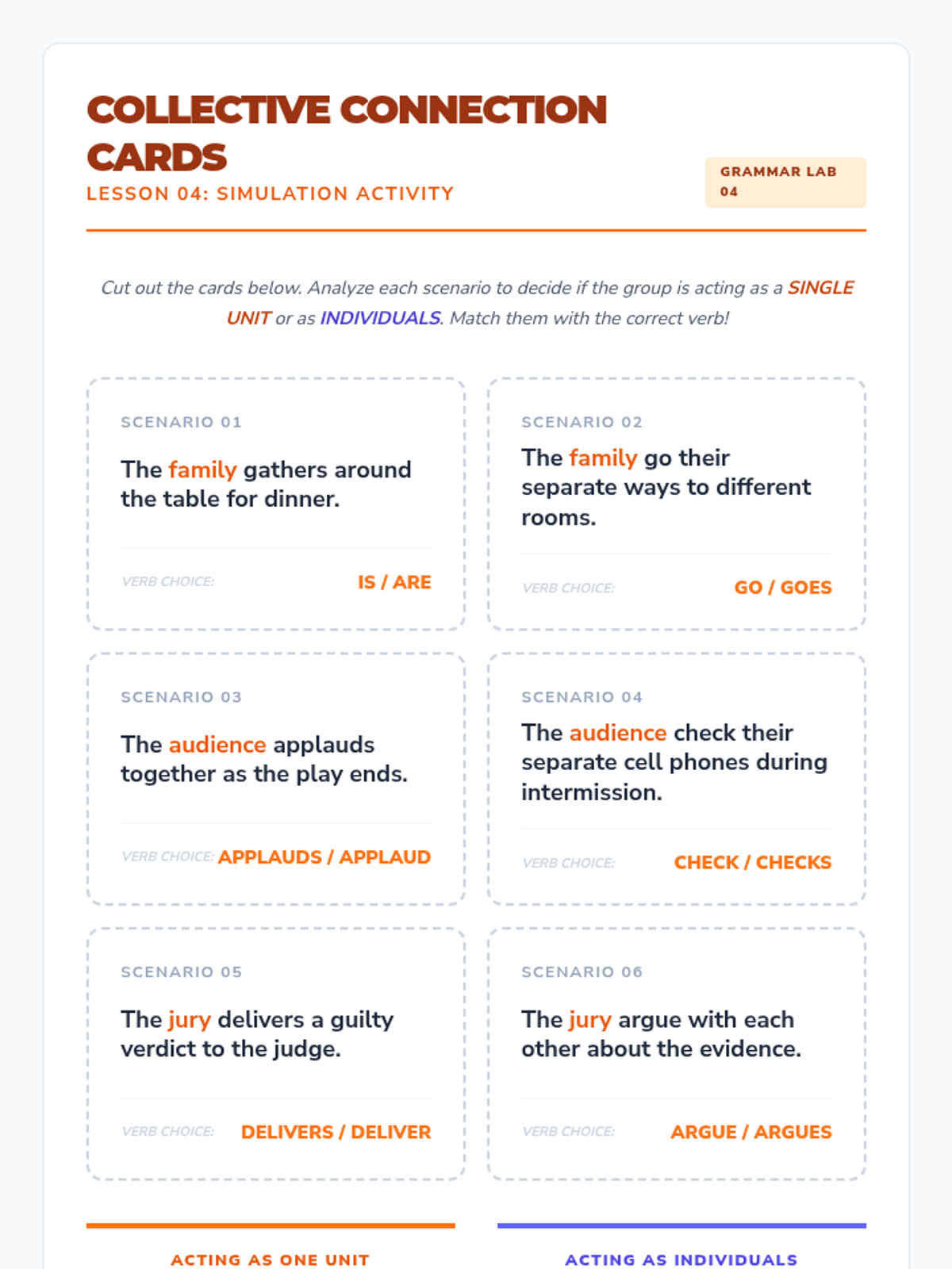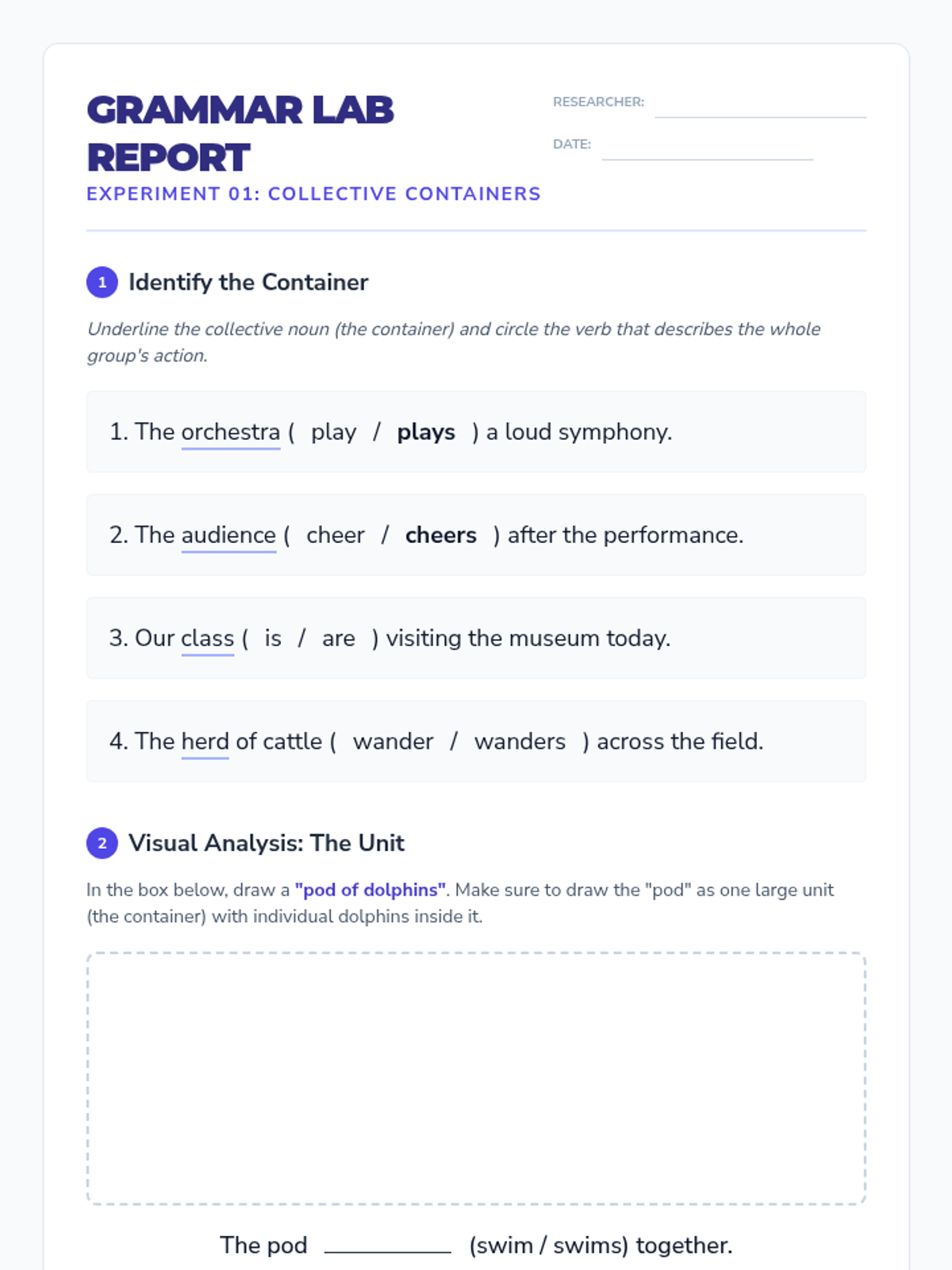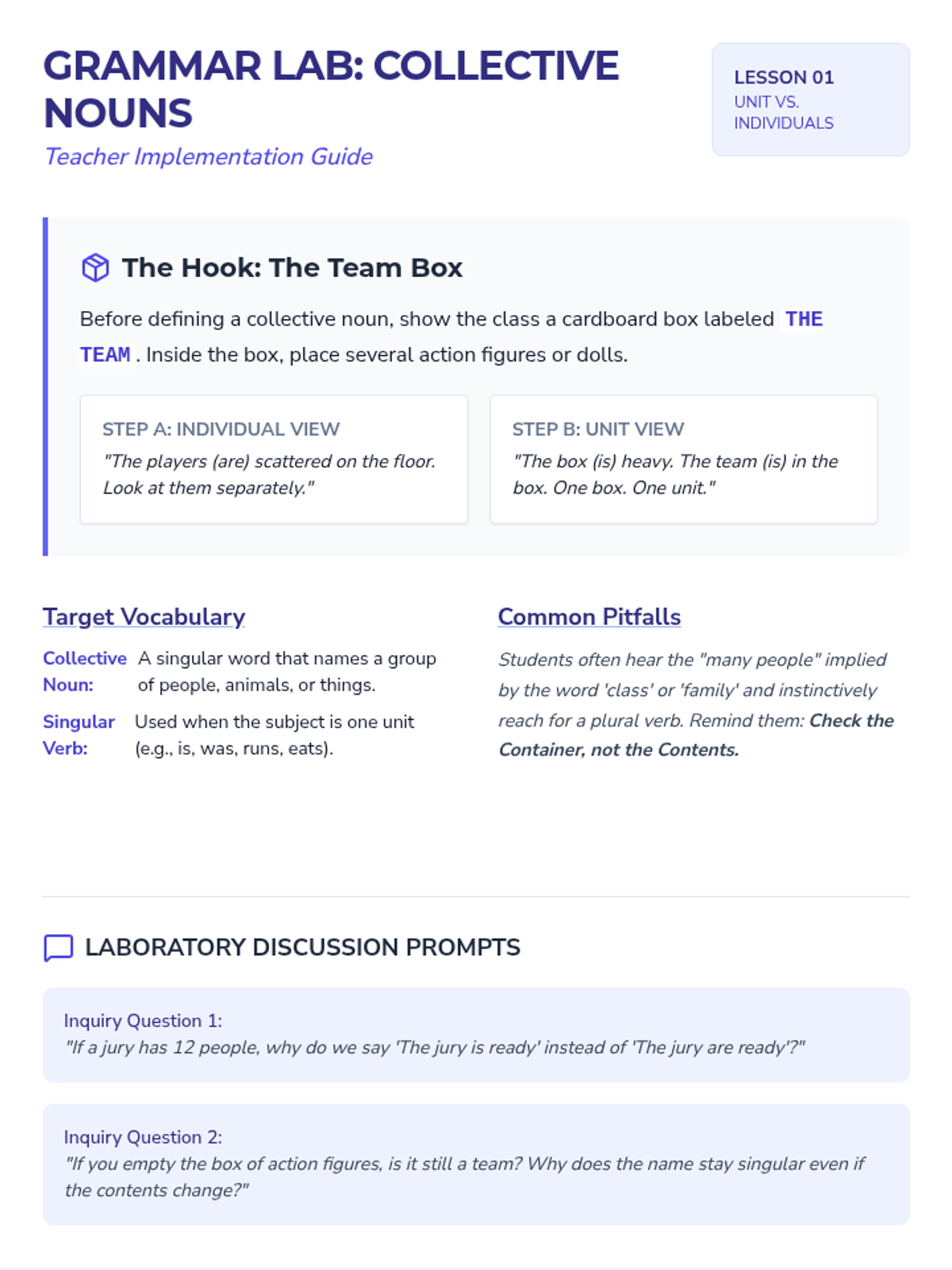 A 5th-grade grammar sequence focusing on the nuances of collective nouns and indefinite pronouns through a 'Grammar Lab' inquiry-based approach. Students investigate when groups act as a single unit and how various pronouns dictate verb agreement.