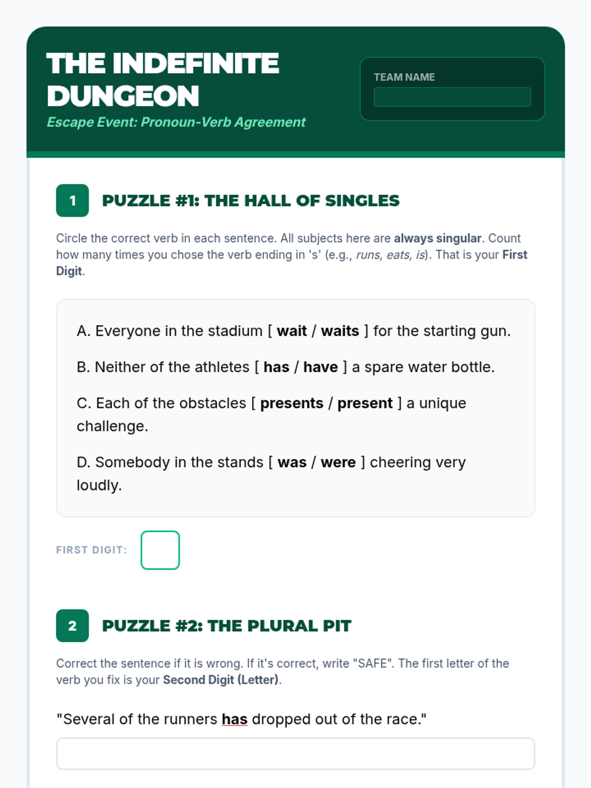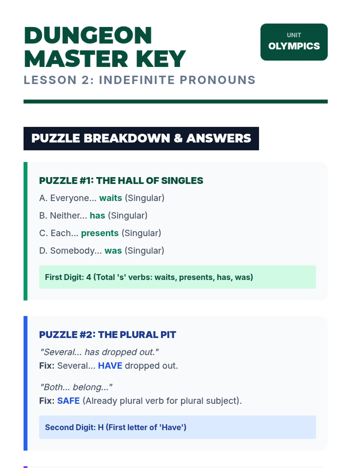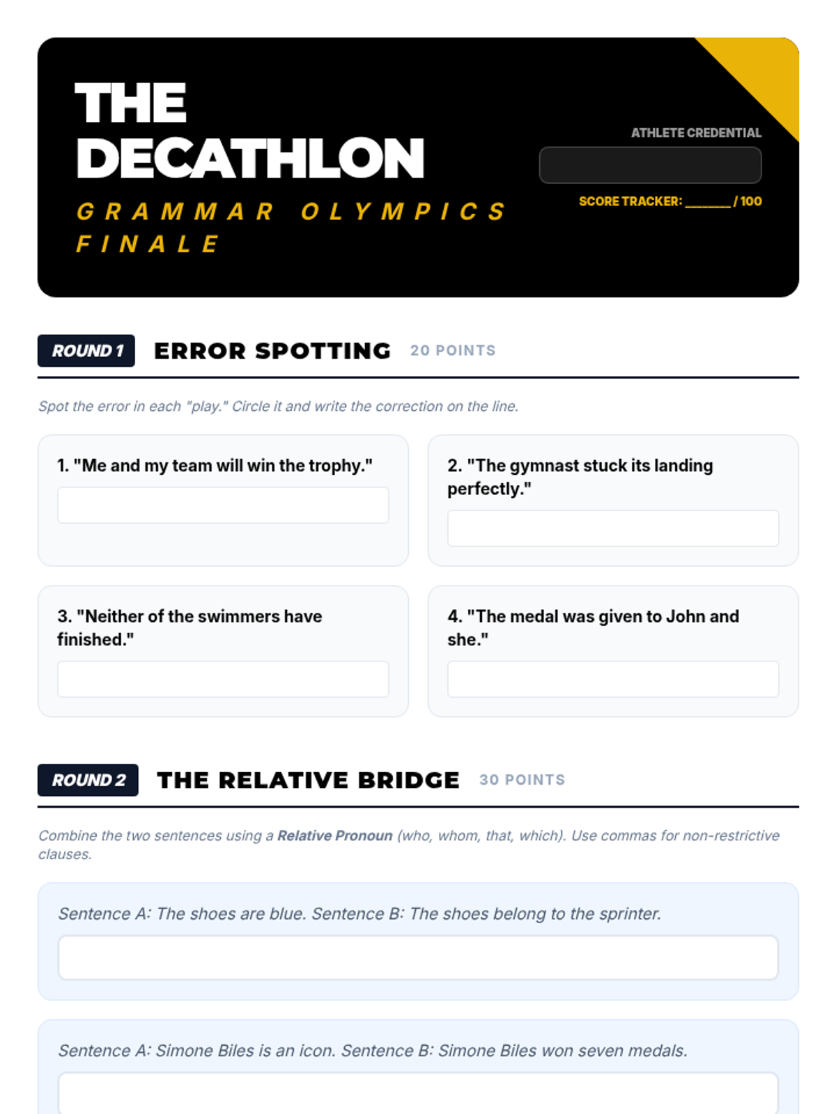A gamified grammar unit where students compete in 'Olympic' events to master personal, possessive, indefinite, and relative pronouns. The sequence emphasizes speed, accuracy, and grammatical justification through a series of high-energy, collaborative challenges.