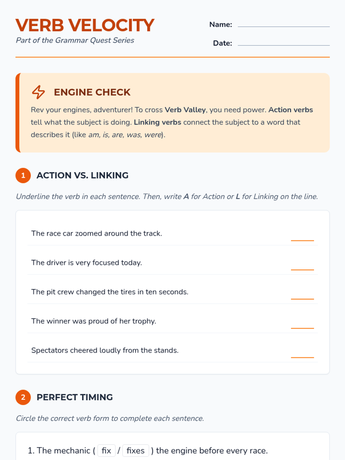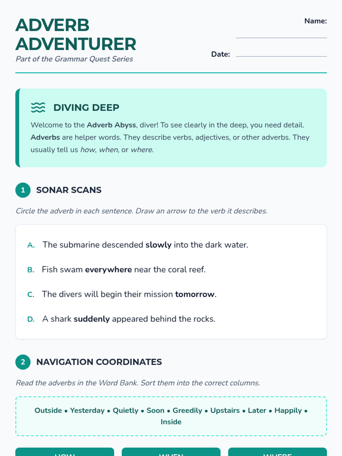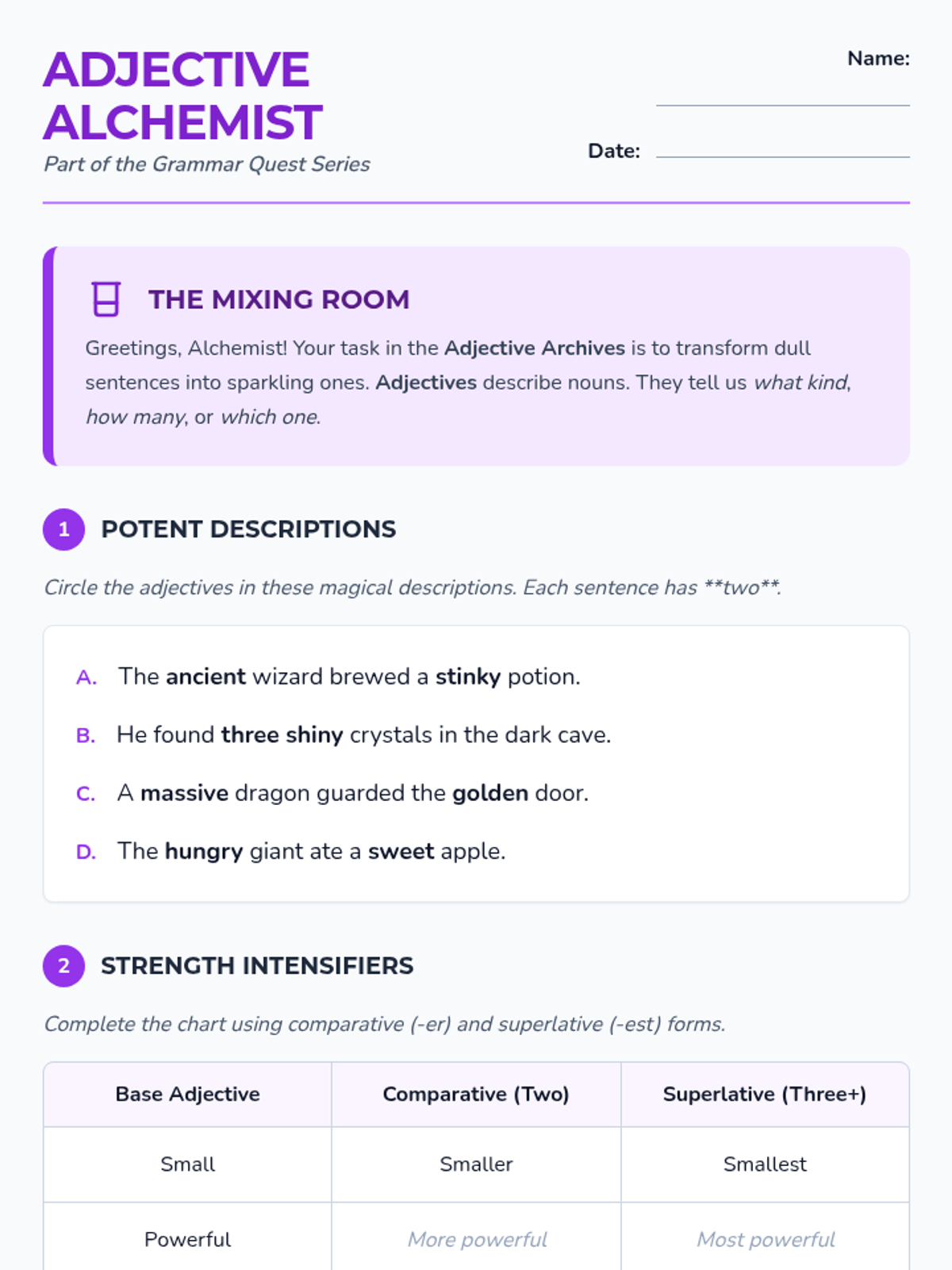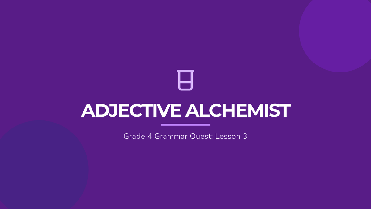 A comprehensive 4th-grade grammar unit focusing on the four primary parts of speech: nouns, verbs, adjectives, and adverbs. Through an adventure-themed quest, students master identifying and using these word classes in their writing.