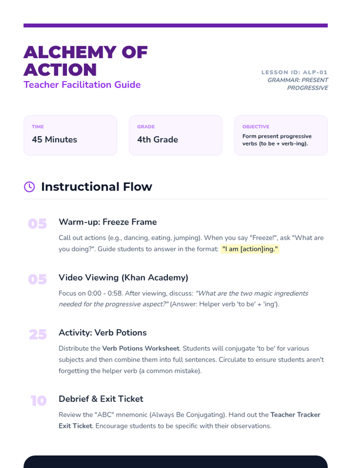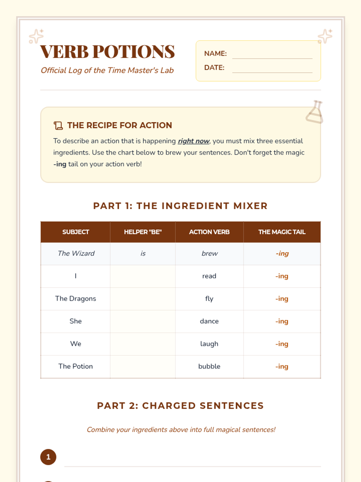 A comprehensive 4-part grammar unit for 4th grade focusing on verb tenses (Simple and Continuous) through the lens of a Time Travel Academy. Students learn to navigate the 'Now Zone', 'Yesterday Yard', and 'Tomorrow Trail' to master grammar.