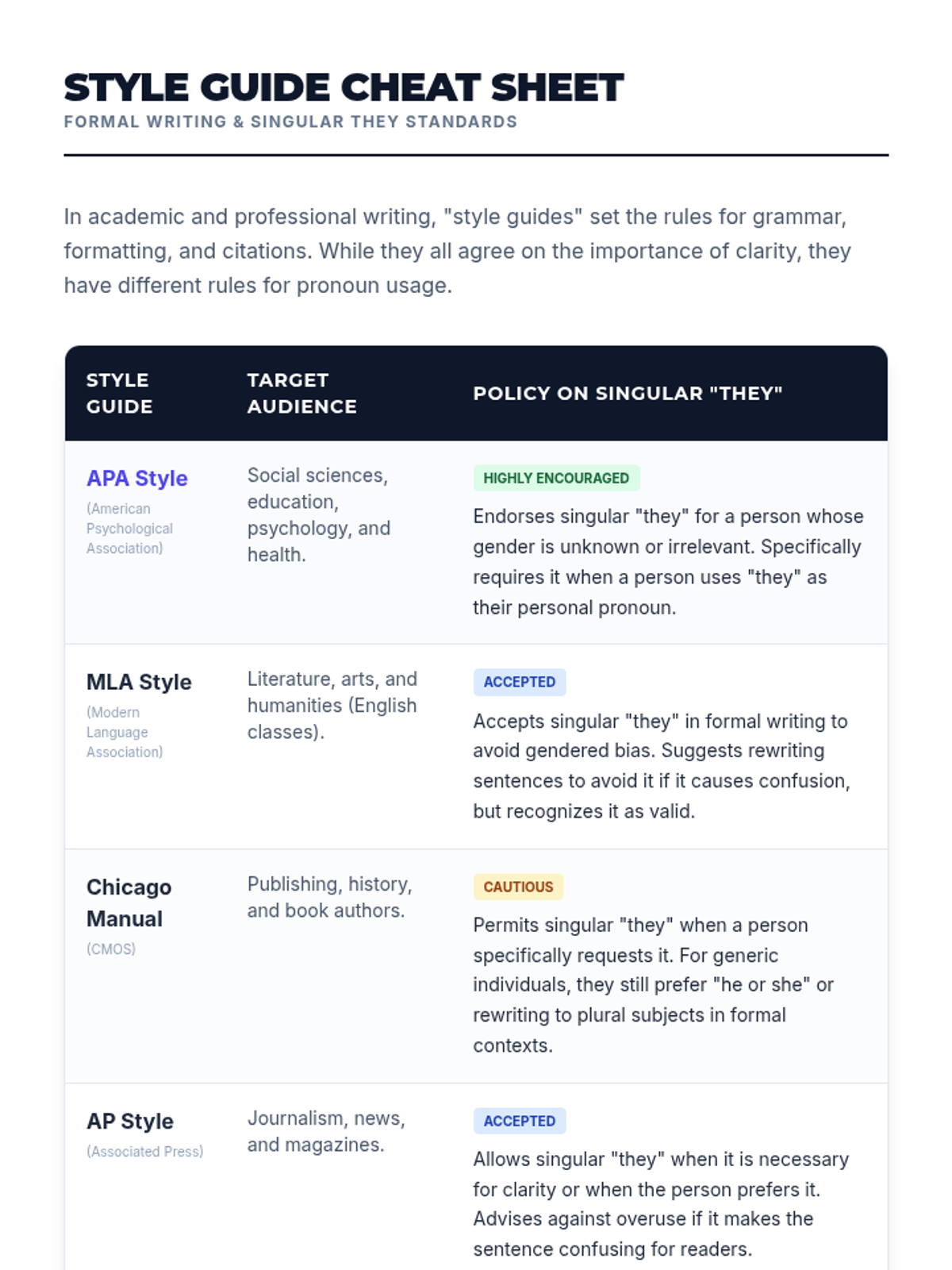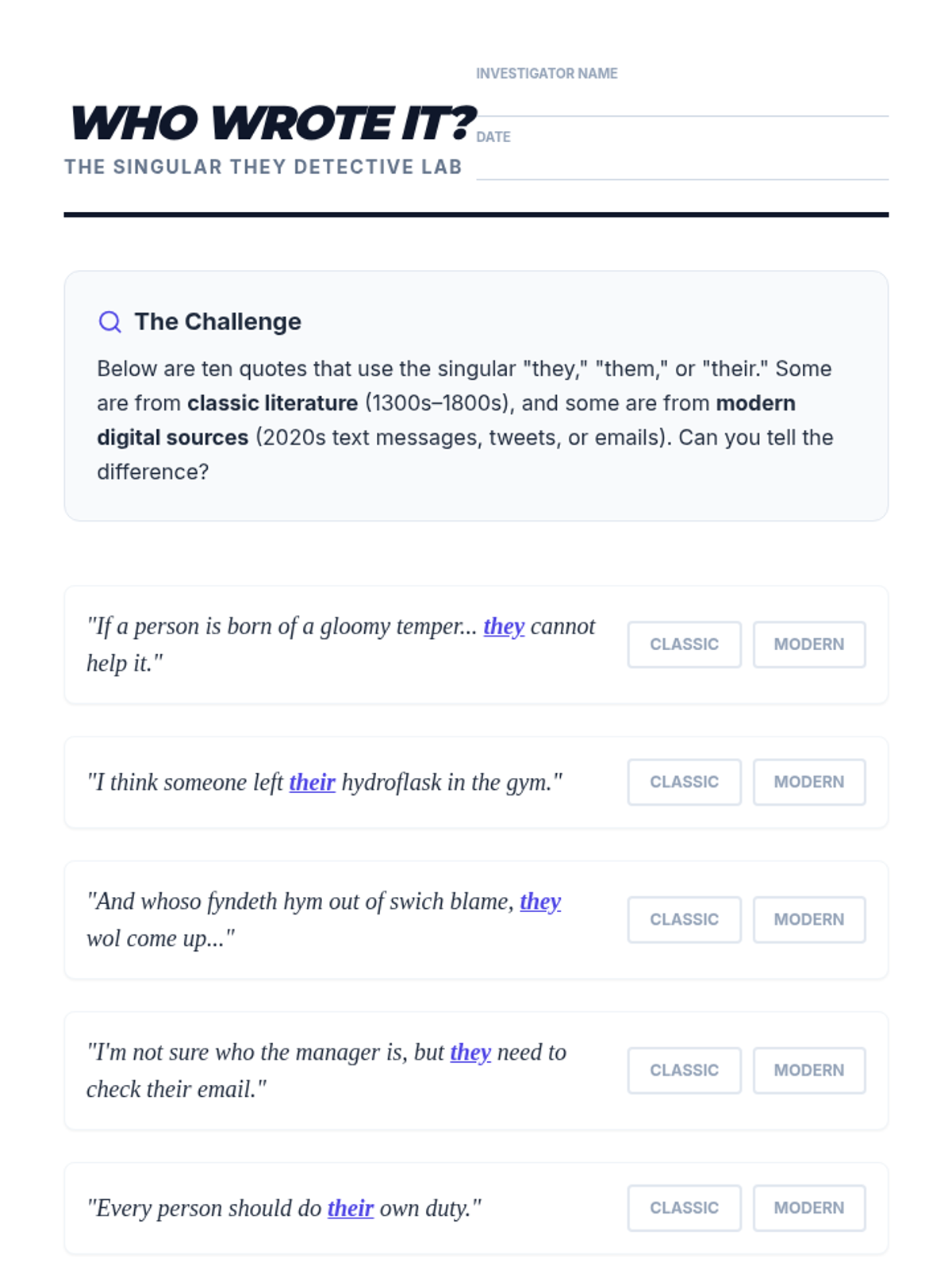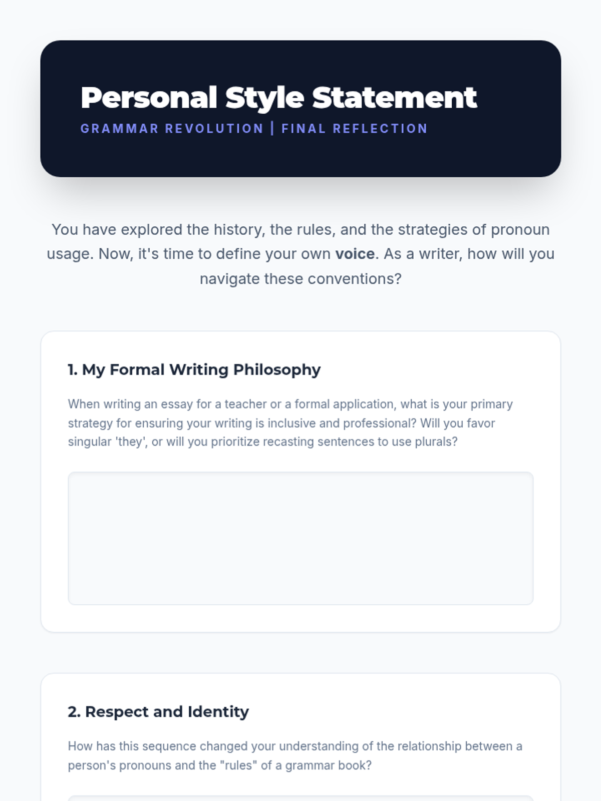 This inquiry-based sequence explores the evolving landscape of pronoun usage, specifically focusing on the singular 'they' and gender-neutral language. Students investigate historical prescriptions, modern style guide updates, and practical strategies for inclusive writing.
