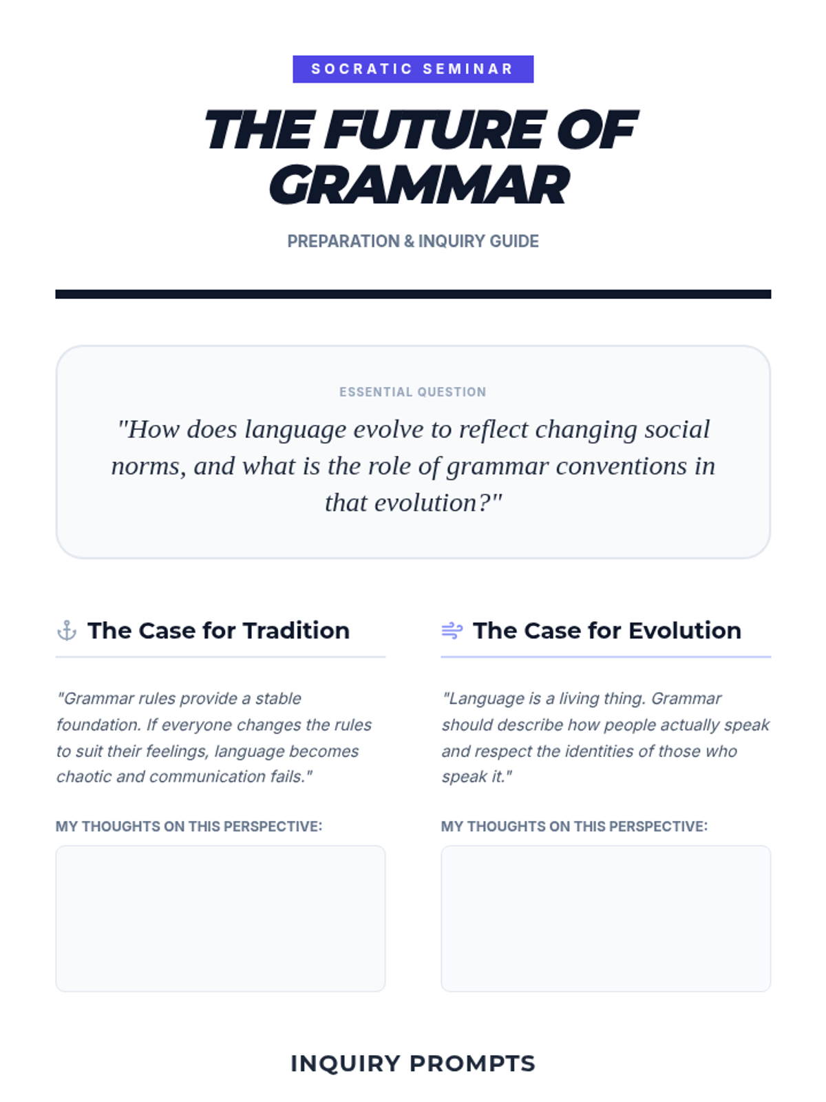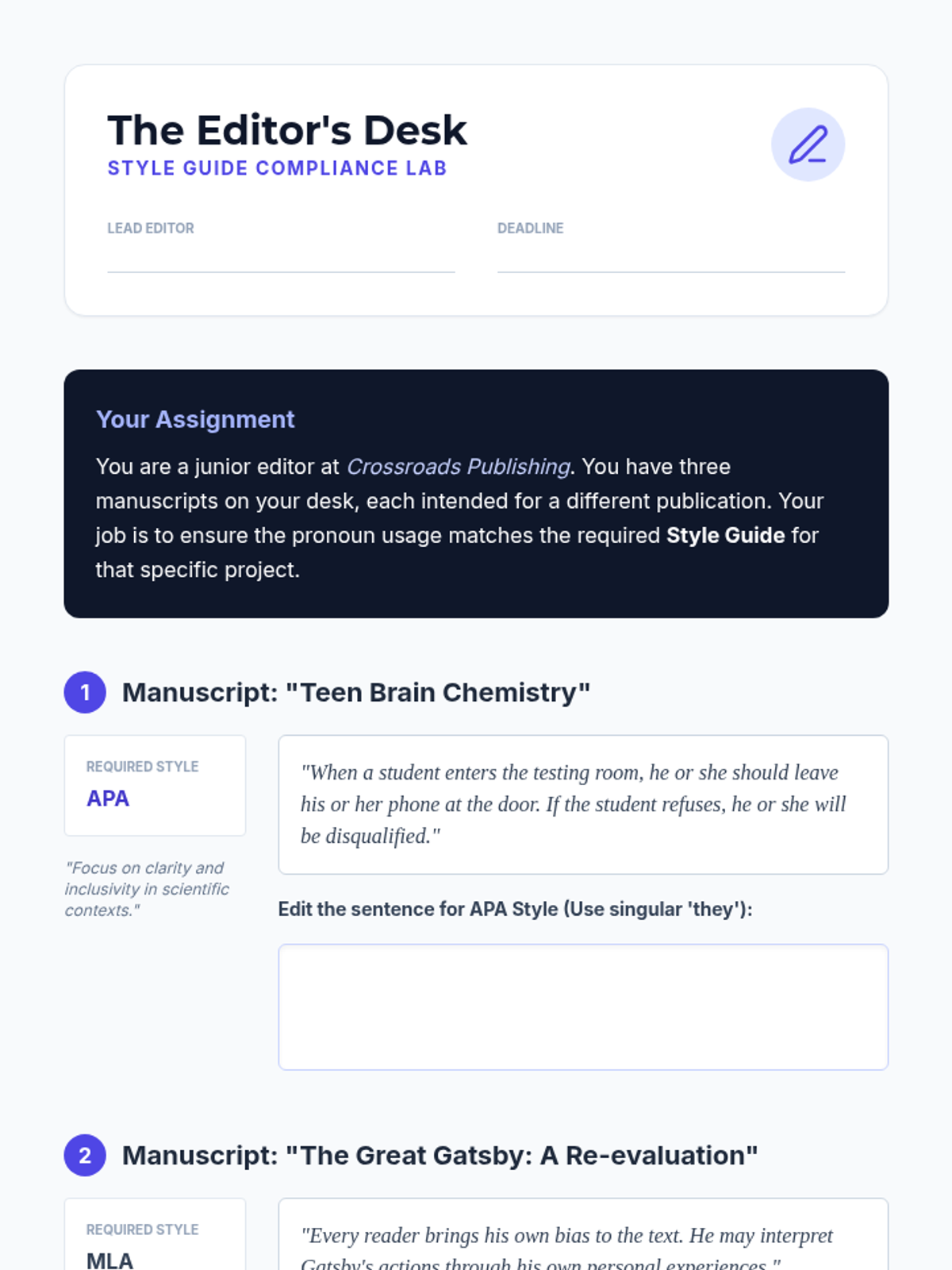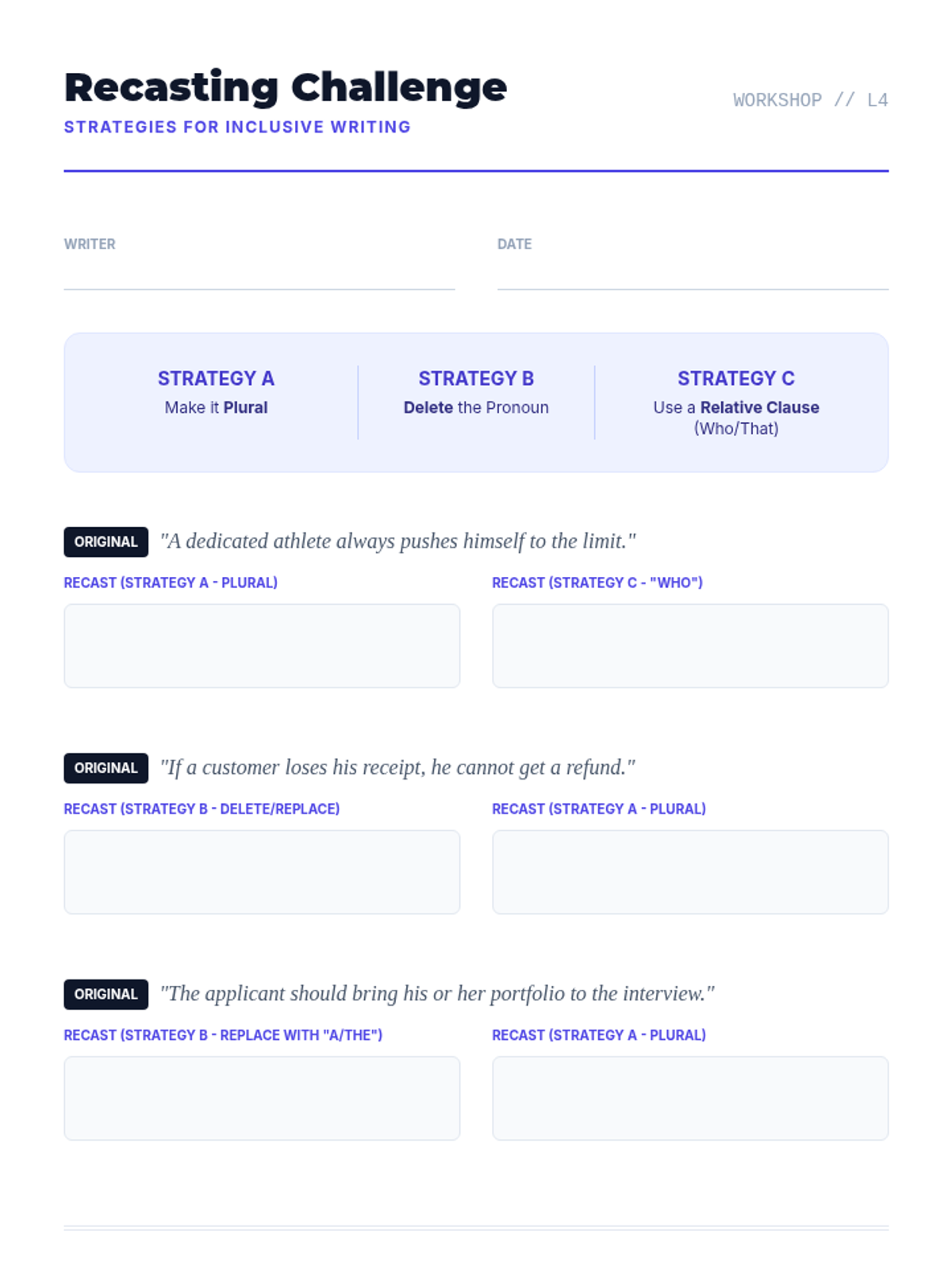 This inquiry-based sequence explores the evolving landscape of pronoun usage, specifically focusing on the singular 'they' and gender-neutral language. Students investigate historical prescriptions, modern style guide updates, and practical strategies for inclusive writing.
