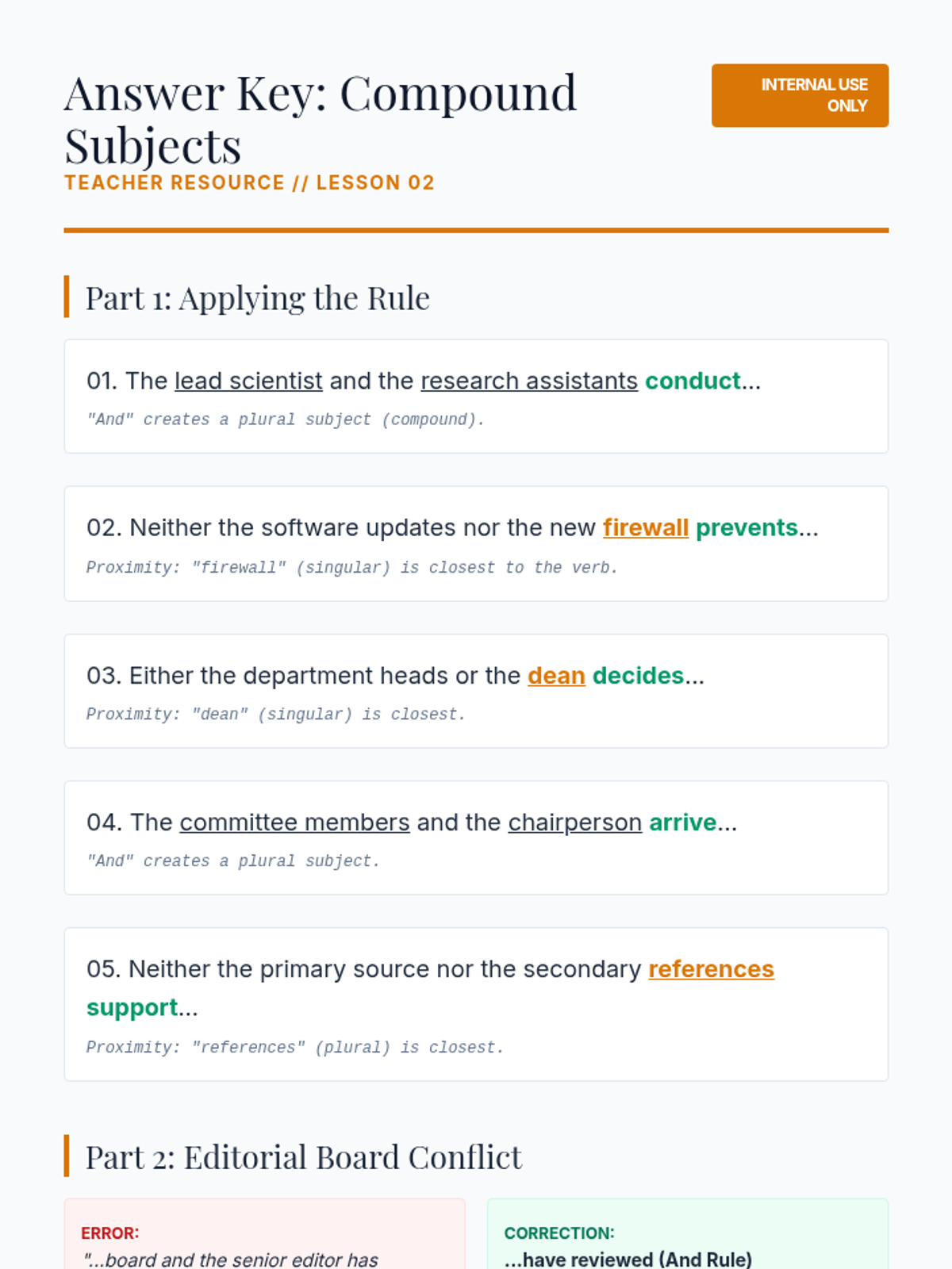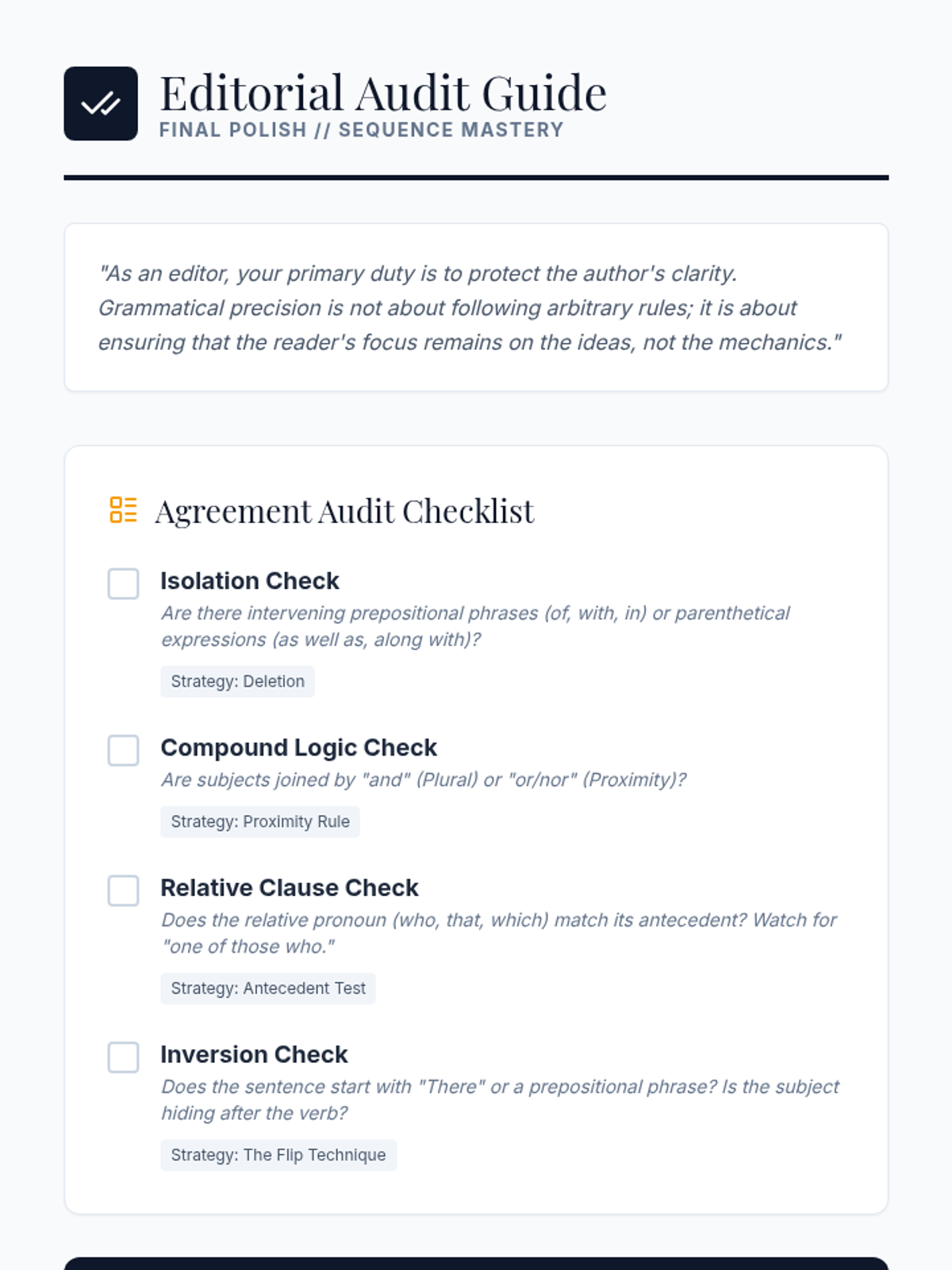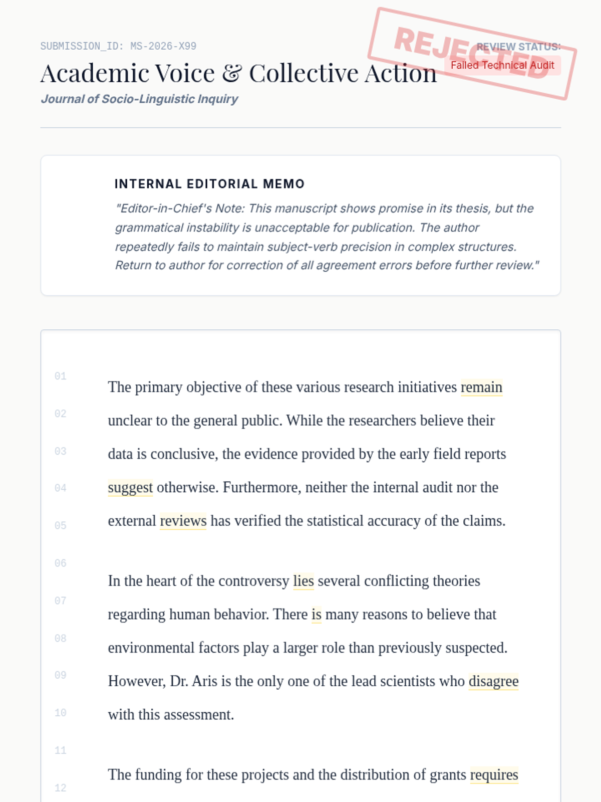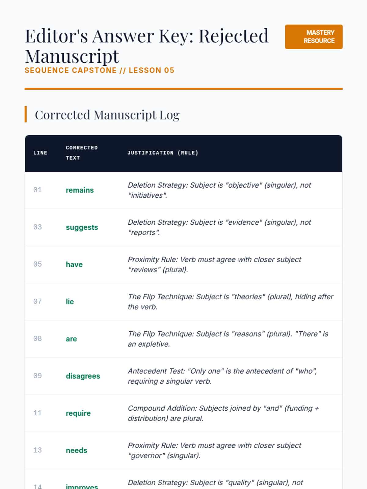 A high-level grammar sequence for 11th-grade students focused on identifying and correcting subtle subject-verb agreement errors in academic writing. Students use a workshop model to master complex sentence structures, compound subjects, and relative clauses, culminating in a peer-editing 'Editorial Board' simulation.