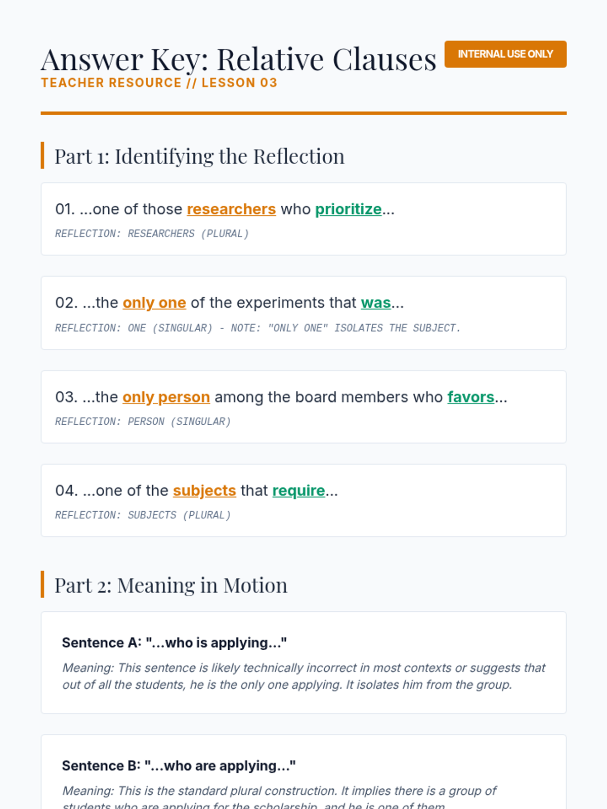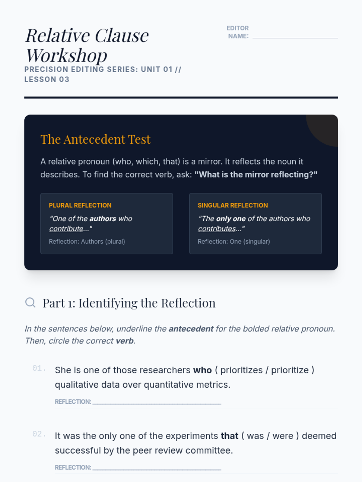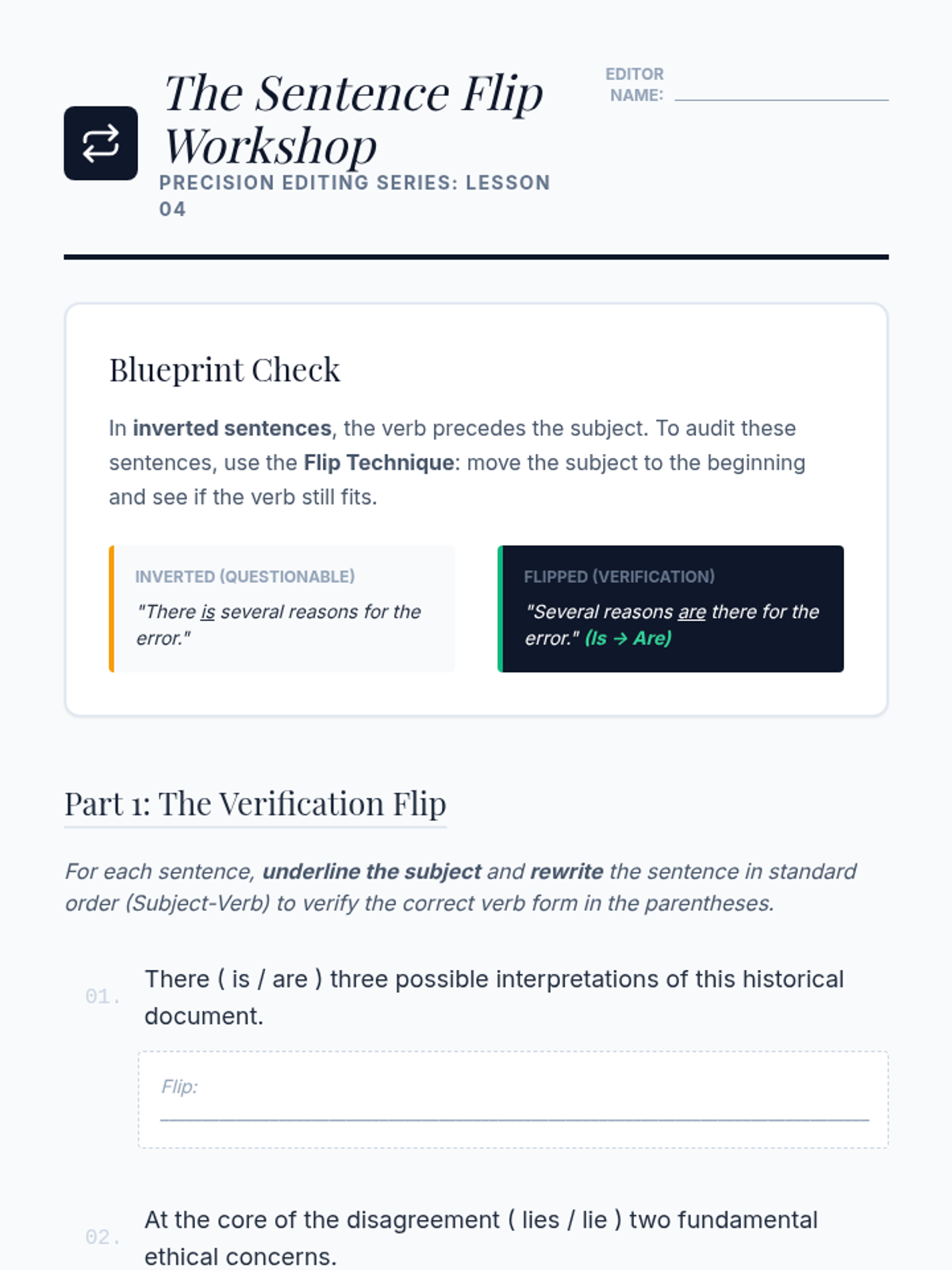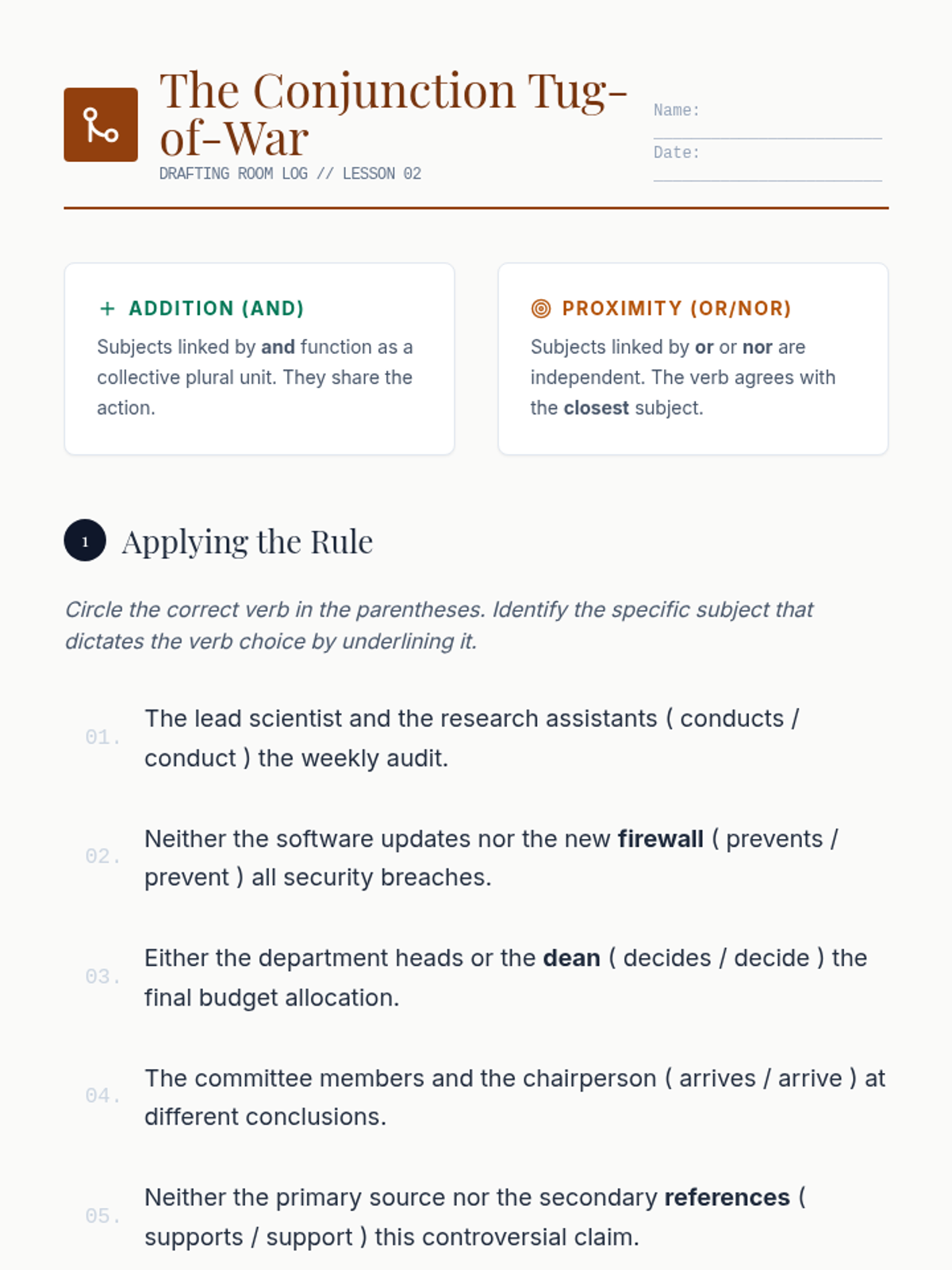 A high-level grammar sequence for 11th-grade students focused on identifying and correcting subtle subject-verb agreement errors in academic writing. Students use a workshop model to master complex sentence structures, compound subjects, and relative clauses, culminating in a peer-editing 'Editorial Board' simulation.