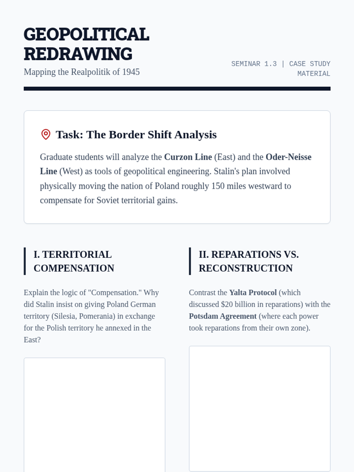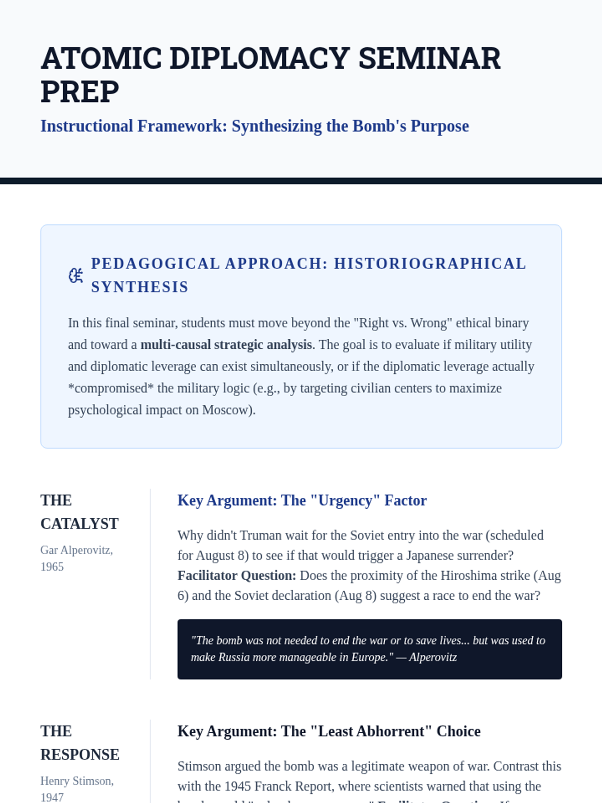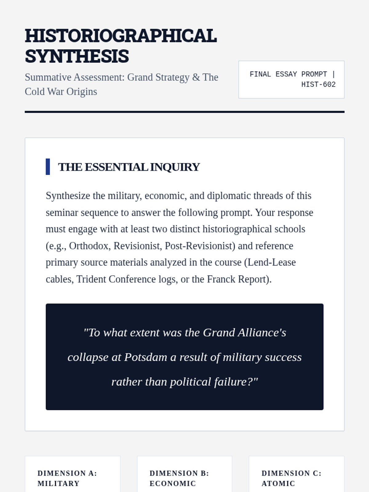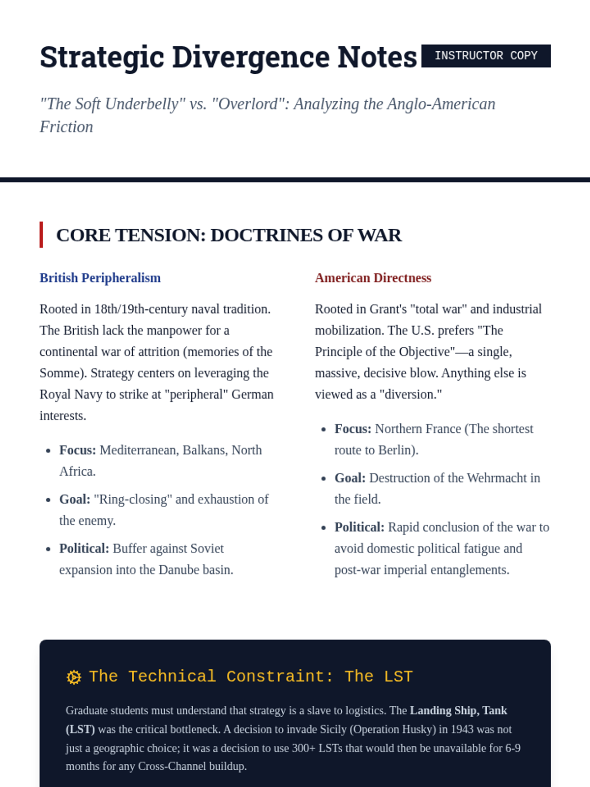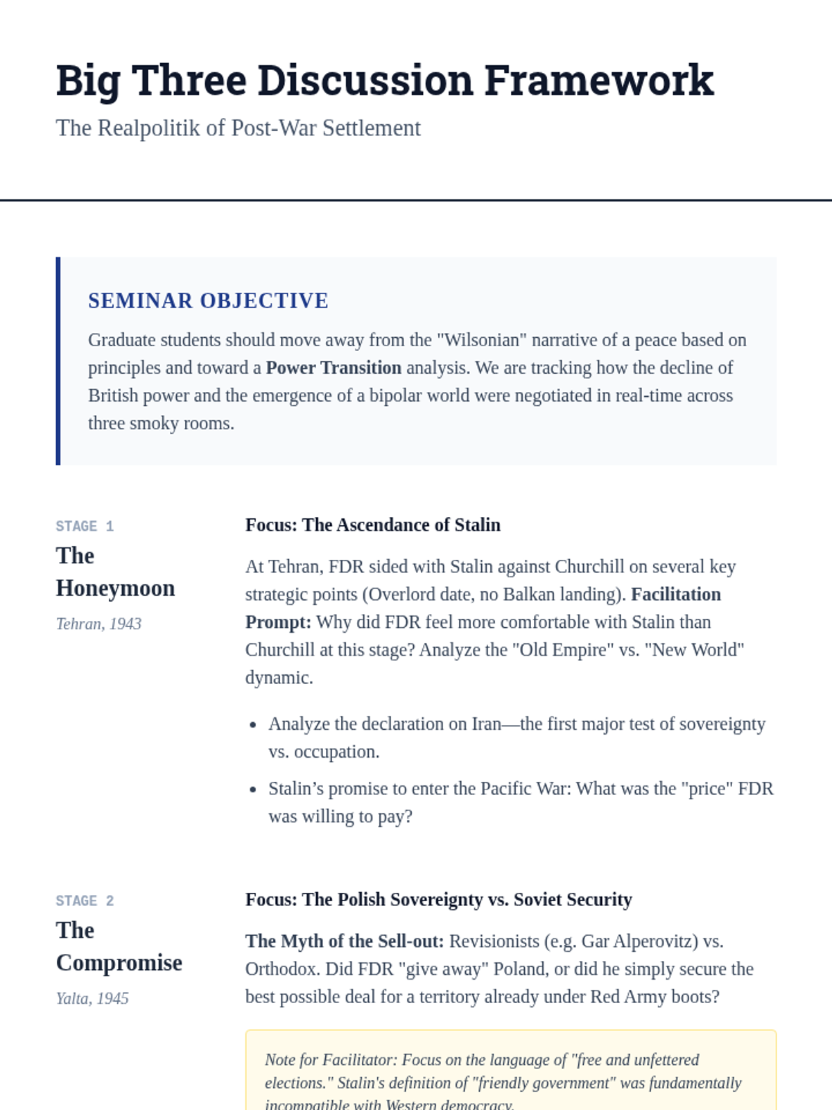 An advanced graduate seminar exploring the friction between military strategy and political ideology in the Allied coalition during WWII. The sequence examines how economic leverage, strategic debates, and diplomatic conferences shaped the post-war world.