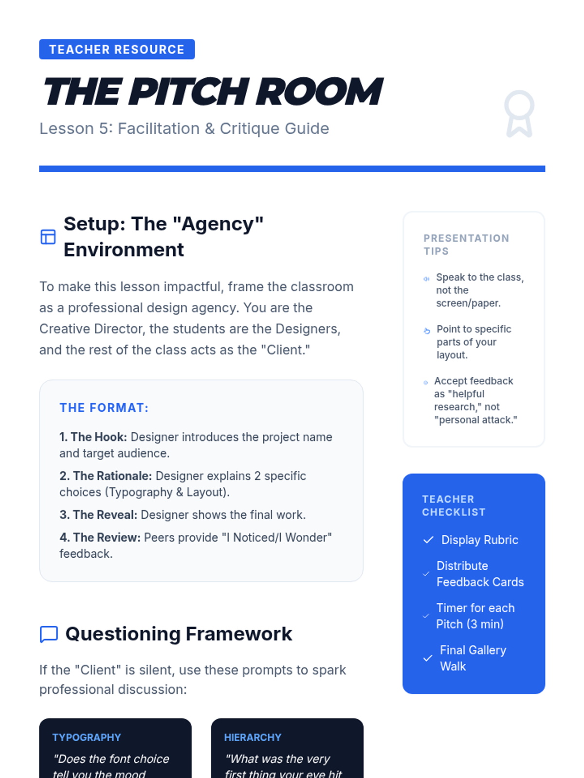 A comprehensive introduction to graphic design and typography for 6th grade, focusing on how visual elements communicate mood, hierarchy, and meaning. Students transition from analyzing font psychology to creating their own balanced layouts and logos, culminating in a professional-style client pitch.