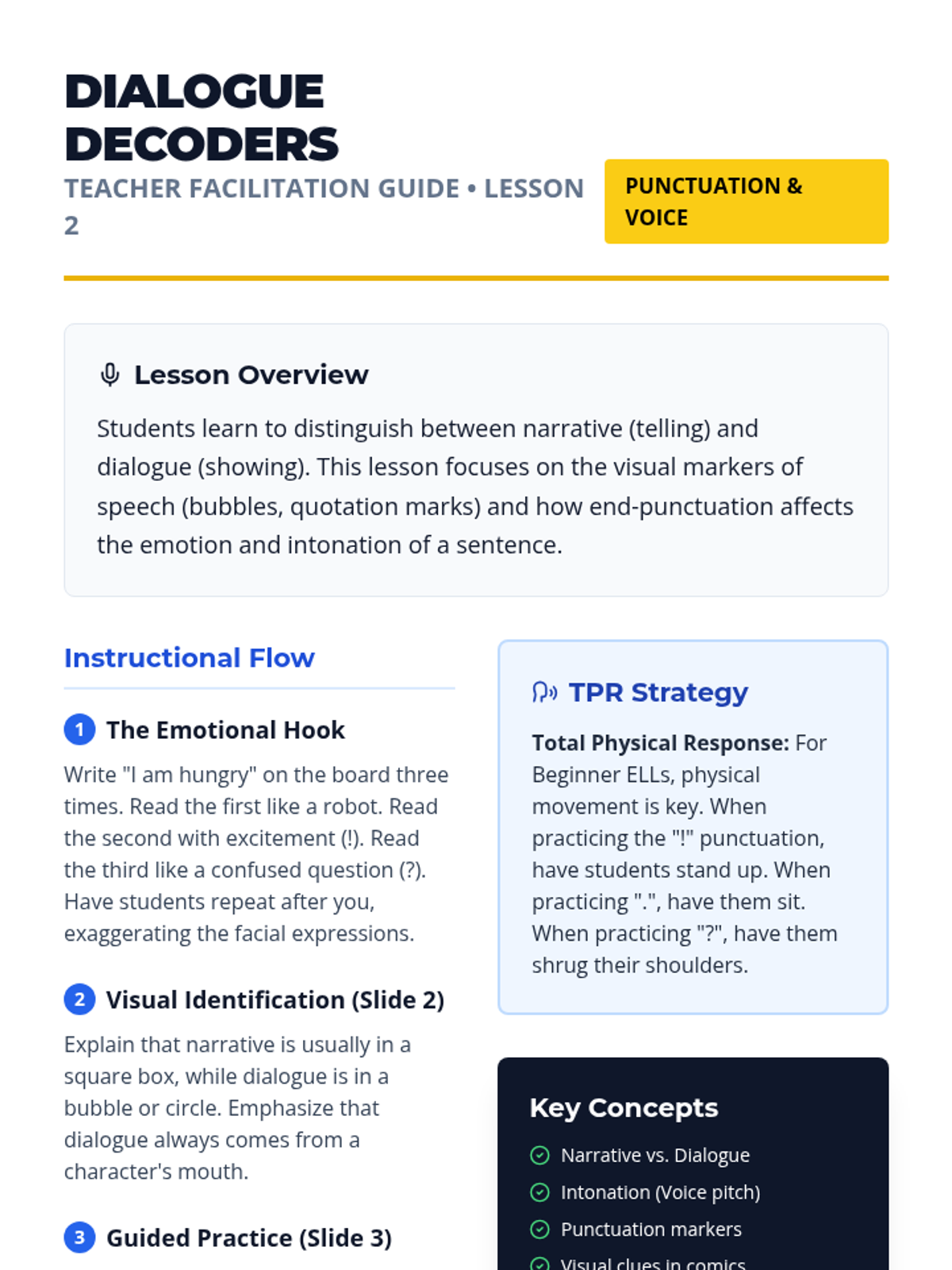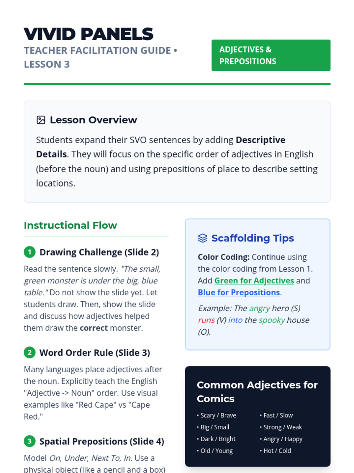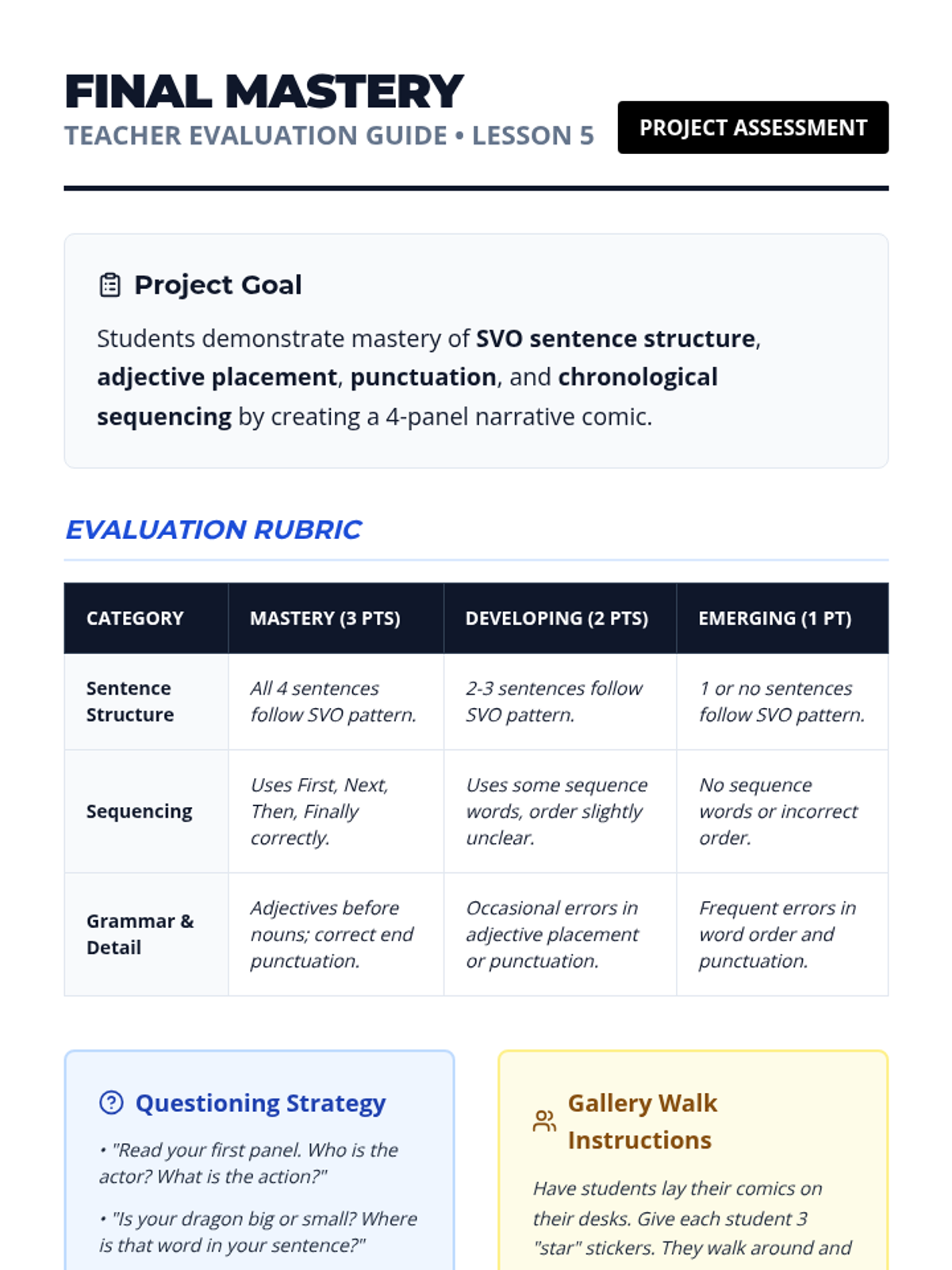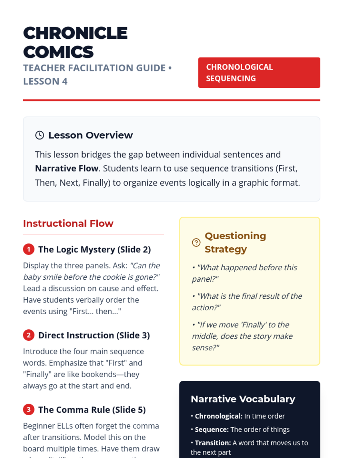 This sequence uses graphic novels and comics to teach 10th-grade Beginner ELL students basic English sentence structure (SVO), dialogue vs. narrative text, descriptive language, and chronological sequencing. Students move from visual interpretation to creating their own short narrative comic strips.