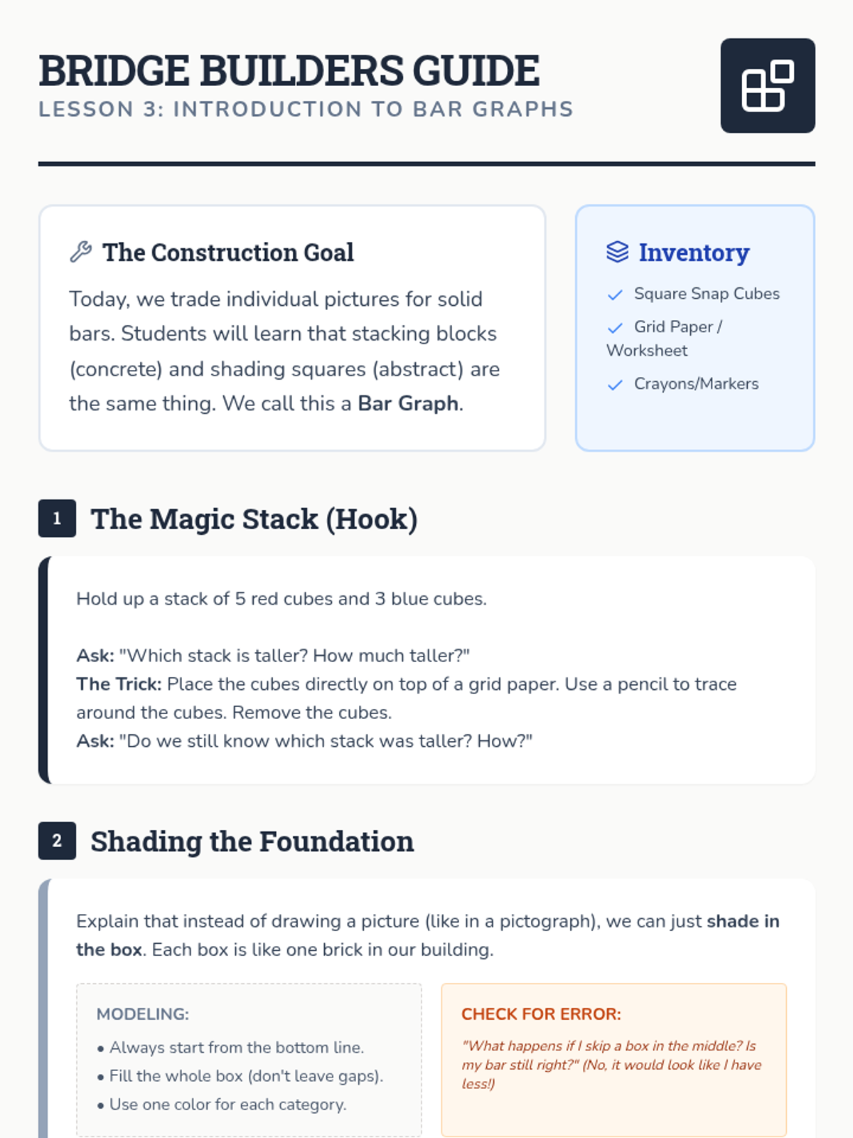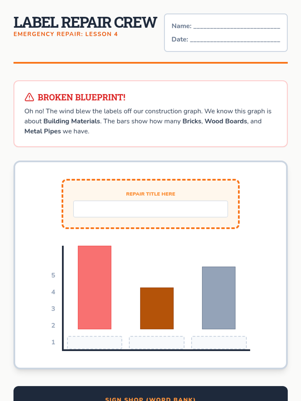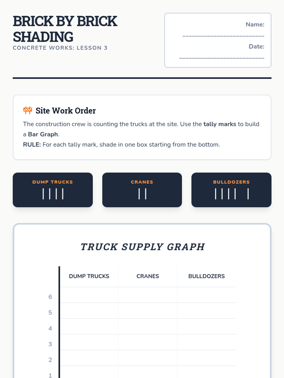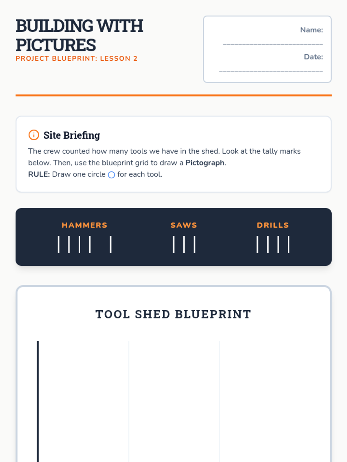 A construction-themed sequence where 1st graders learn to build and interpret pictographs and bar graphs through hands-on activities and visual representations.