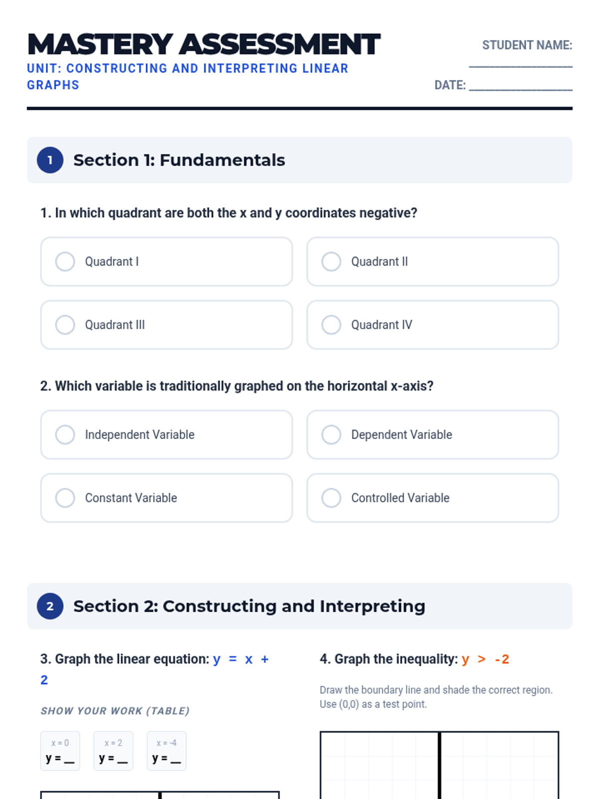 This sequence builds a foundational understanding of the coordinate plane as a tool for visualizing algebraic relationships. Students progress from navigating the four quadrants to graphing linear equations and inequalities, culminating in a mastery-based synthesis challenge.