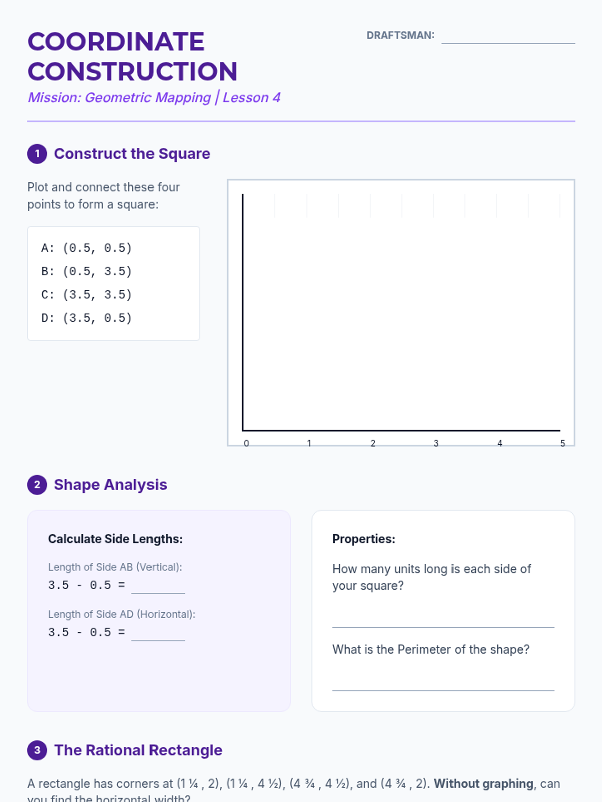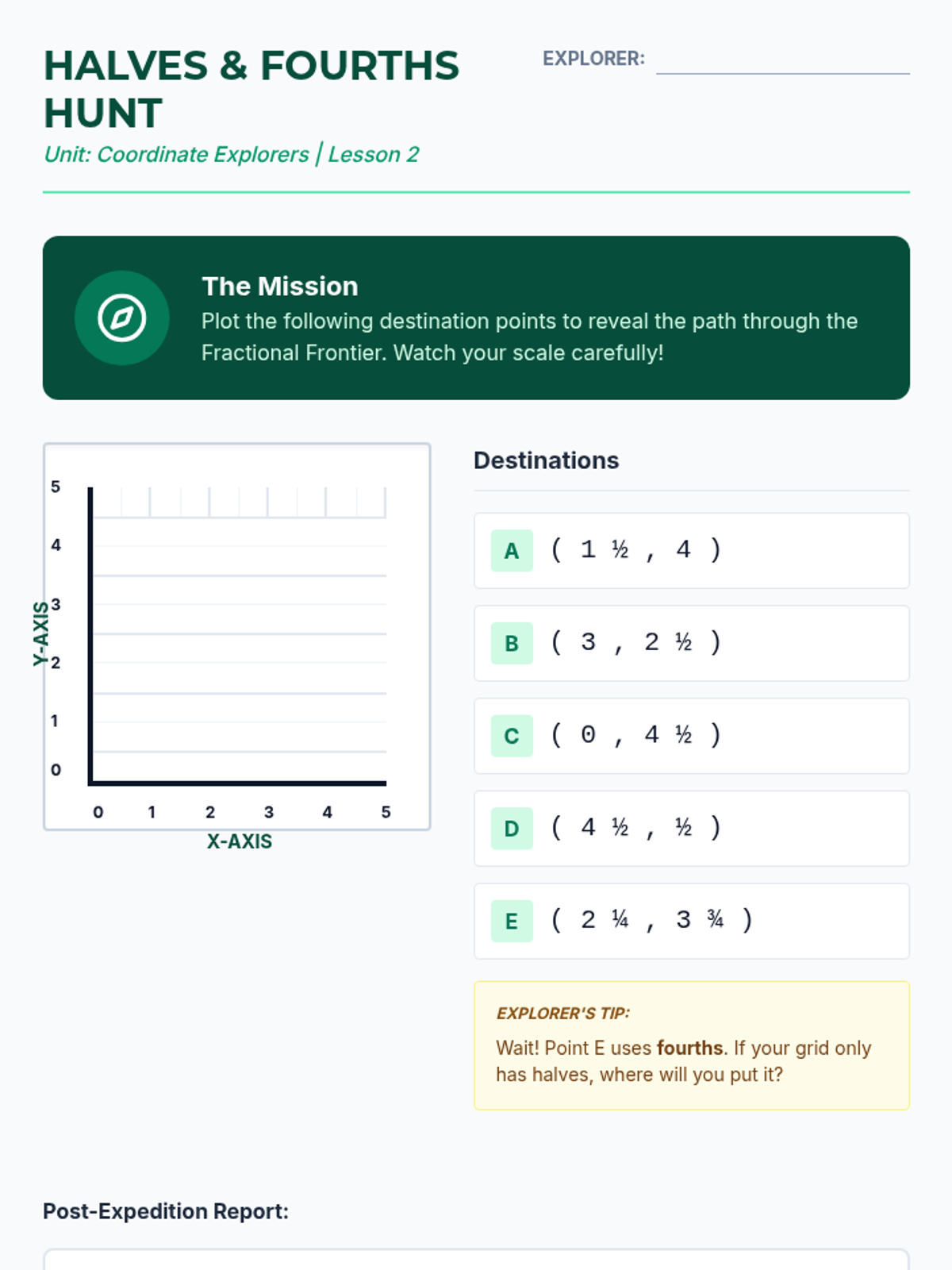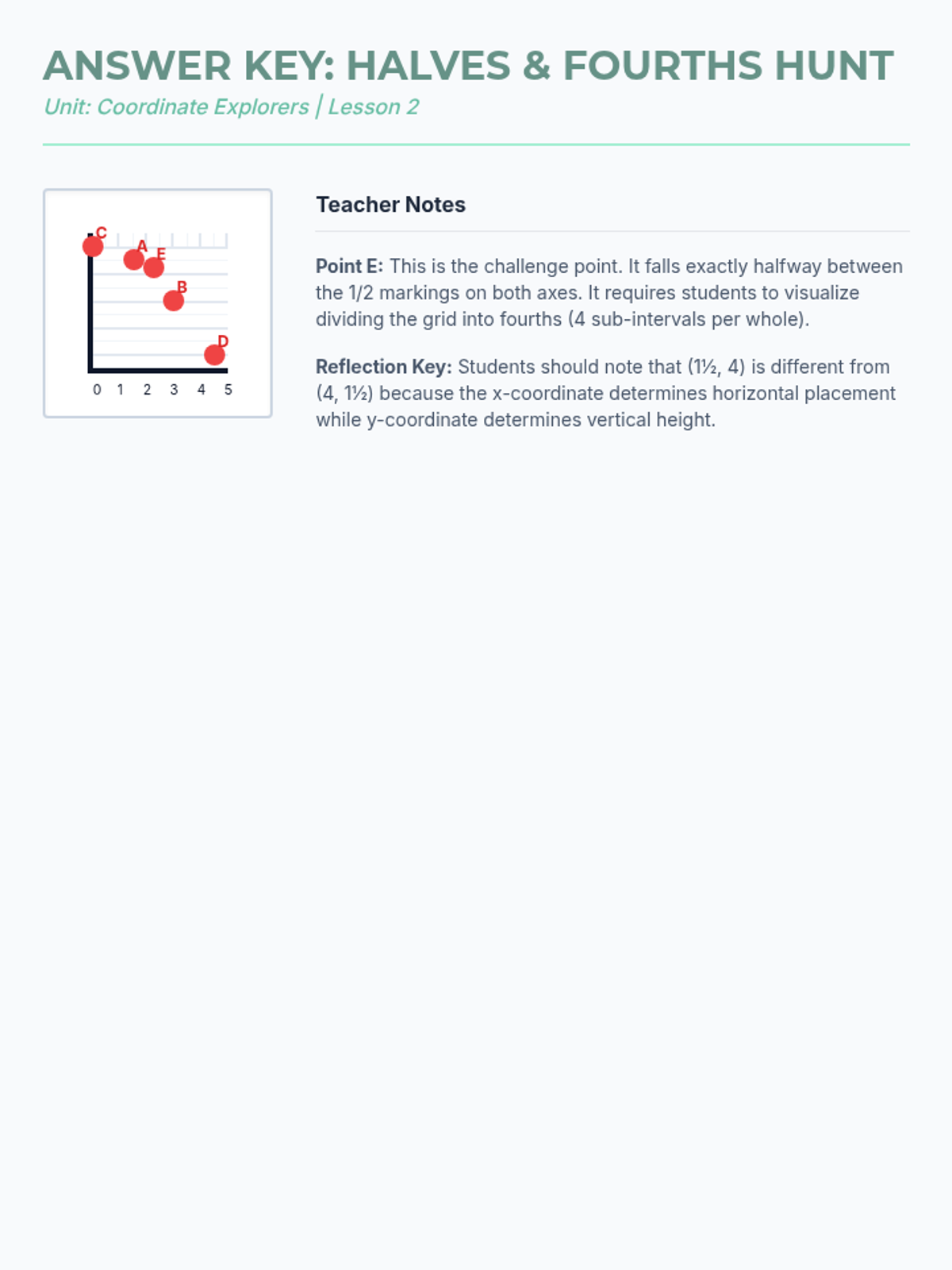 This sequence introduces 5th-grade students to the first quadrant of the coordinate plane, specifically focusing on plotting and reading rational numbers (fractions and decimals). Students will progress from building the axes to using coordinates for navigation, geometric analysis, and strategic gaming.