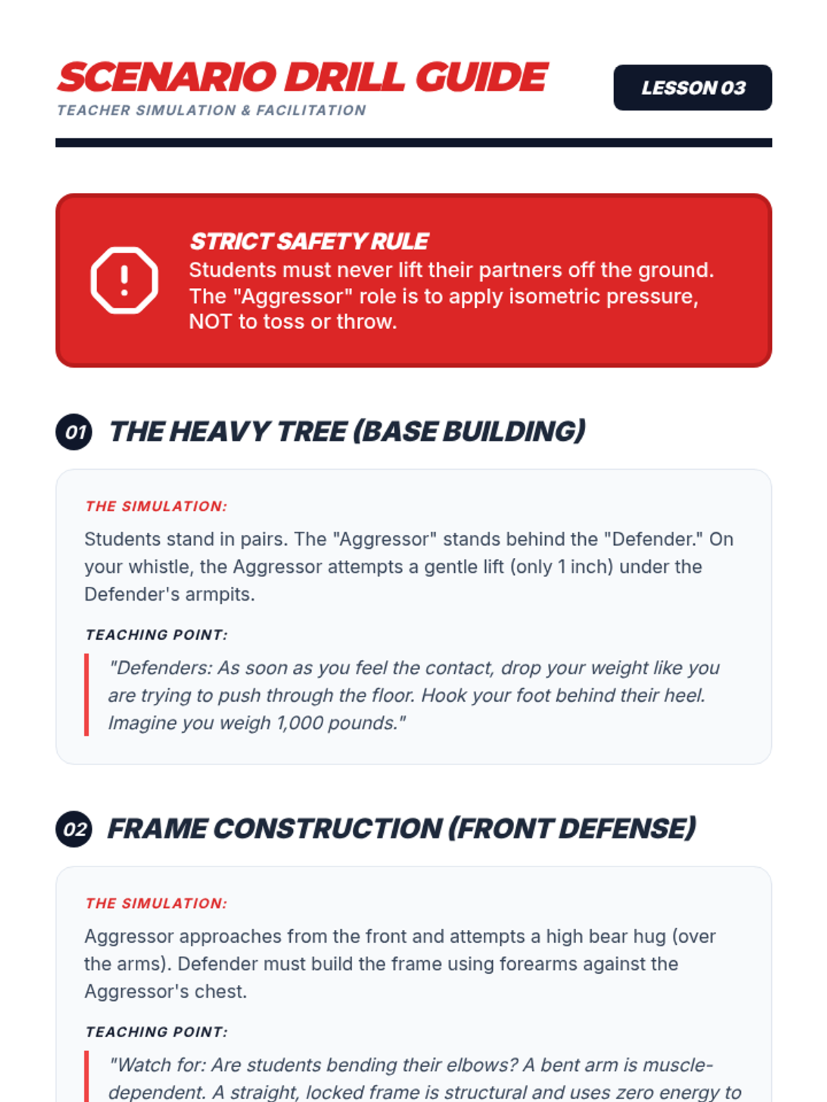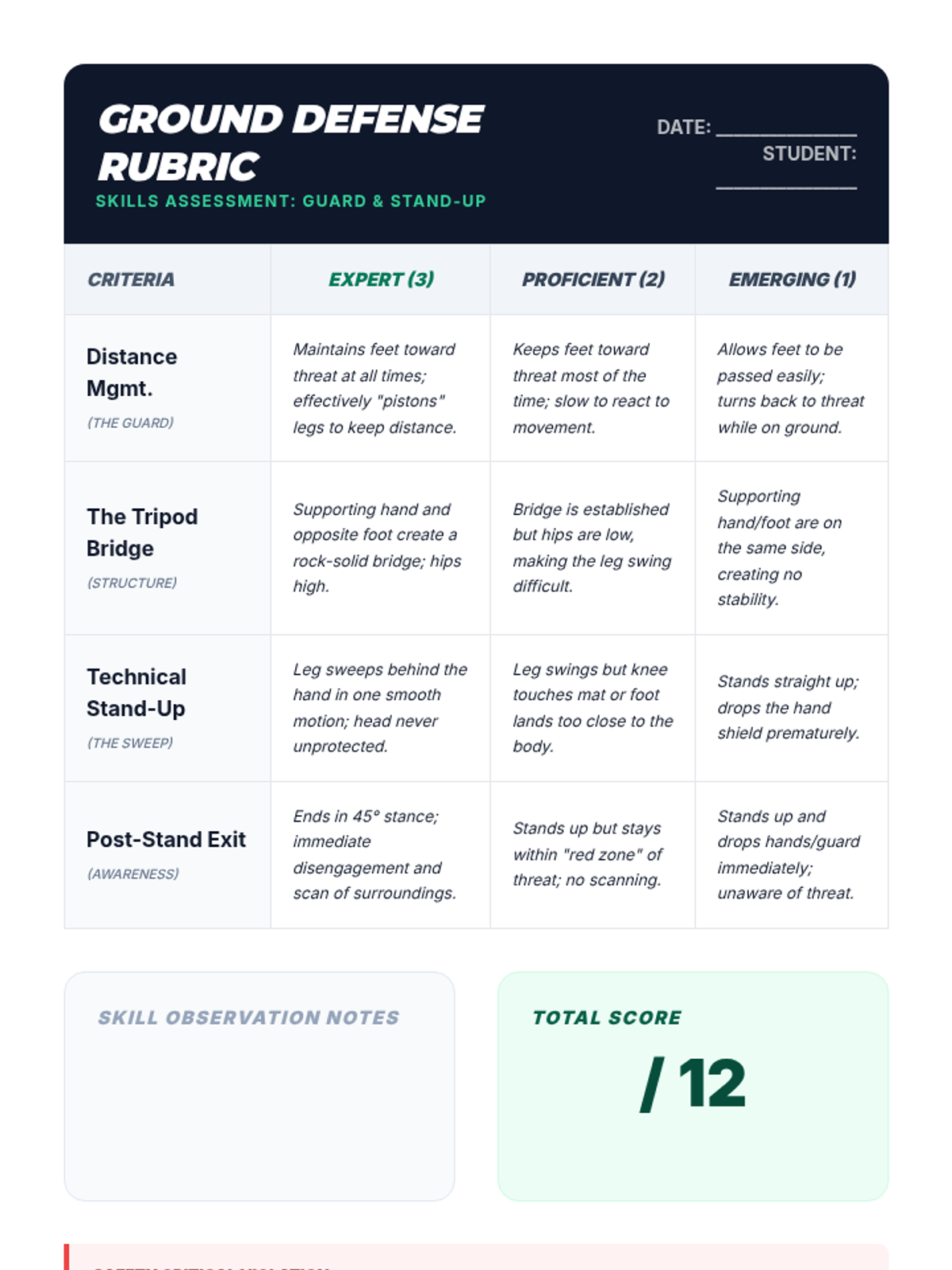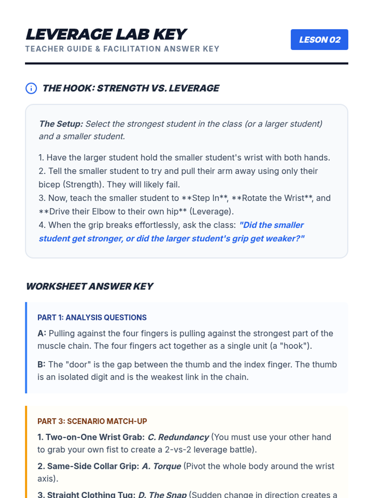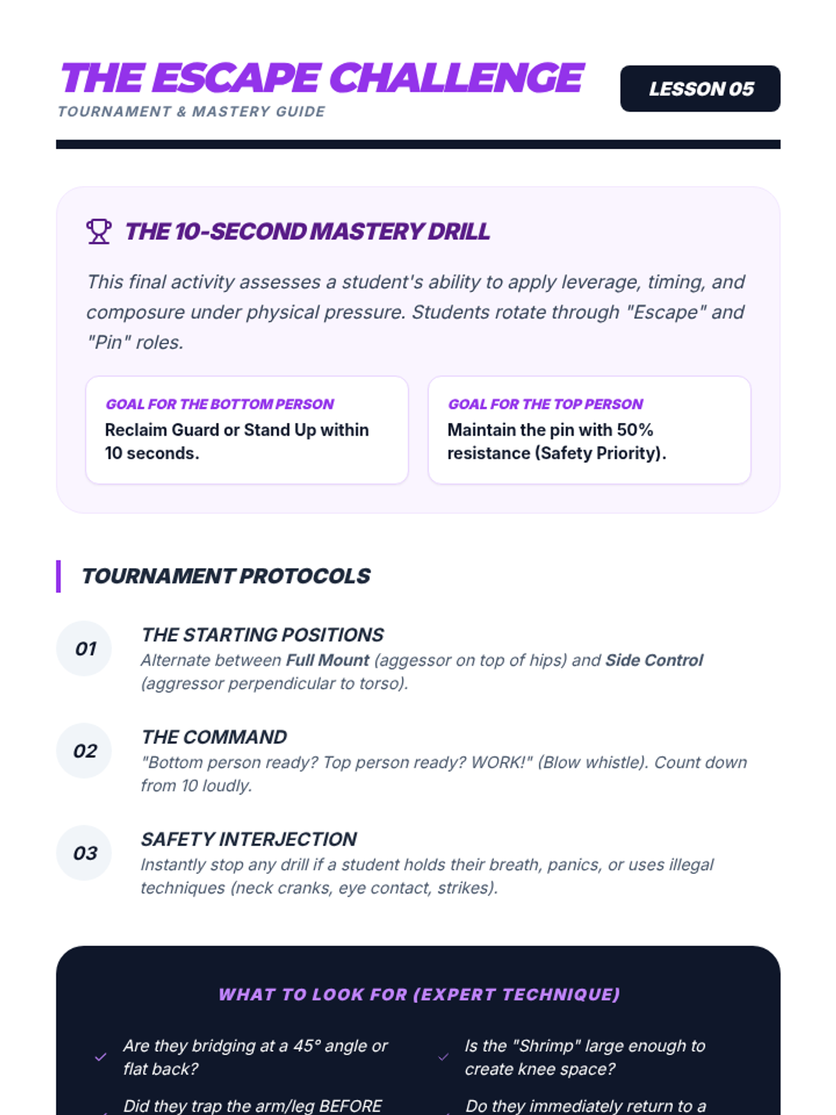 A comprehensive 12th-grade physical education sequence focused on grappling mechanics, leverage-based escapes, and defensive positioning. Students learn to apply physics principles to self-defense, progressing from foundational safety (breakfalls) to advanced ground escapes and technical stand-ups.
