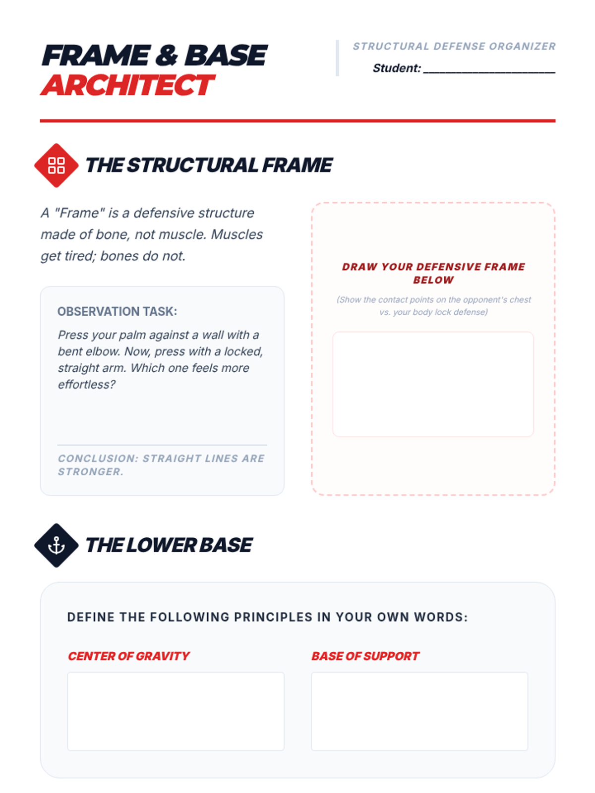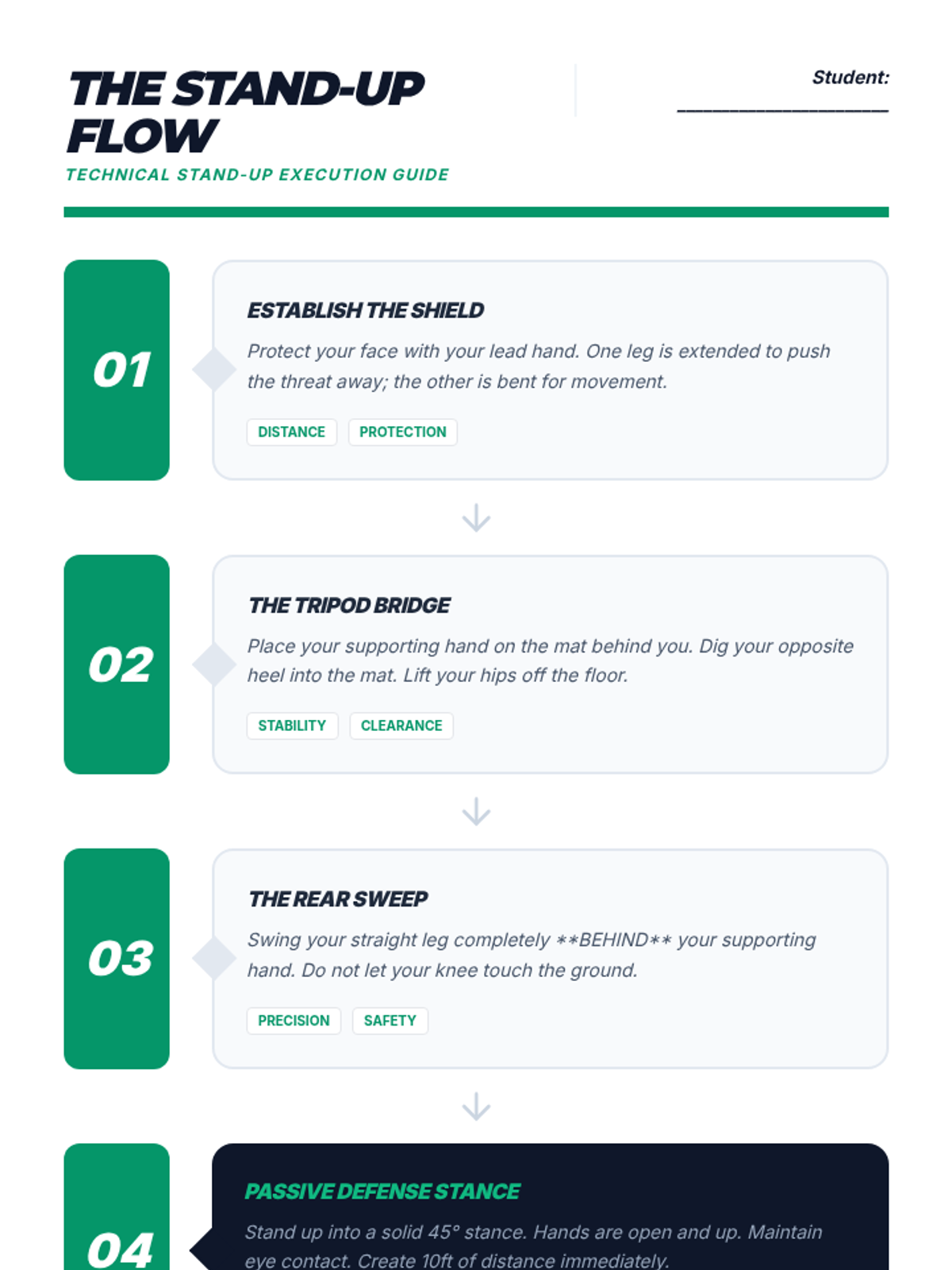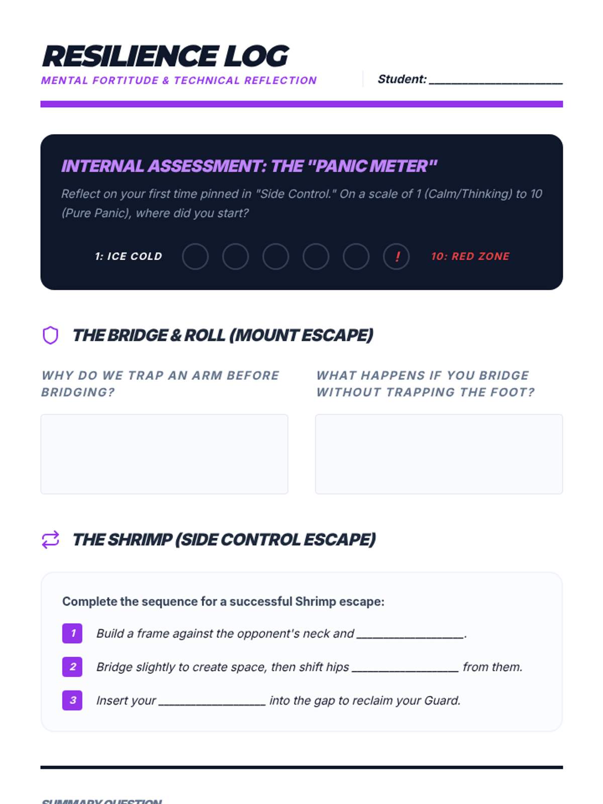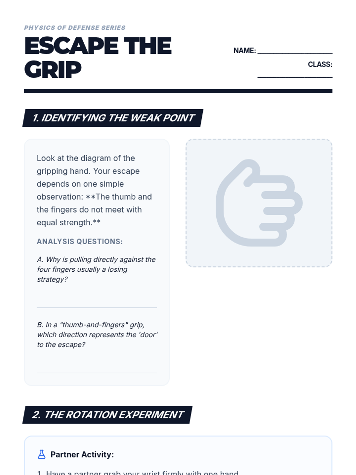 A comprehensive 12th-grade physical education sequence focused on grappling mechanics, leverage-based escapes, and defensive positioning. Students learn to apply physics principles to self-defense, progressing from foundational safety (breakfalls) to advanced ground escapes and technical stand-ups.