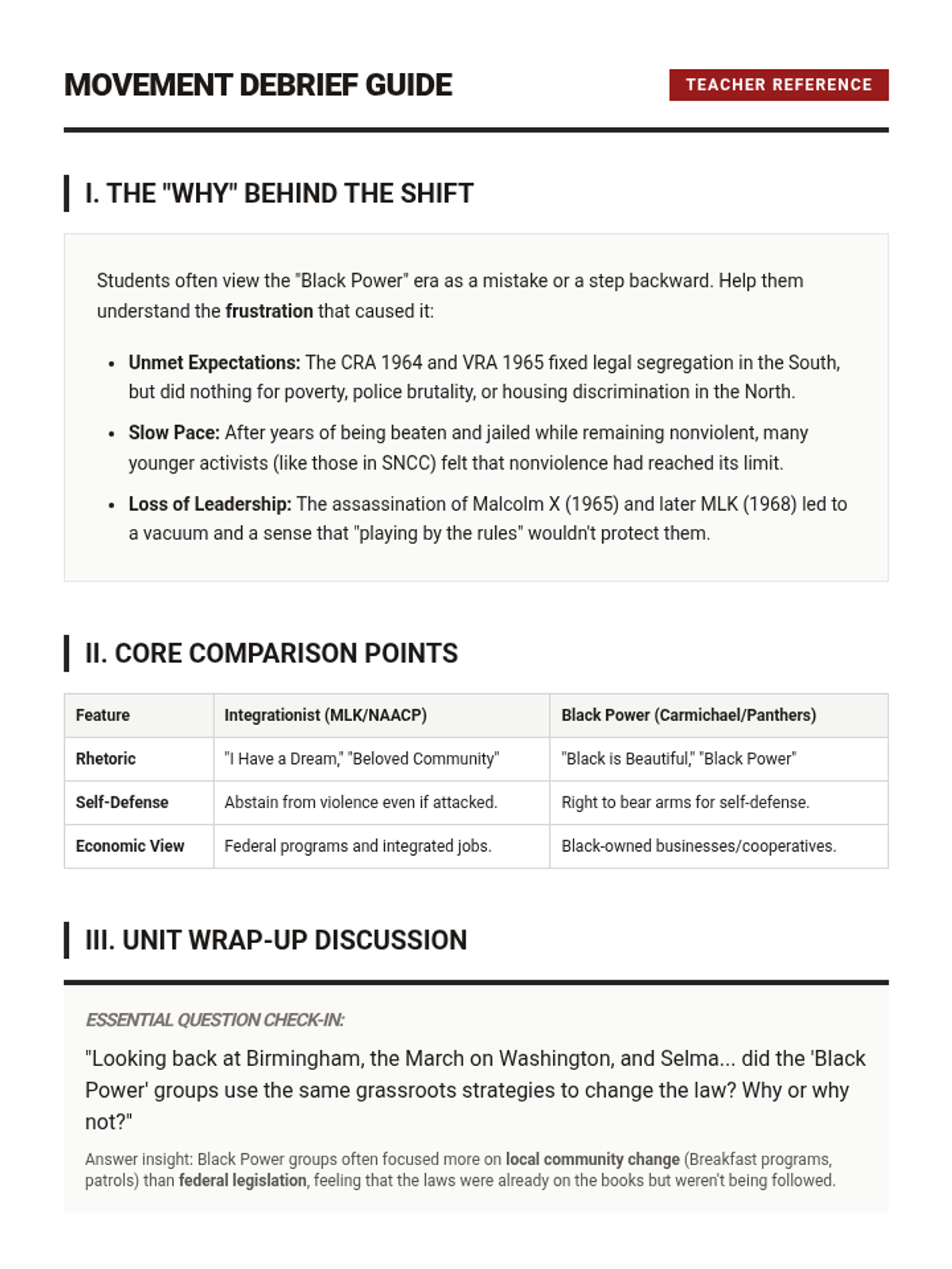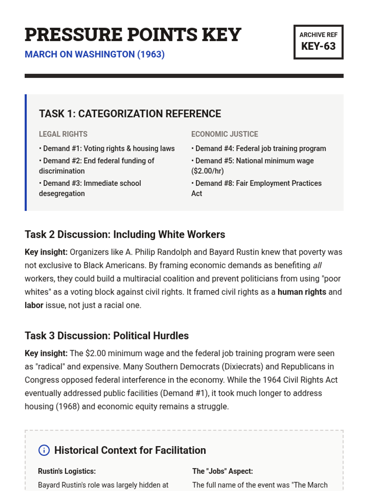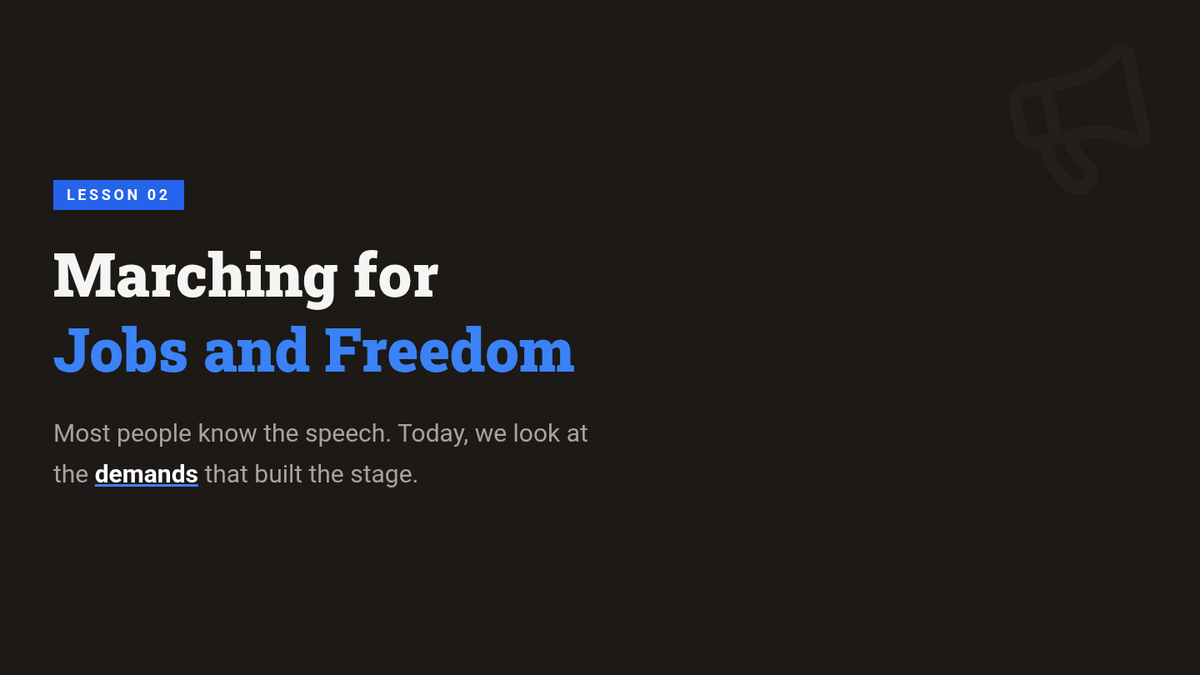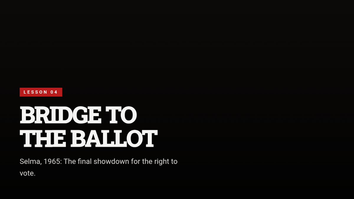 This sequence explores the strategic and legislative milestones of the Civil Rights Movement during the 1960s. Students analyze how grassroots activism in Birmingham, Washington D.C., and Selma directly influenced federal policy, culminating in the Civil Rights Act of 1964 and the Voting Rights Act of 1965, before examining the ideological shifts toward Black Power.