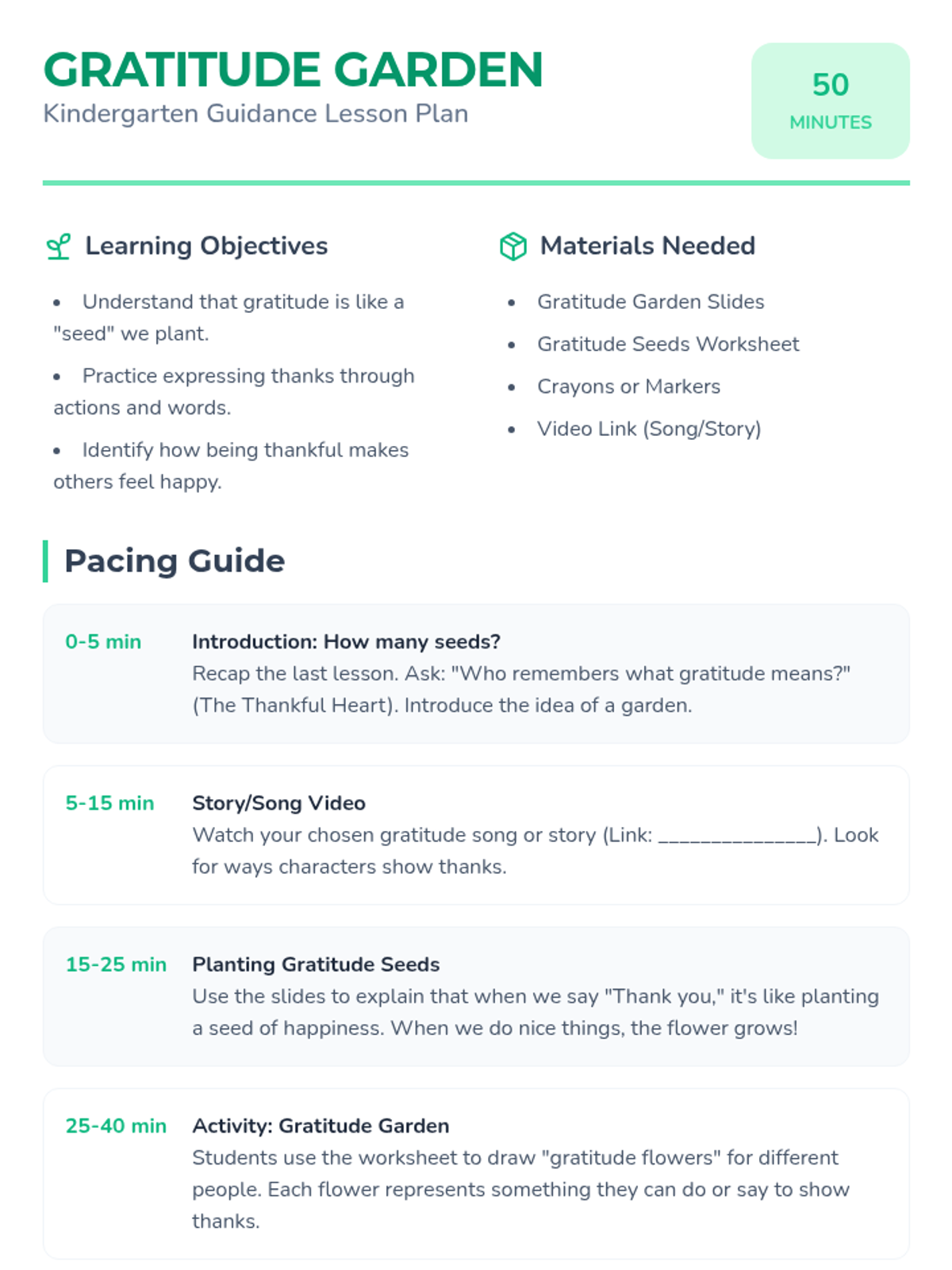 A two-lesson series for kindergarten students focusing on the concept of gratitude, identifying things they are thankful for, and practicing expressions of appreciation through creative activities.