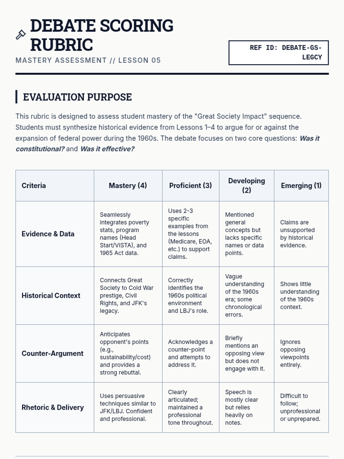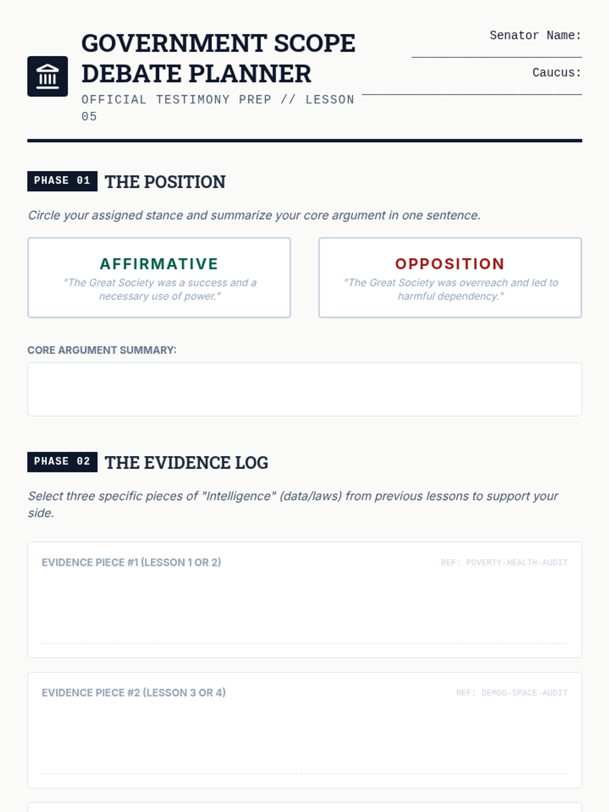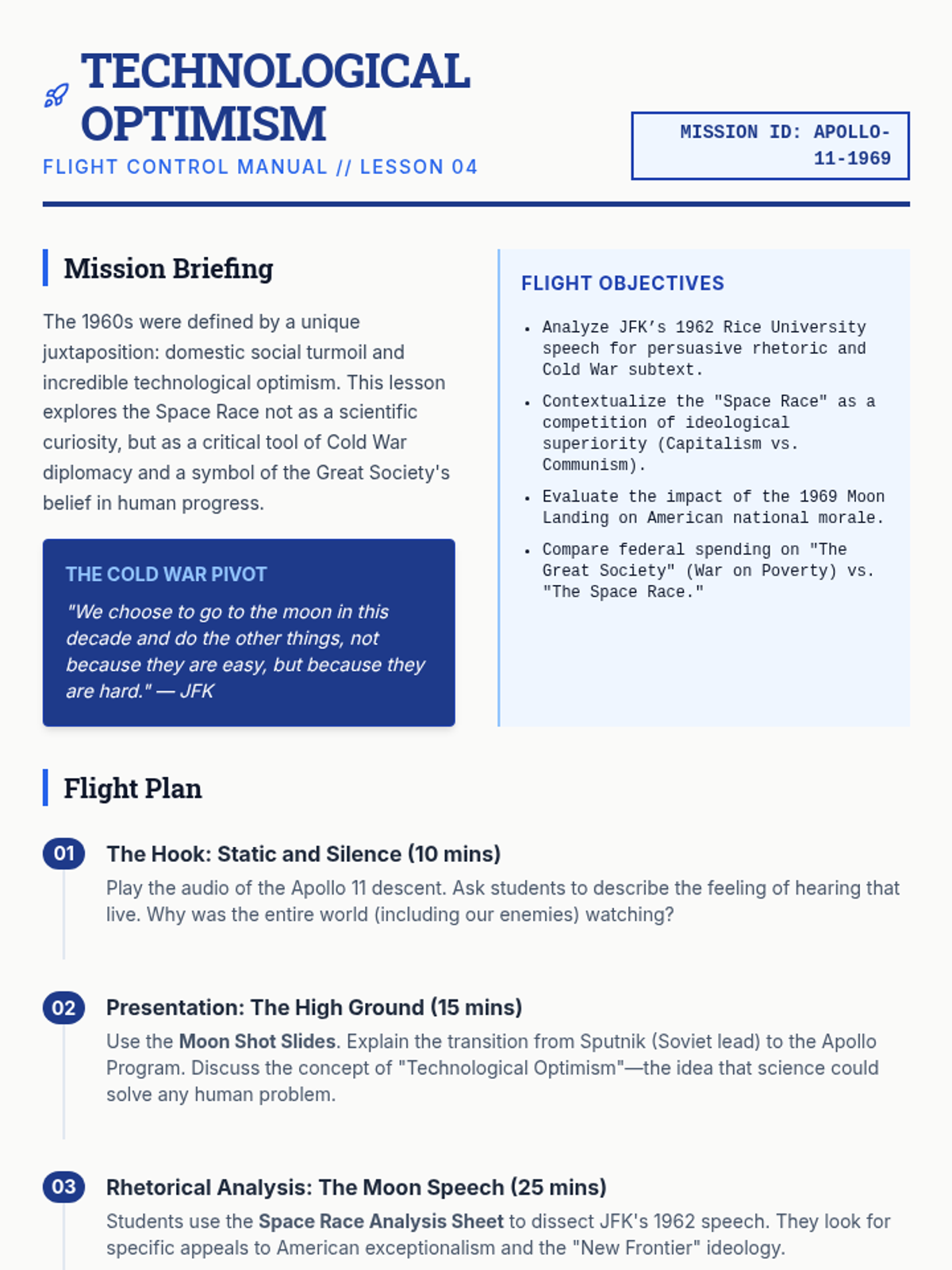 This sequence explores the massive expansion of the federal government under Lyndon B. Johnson's Great Society and the cultural optimism of the Space Race. Students assess the efficacy of social welfare programs and the role of government in scientific advancement during the 1960s.