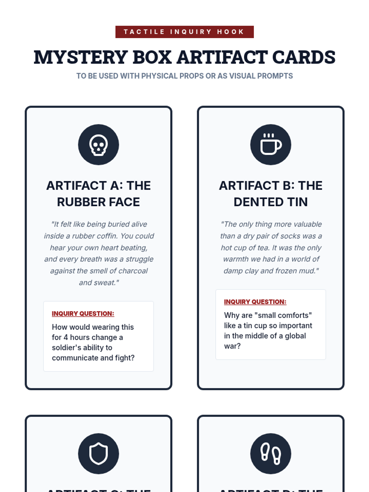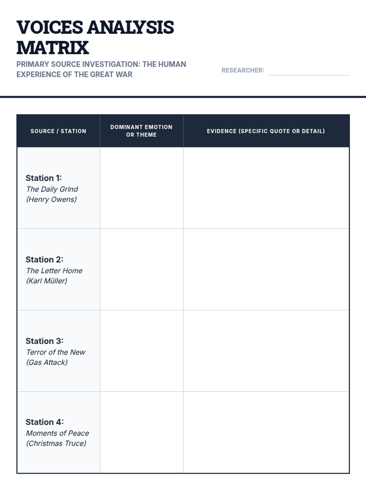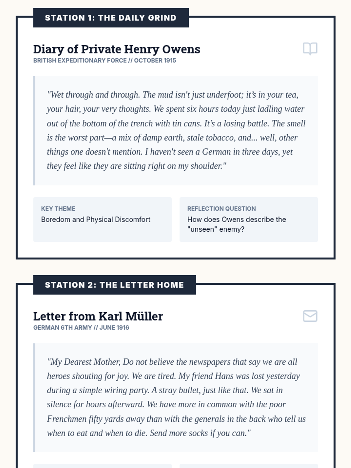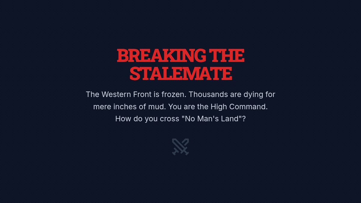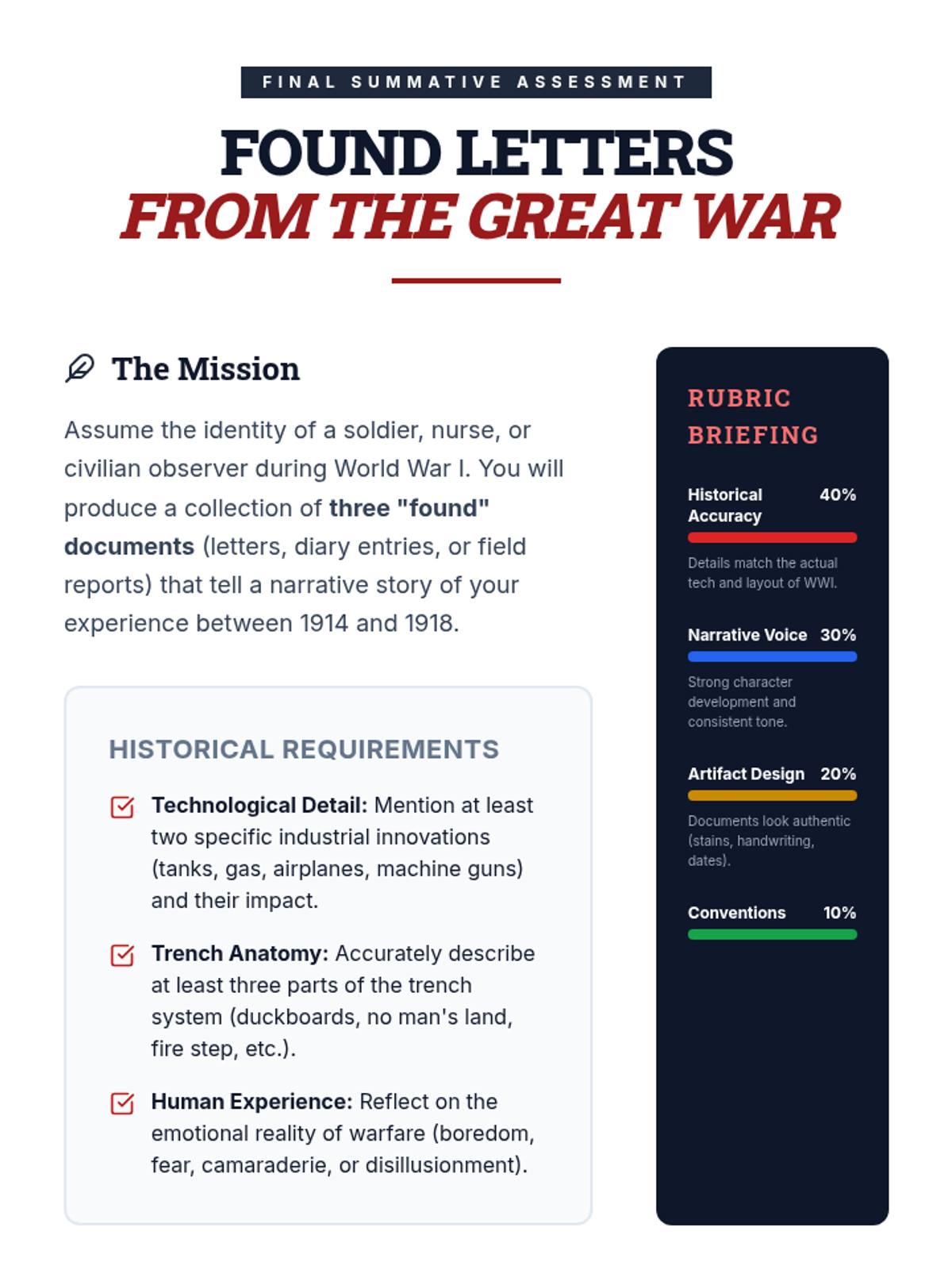 An immersive investigation into the Western Front of WWI, focusing on how industrial technology created the stalemate of trench warfare and the human impact on those who lived through it. Students move from the technical aspects of weaponry to the psychological realities of the soldiers who used them.