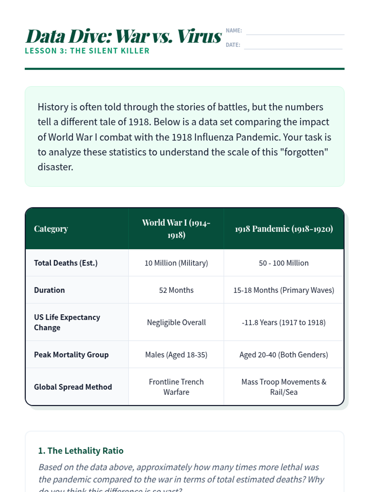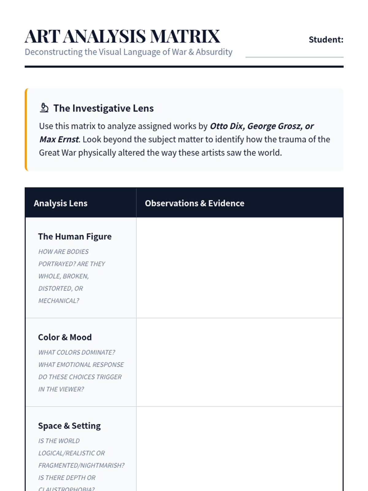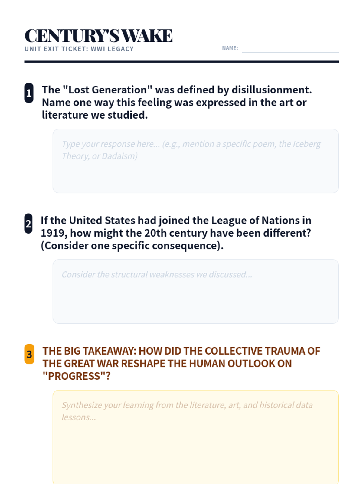 A comprehensive 12th-grade history sequence exploring the cultural, literary, and psychological impact of World War I, bridging the gap between historical events and the birth of the Modernist era.