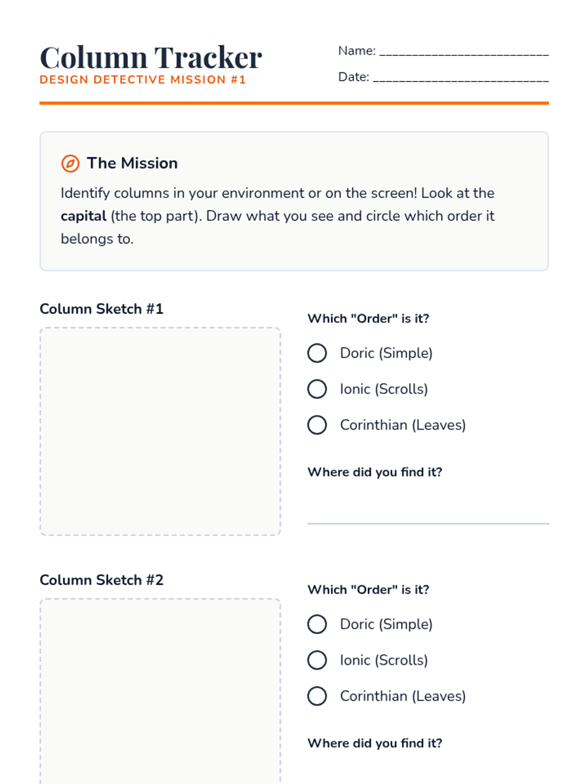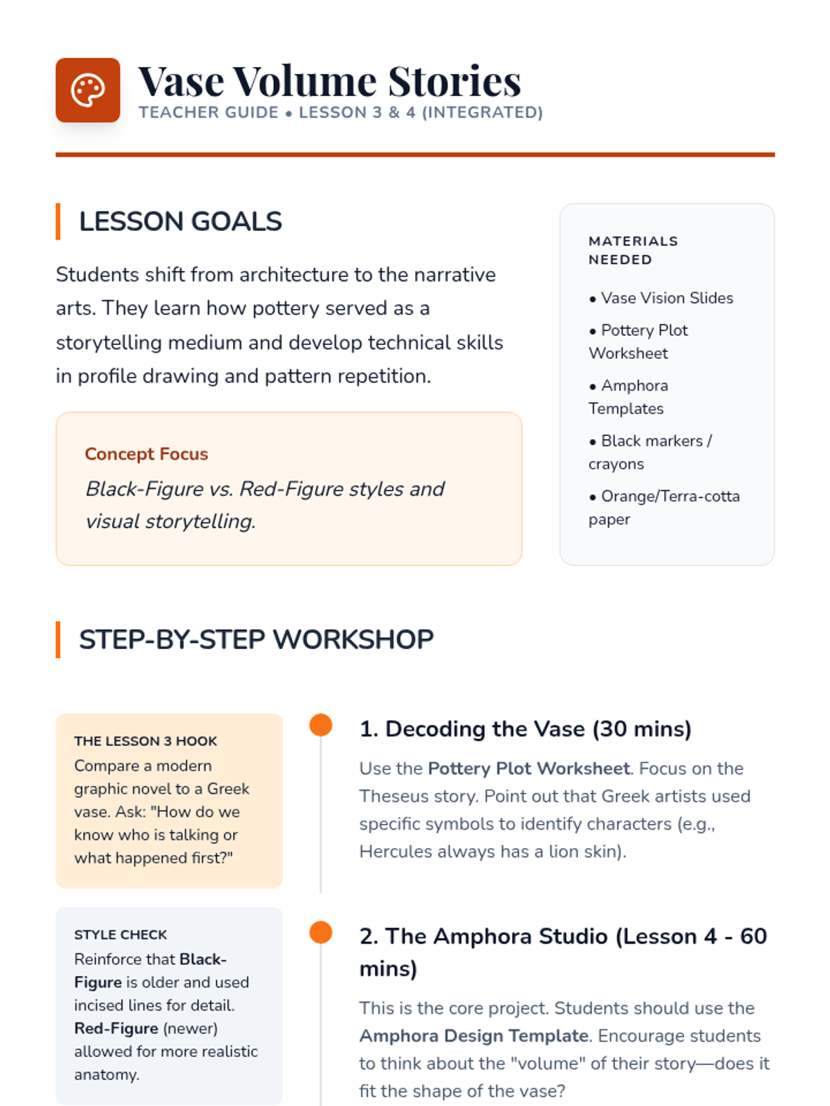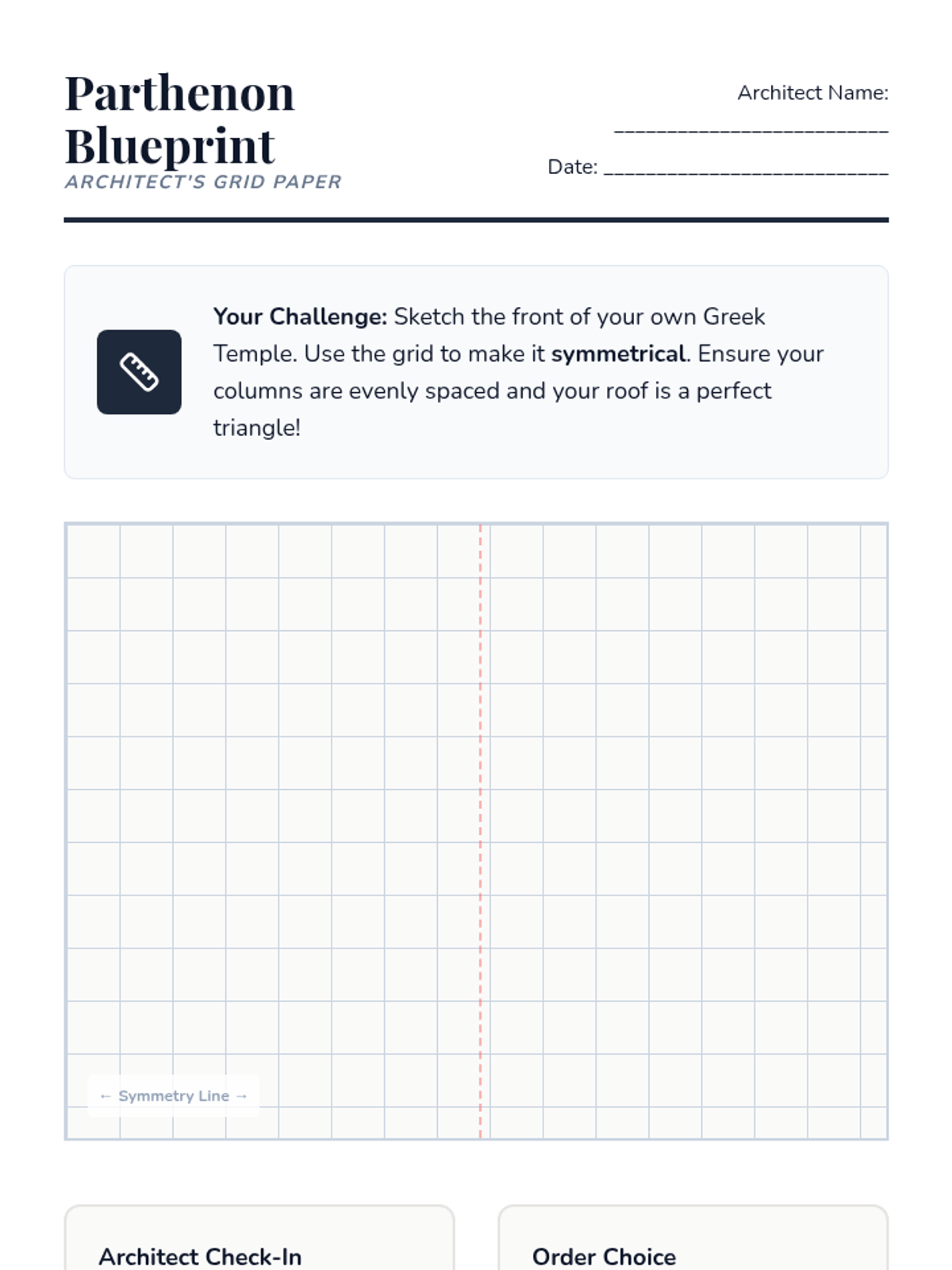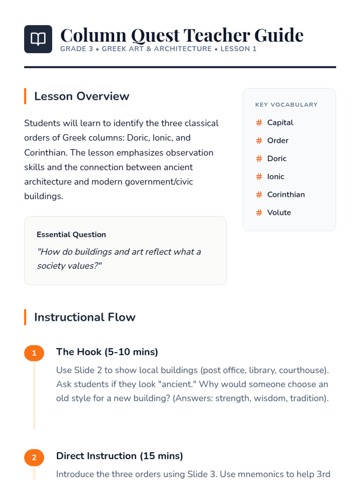 A project-based sequence for 3rd grade exploring ancient Greek architecture and art, focusing on columns, the Parthenon, and pottery storytelling. Students learn to identify architectural orders and create their own Greek-inspired designs.